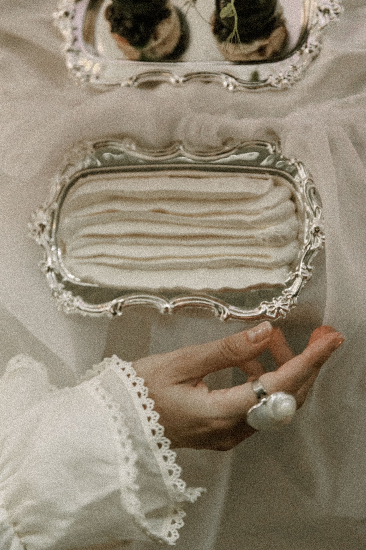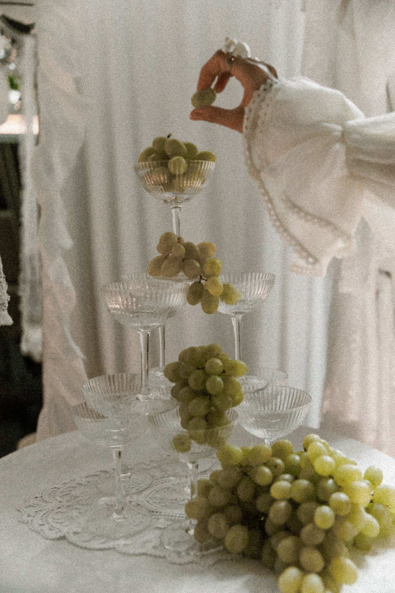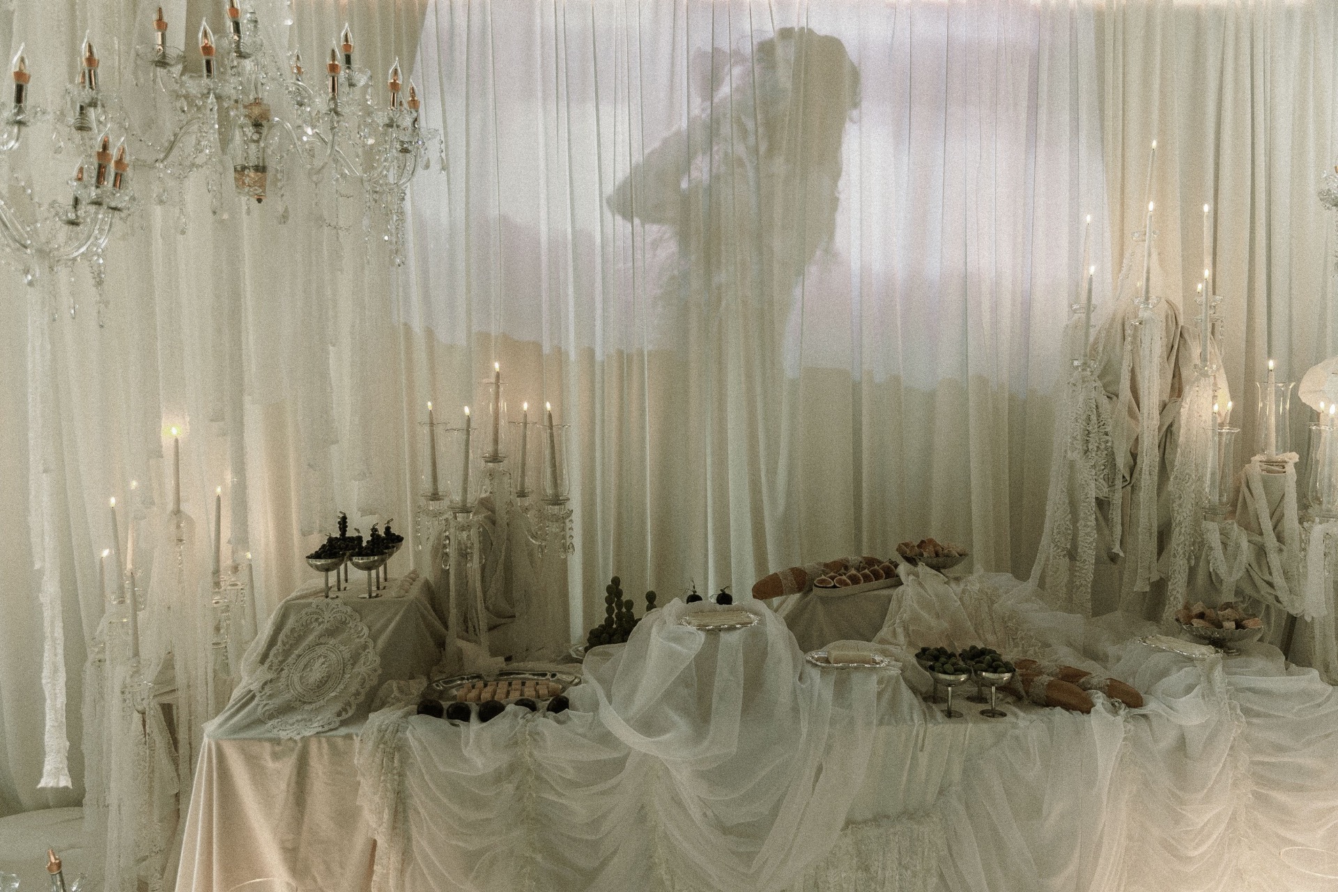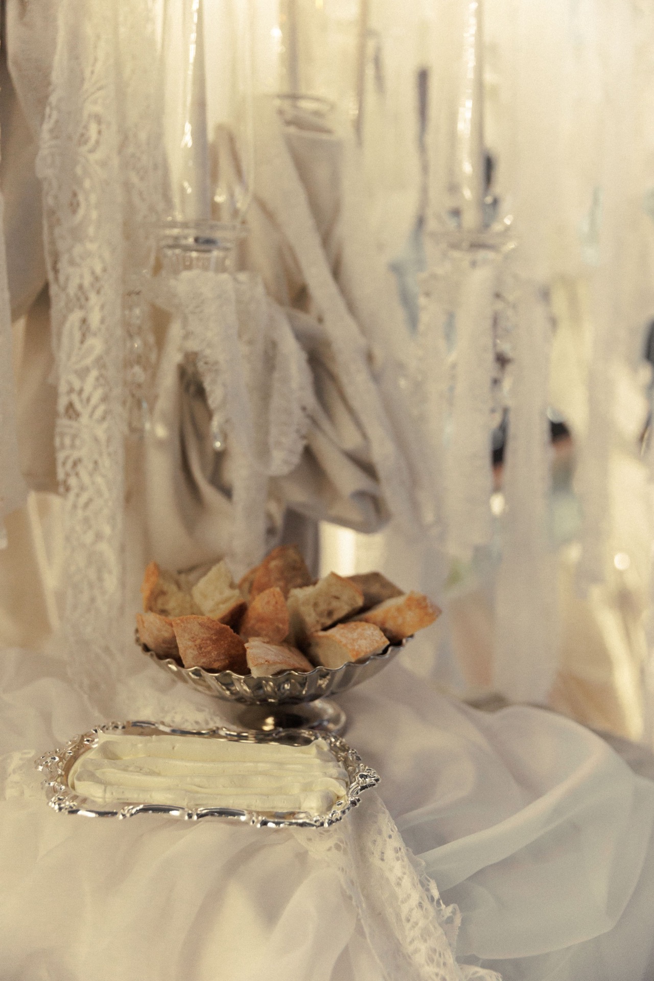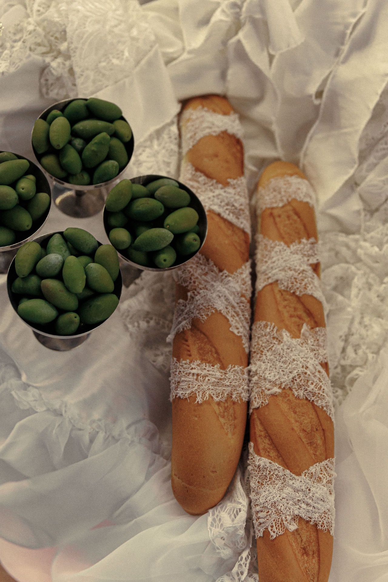 Необычными акцентами в антураже стали зелёные оливки и кисти винограда, которые эффектно выделялись на фоне белых и бежевых тканей, а также кружево и хлебные багеты.