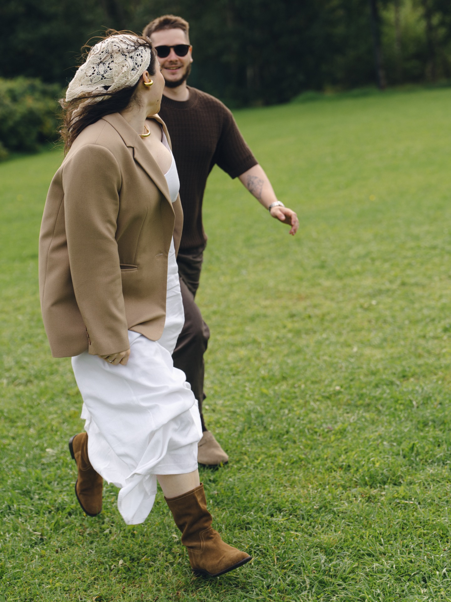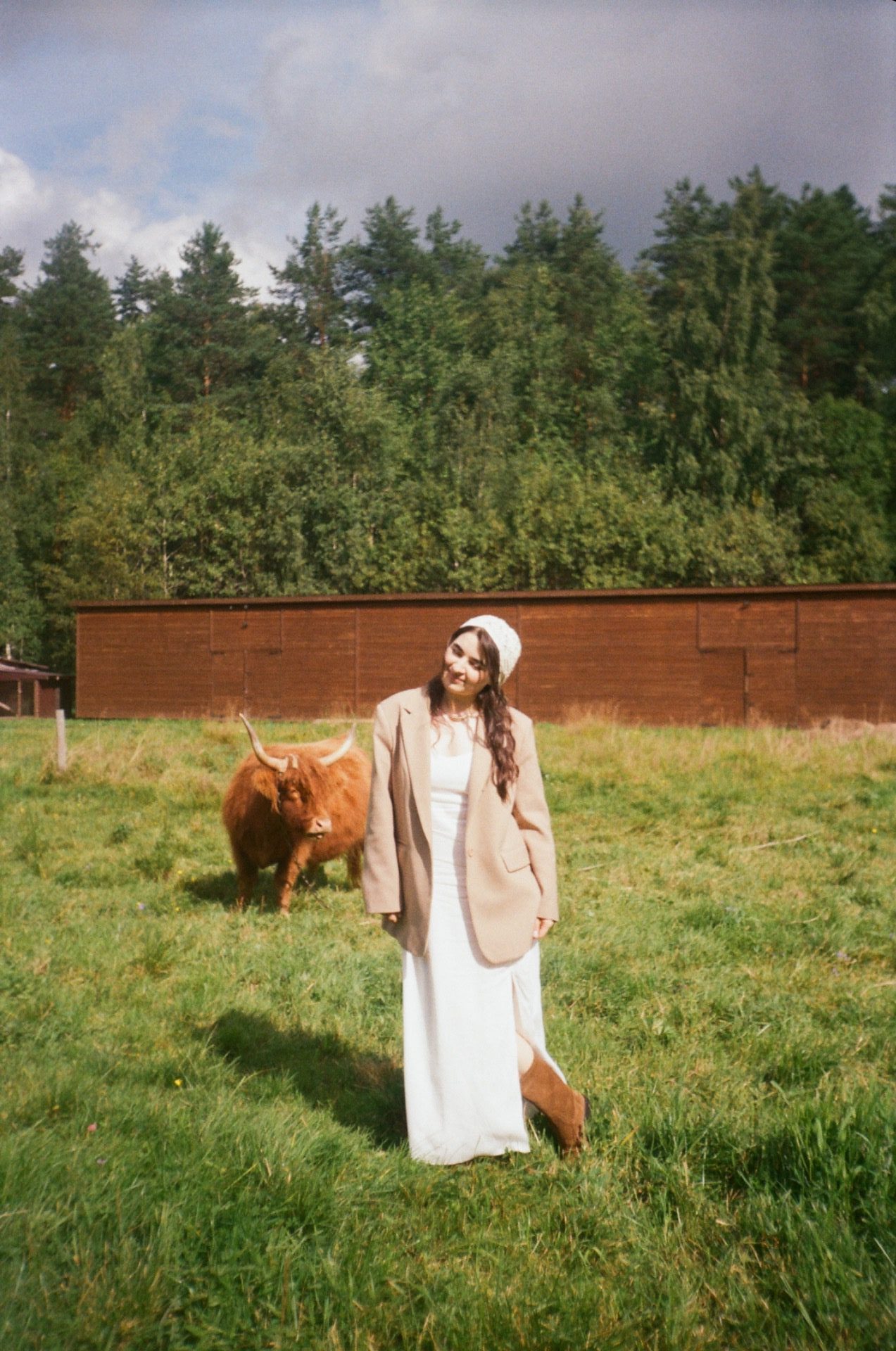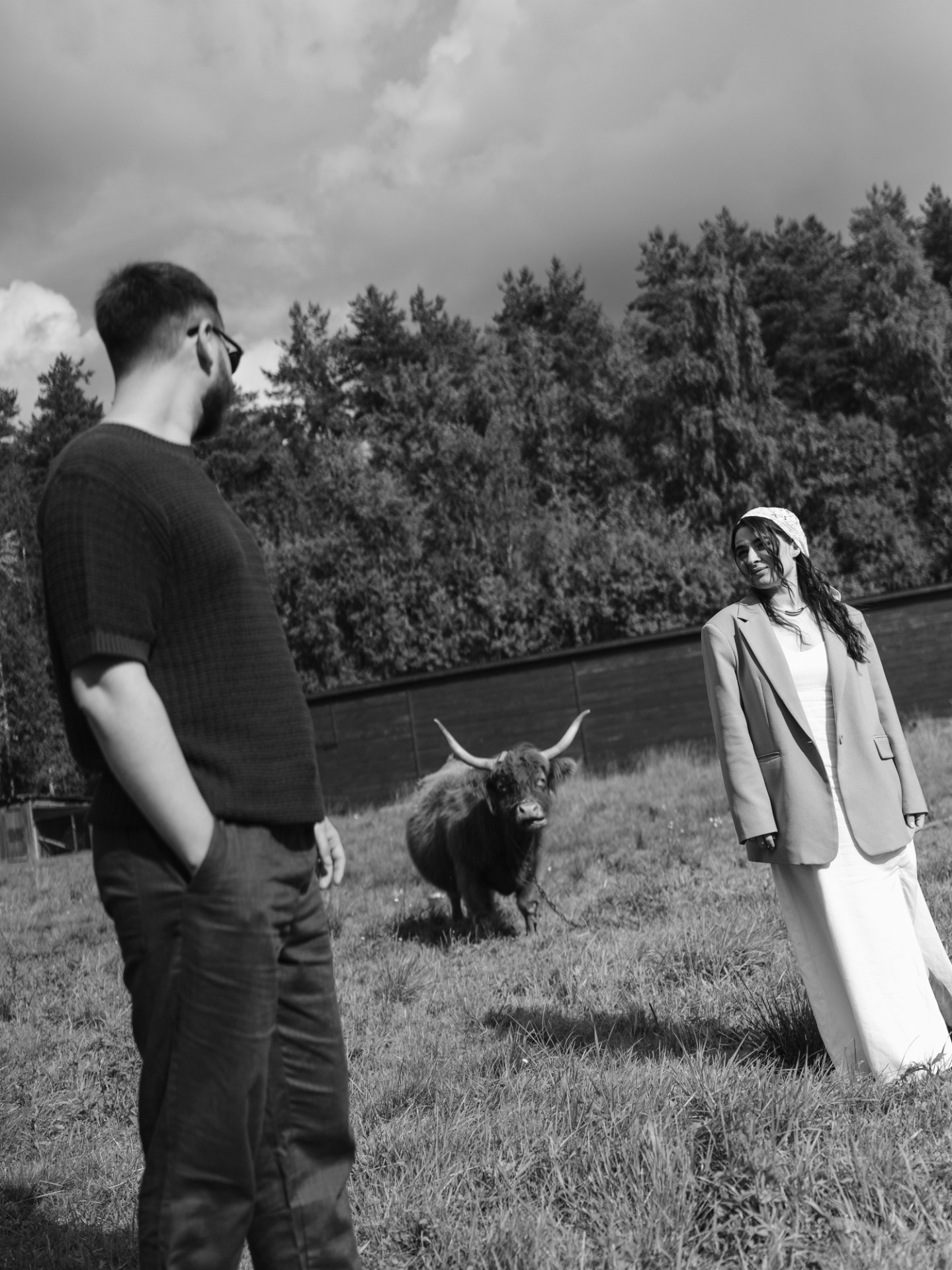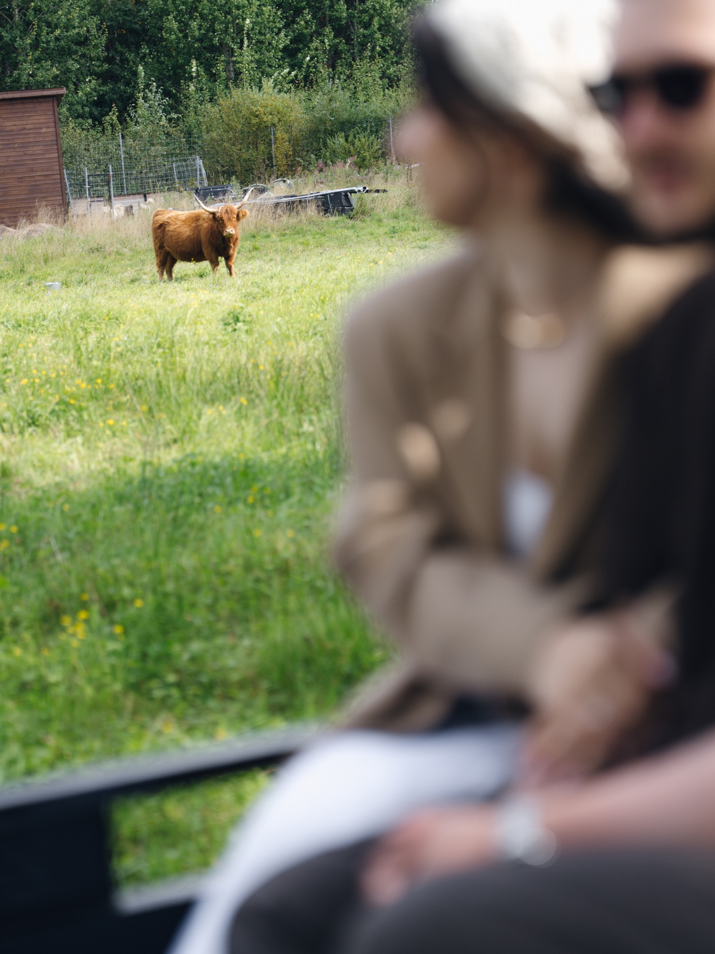 Свадебное утро началось с пикника на зелёной лужайке в расслабленных образах, как мы мечтали. Недалеко от нас паслись «волосатые» коровы, и команда предложила провести необычную фотосессию рядом с ними.