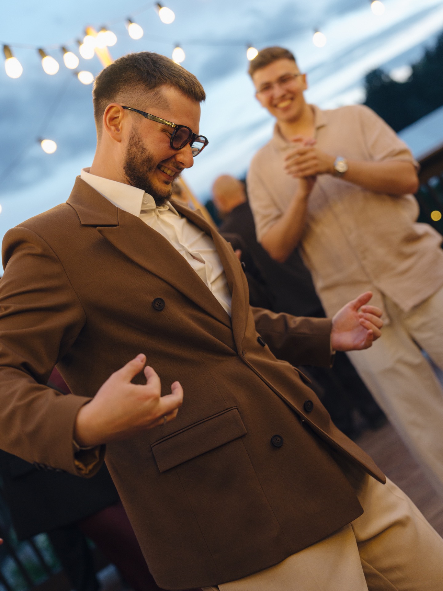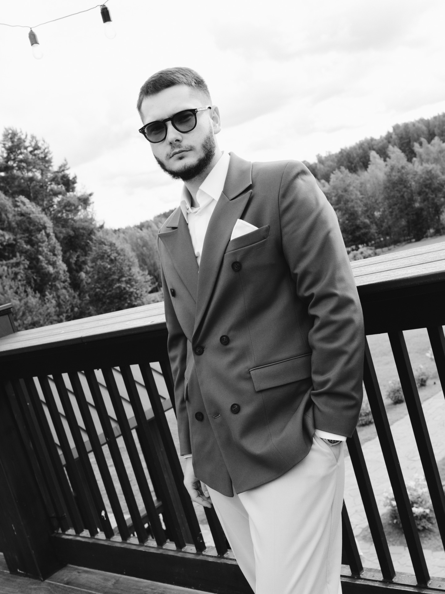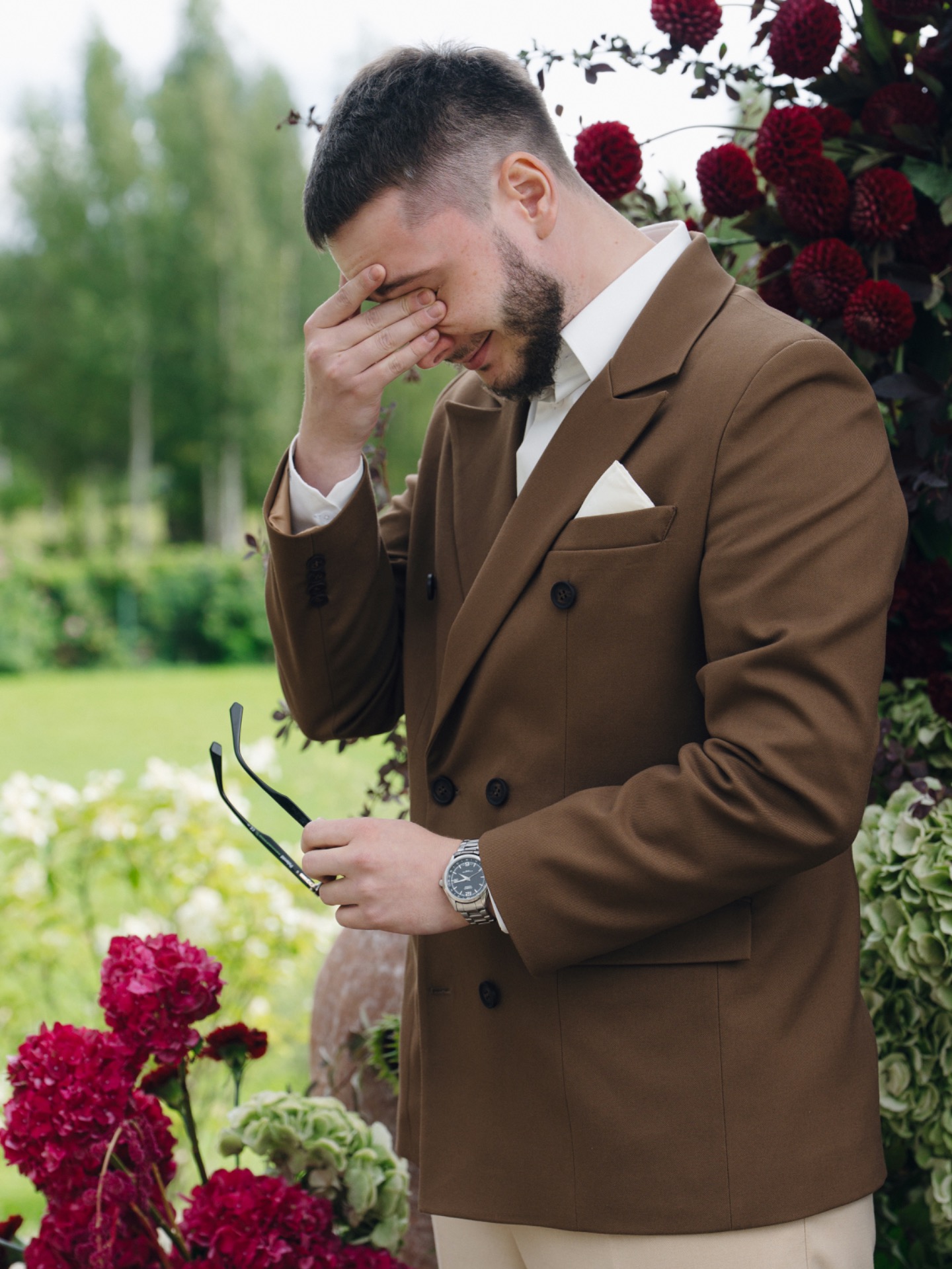 Кирилл изначально видел в своём образе двубортный костюм, но хотел отойти от классических чёрного и белого цветов. Так нам совместно пришла идея с коричневым пиджаком и бежевыми брюками, которые было решено сшить на заказ в мастерской Артёма Мидды. Рубашку мы также сделали на заказ, украсив её акцентной красной вышивкой с нашими инициалами и датой на манжете.