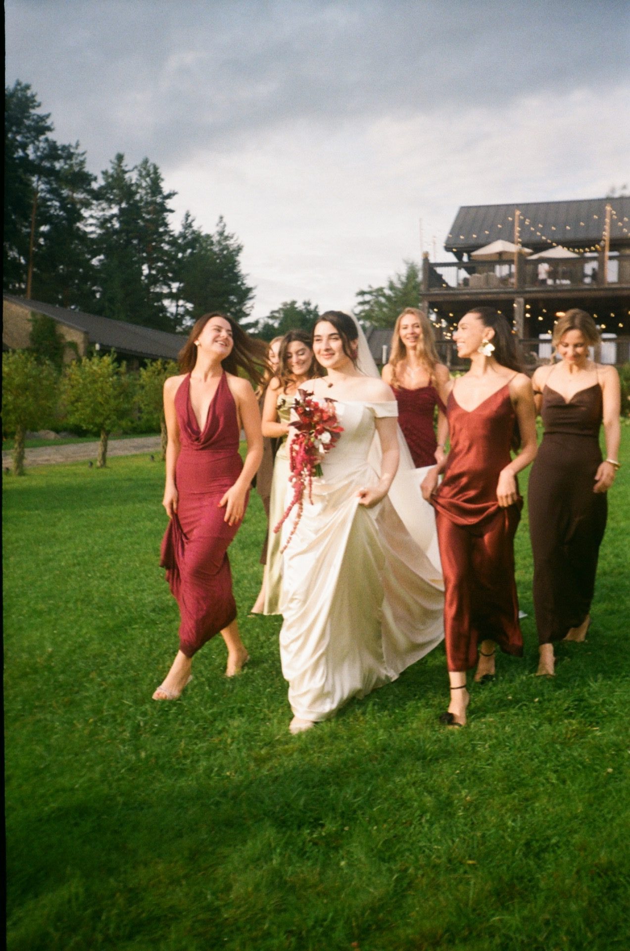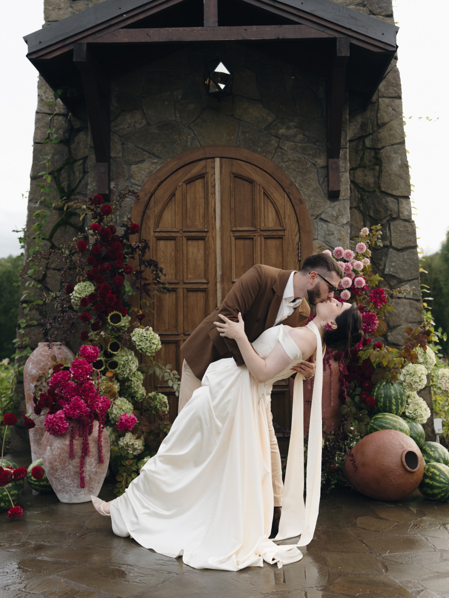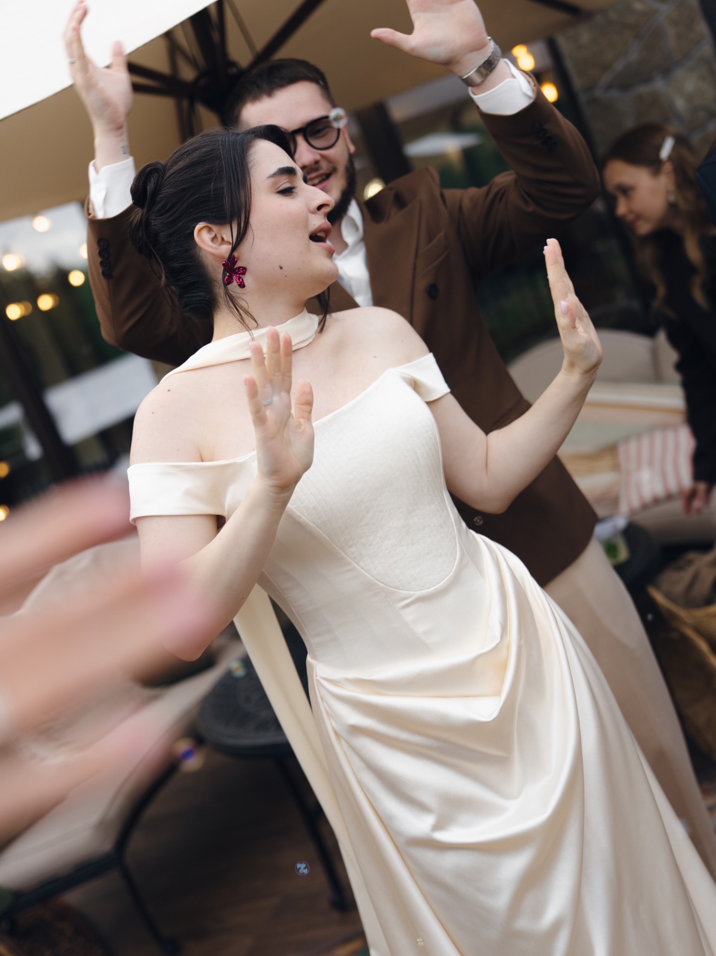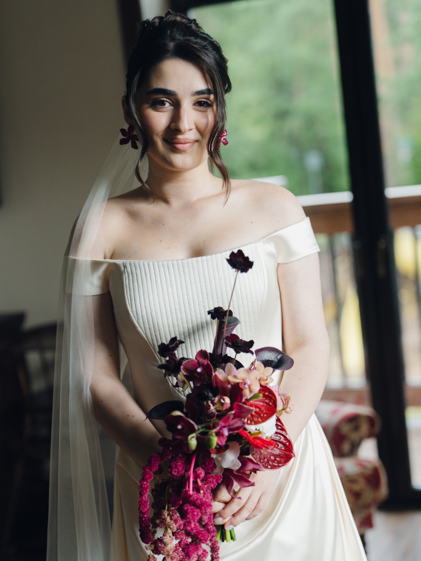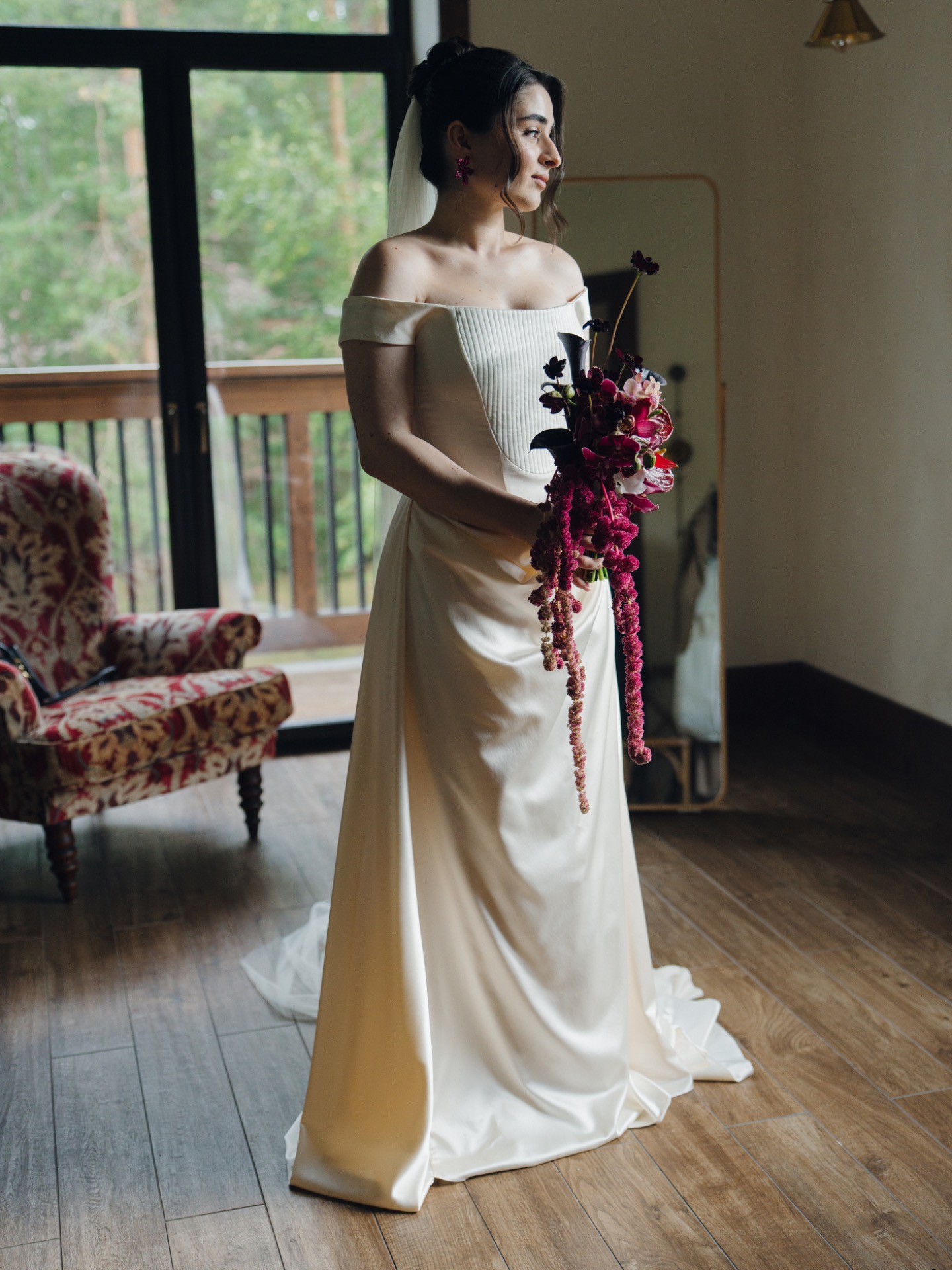 Вместе мы собрали атласную юбку нежно-сливочного цвета с объёмными складками, а корсет со спущенными рукавами украшала необычная выточка, с которой пришлось непросто, но это того стоило! В дополнение к платью мы сделали атласный шарфик, на который я сменила фату после свадебной церемонии. А весь образ завершили массивные бордовые серьги в виде цветов. Ни в чём другом в этот день я себя не могла бы и представить!