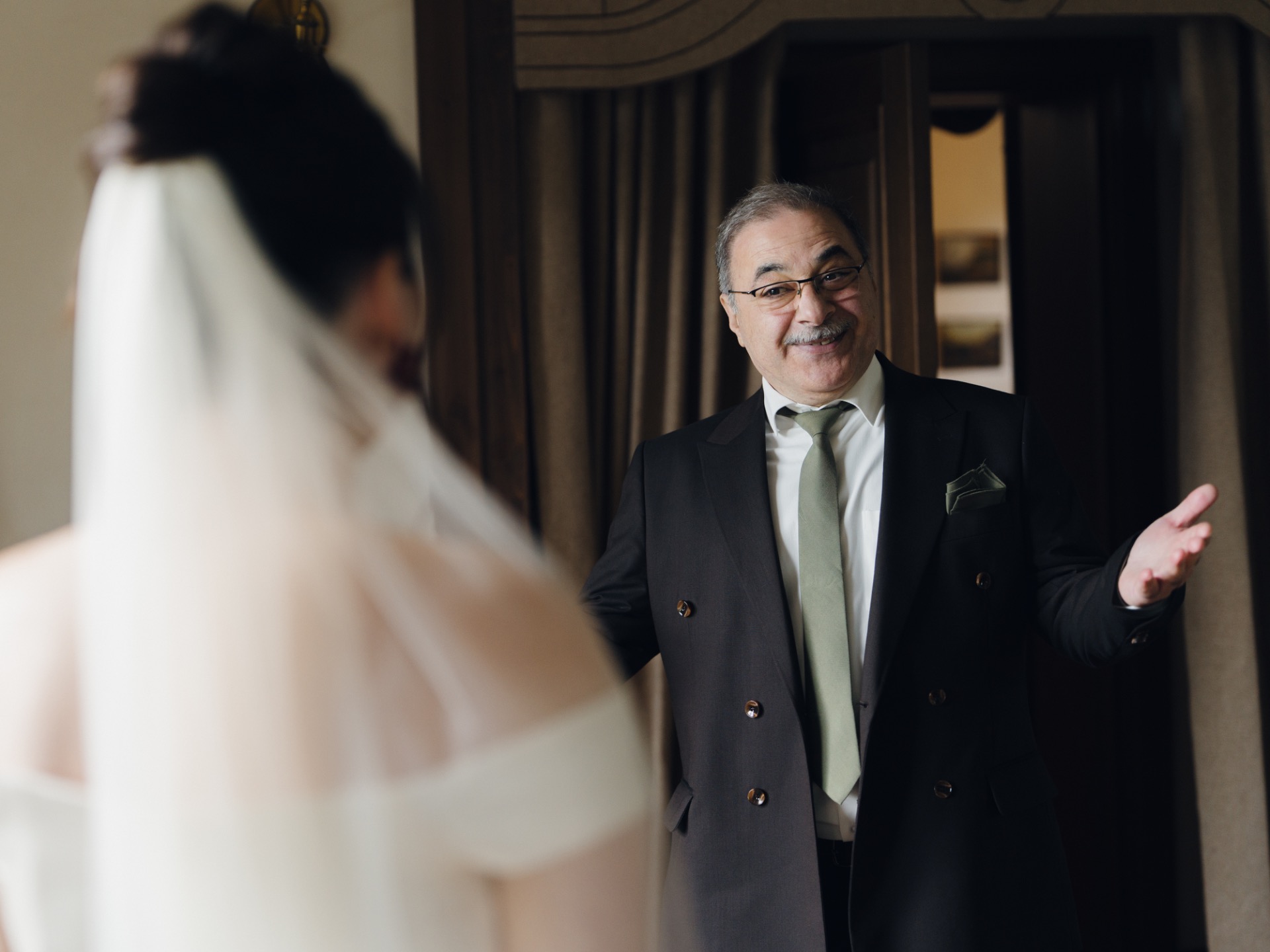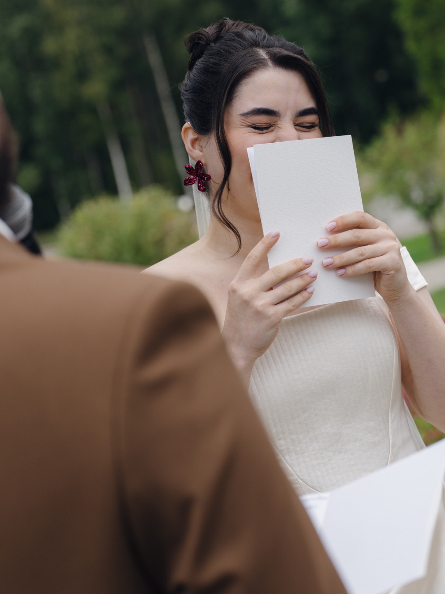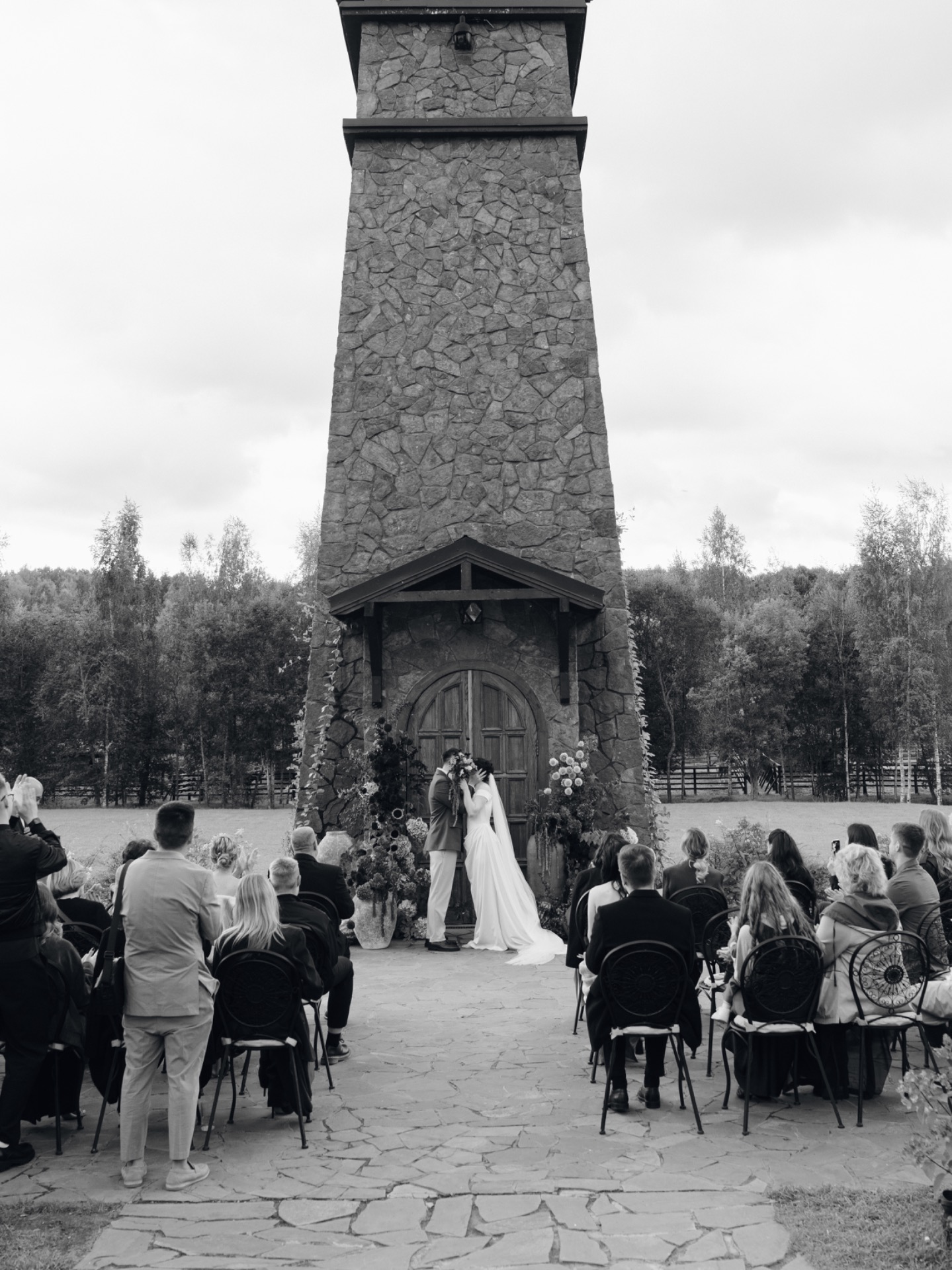 Самым трогательным моментом стала свадебная церемония у башни: ведущий Сима подготовил для гостей театральные программки, где каждое действие отражало этапы развития наших отношений — с юности и до свадебного дня. А мы вместе с папой выходили к зоне церемонии под нашу любимую песню!