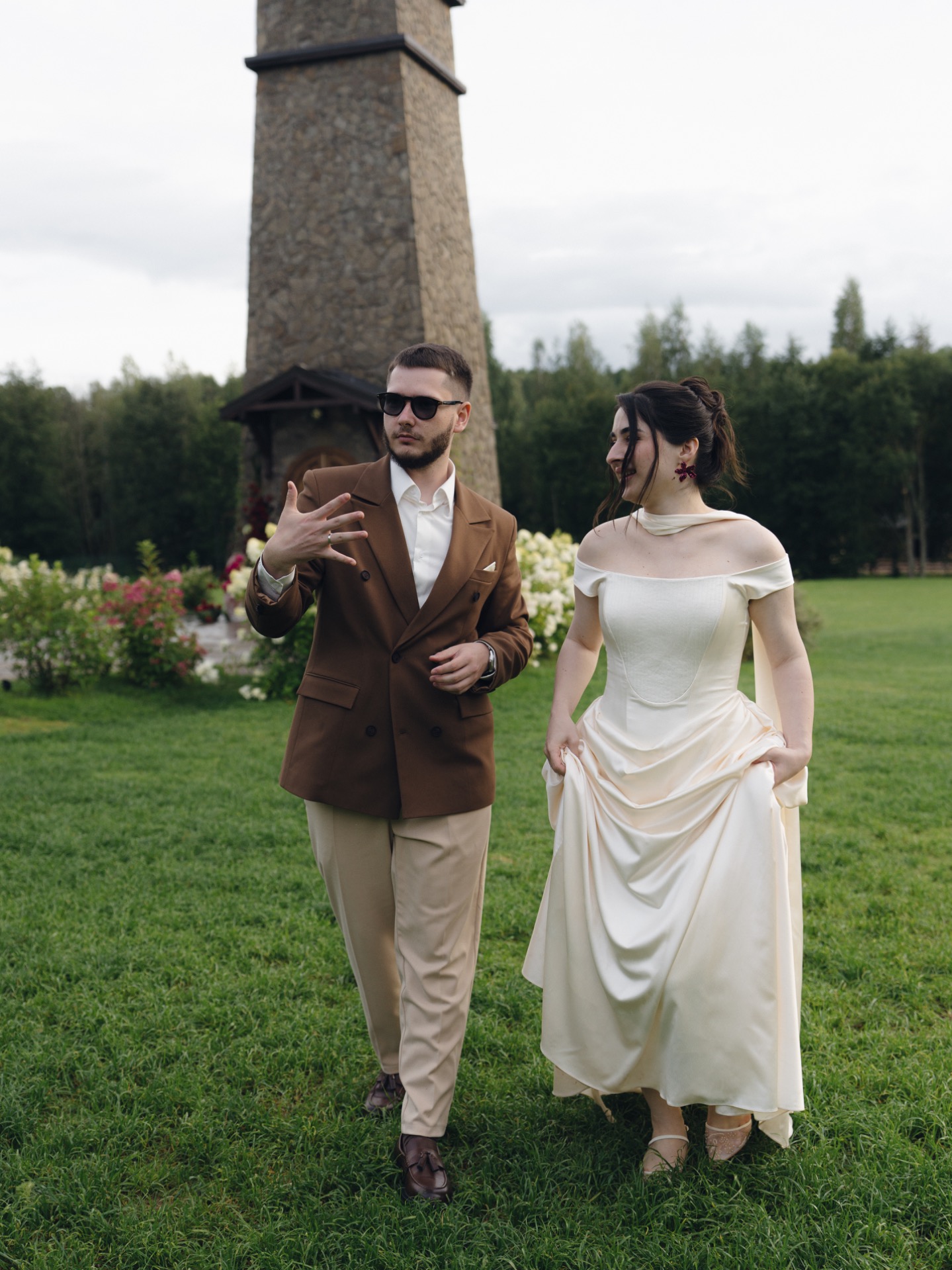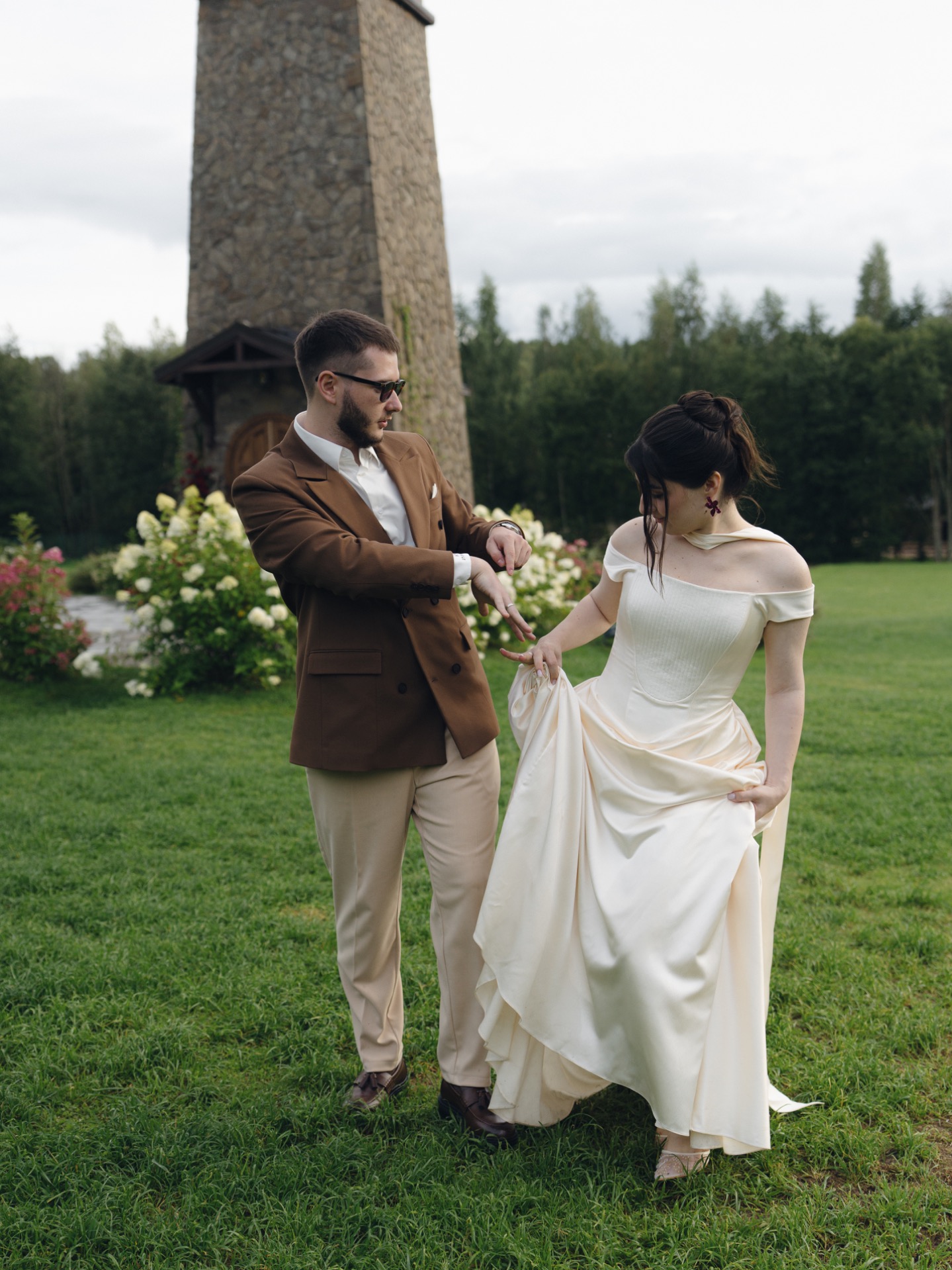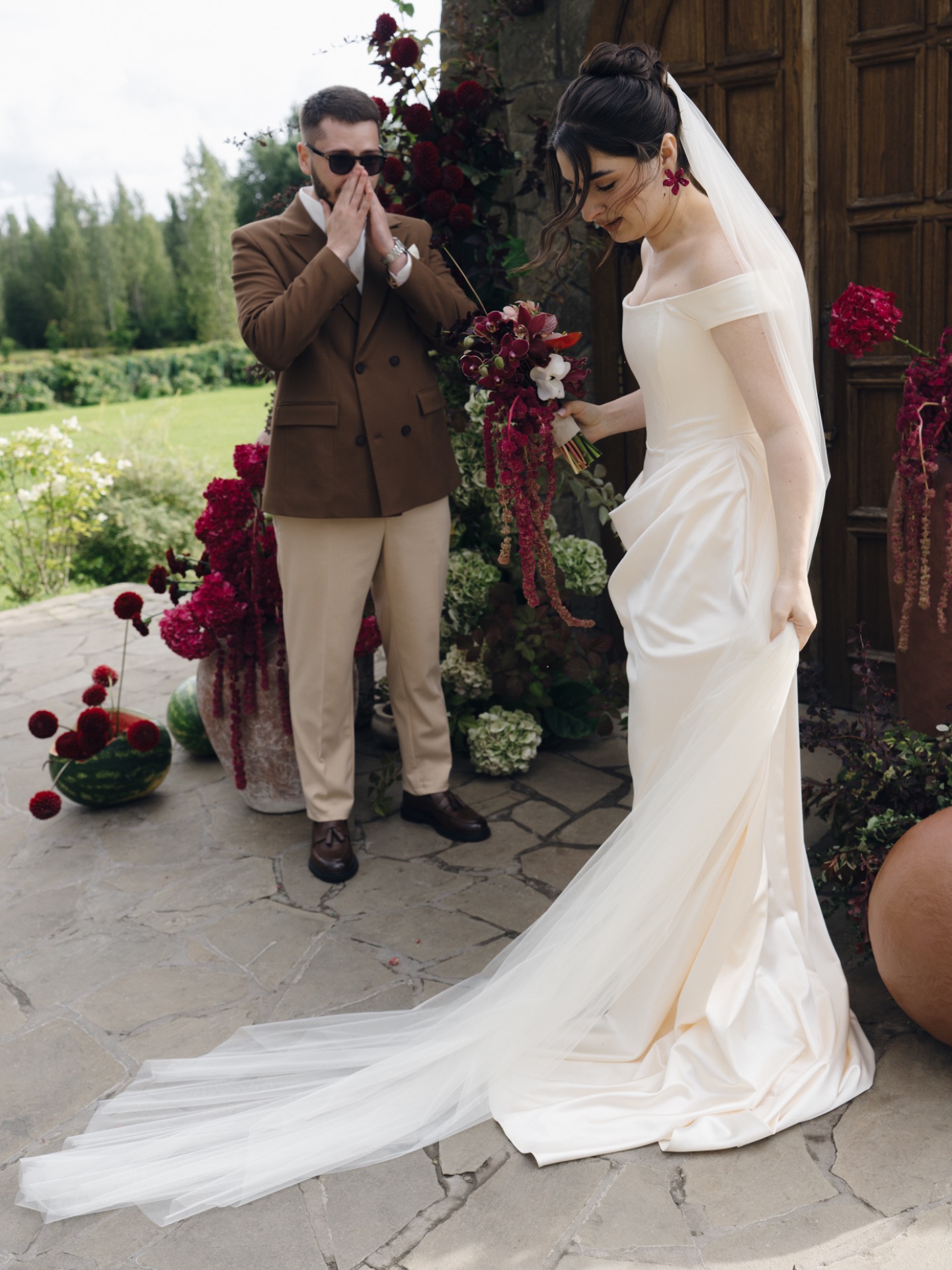 С моим платьем всё получилось сложнее. Я не представляла, каким оно должно быть, ходила по свадебным салонам Петербурга, но всё казалось не тем. Тогда Таня и Яна предложили сшить свадебное платье на заказ у дизайнера Анастасии Скоковой. И это было 100% попадание, мы сделали платье моей мечты!