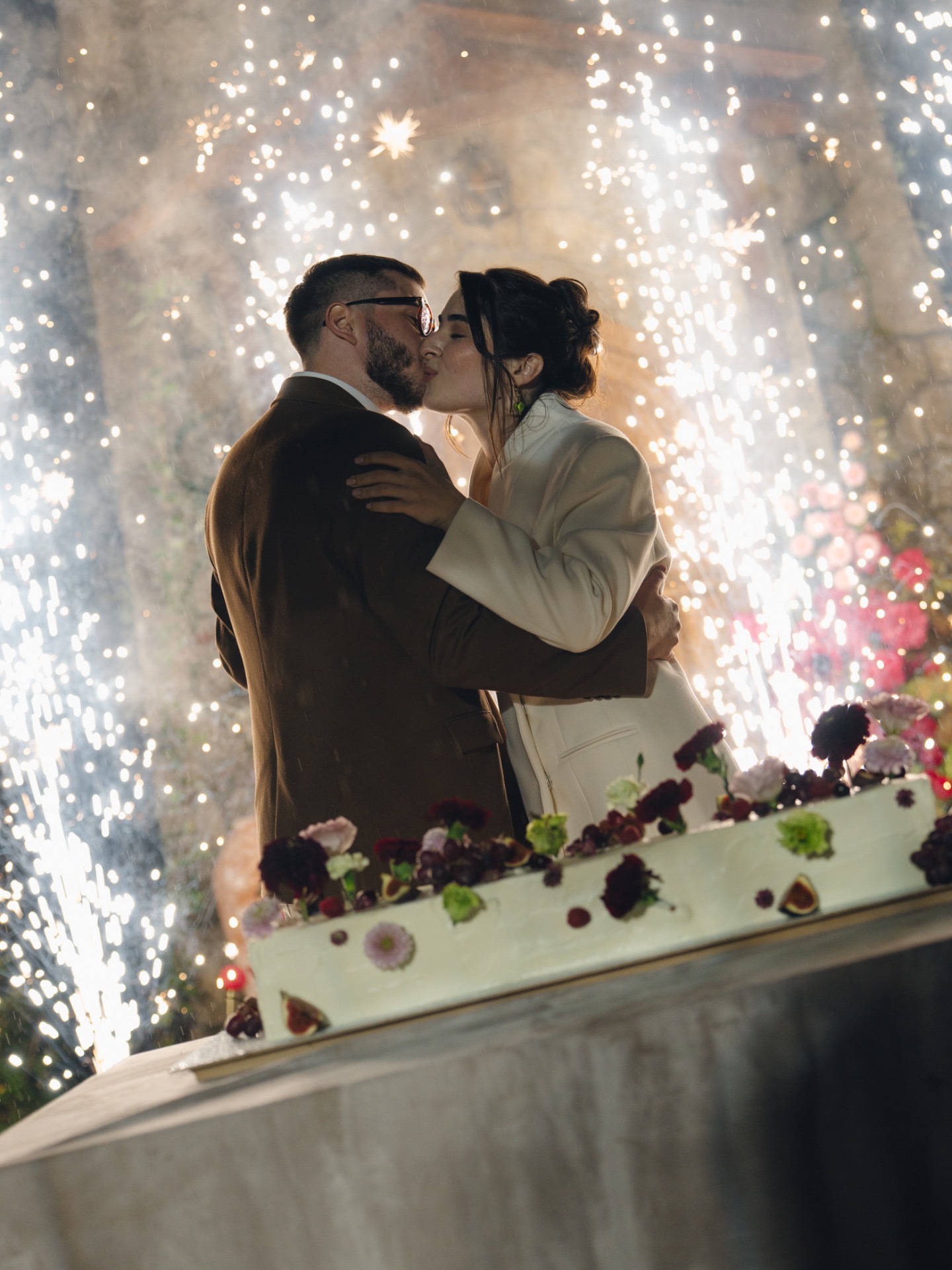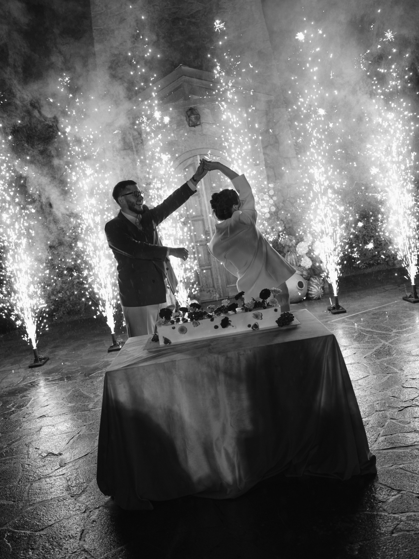 В финале вечера был длинный свадебный торт, который мы одновременно укусили, дополнив этот яркий момент холодными фонтанами.
