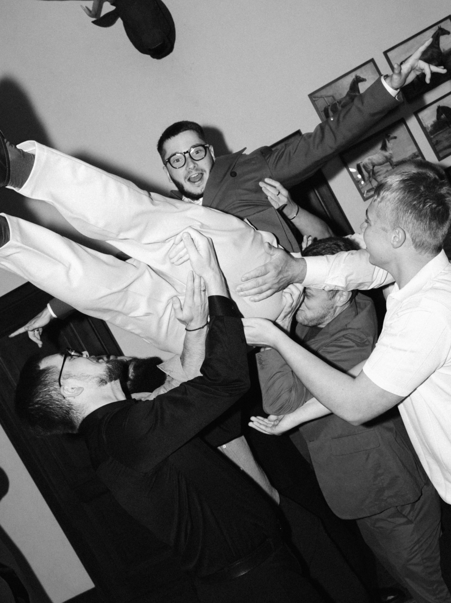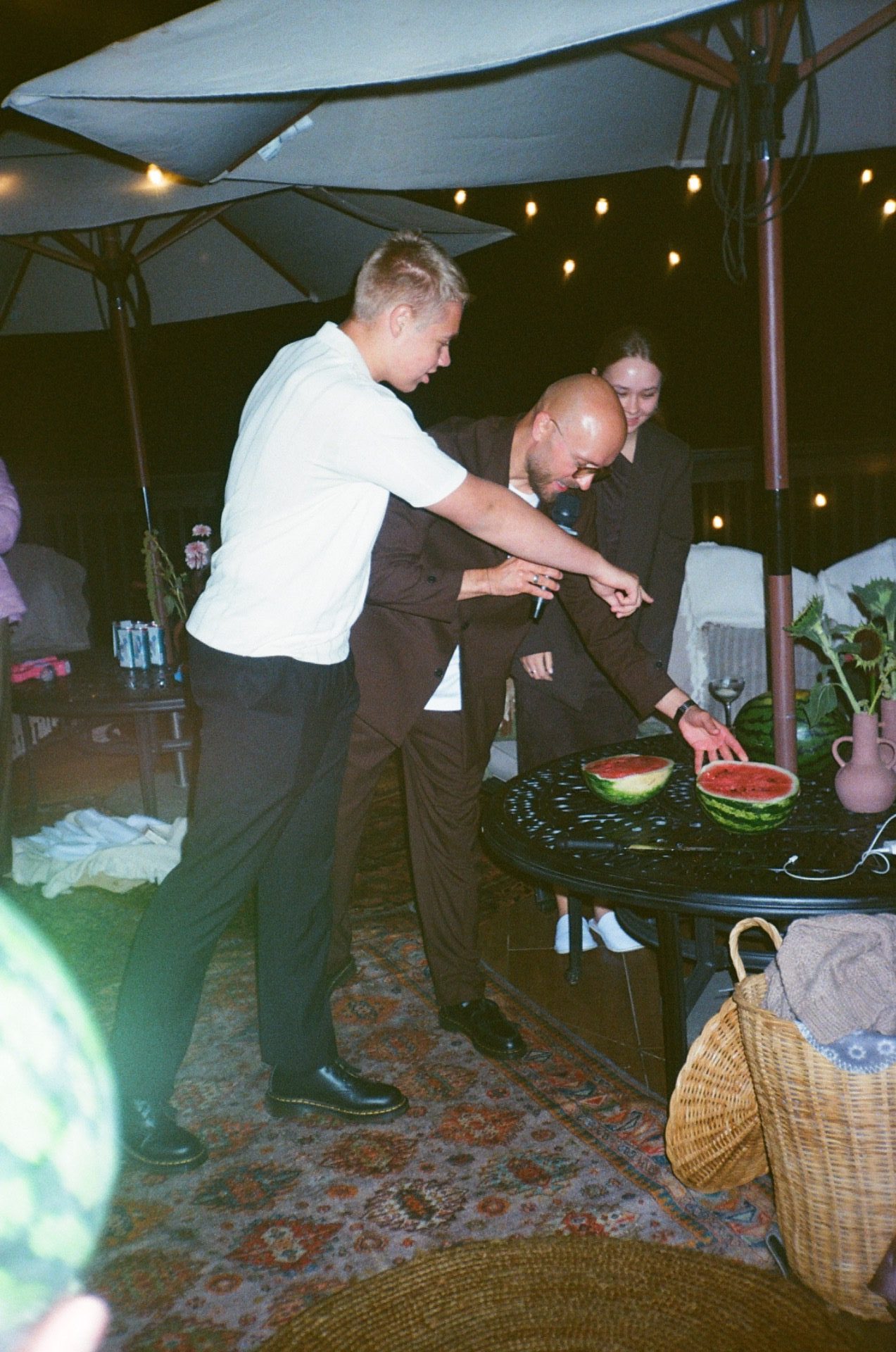 Традиционно я кидала букет подругам, а холостякам достался розыгрыш — выбрать самый спелый арбуз, не зная, что только один из них был жёлтым, а остальные — красными. Кроме этого, мы распечатали фотореференсы, которые гости должны были повторить на полароид. Теперь у нас дома висит картина с необычными фотографиями гостей.