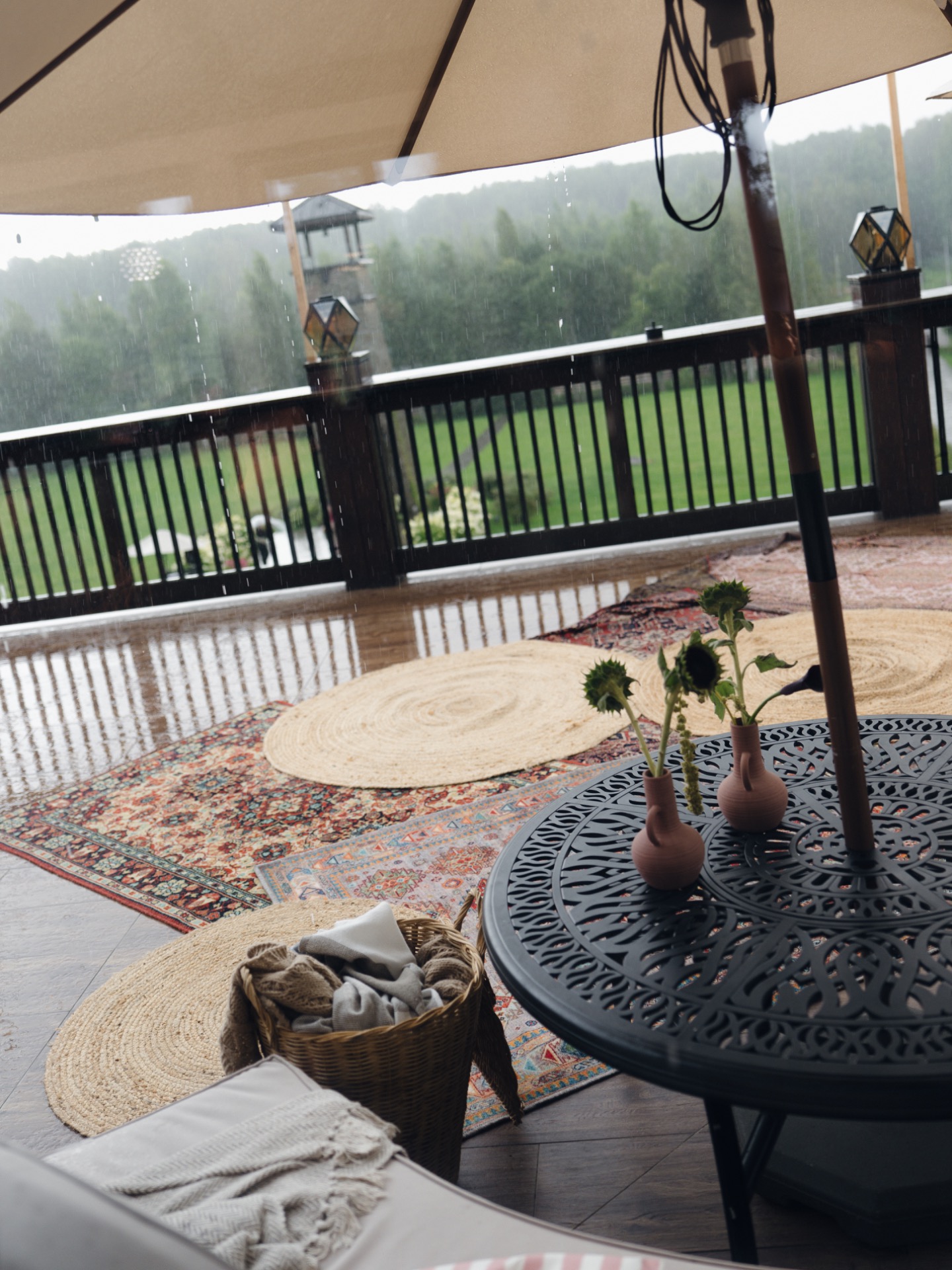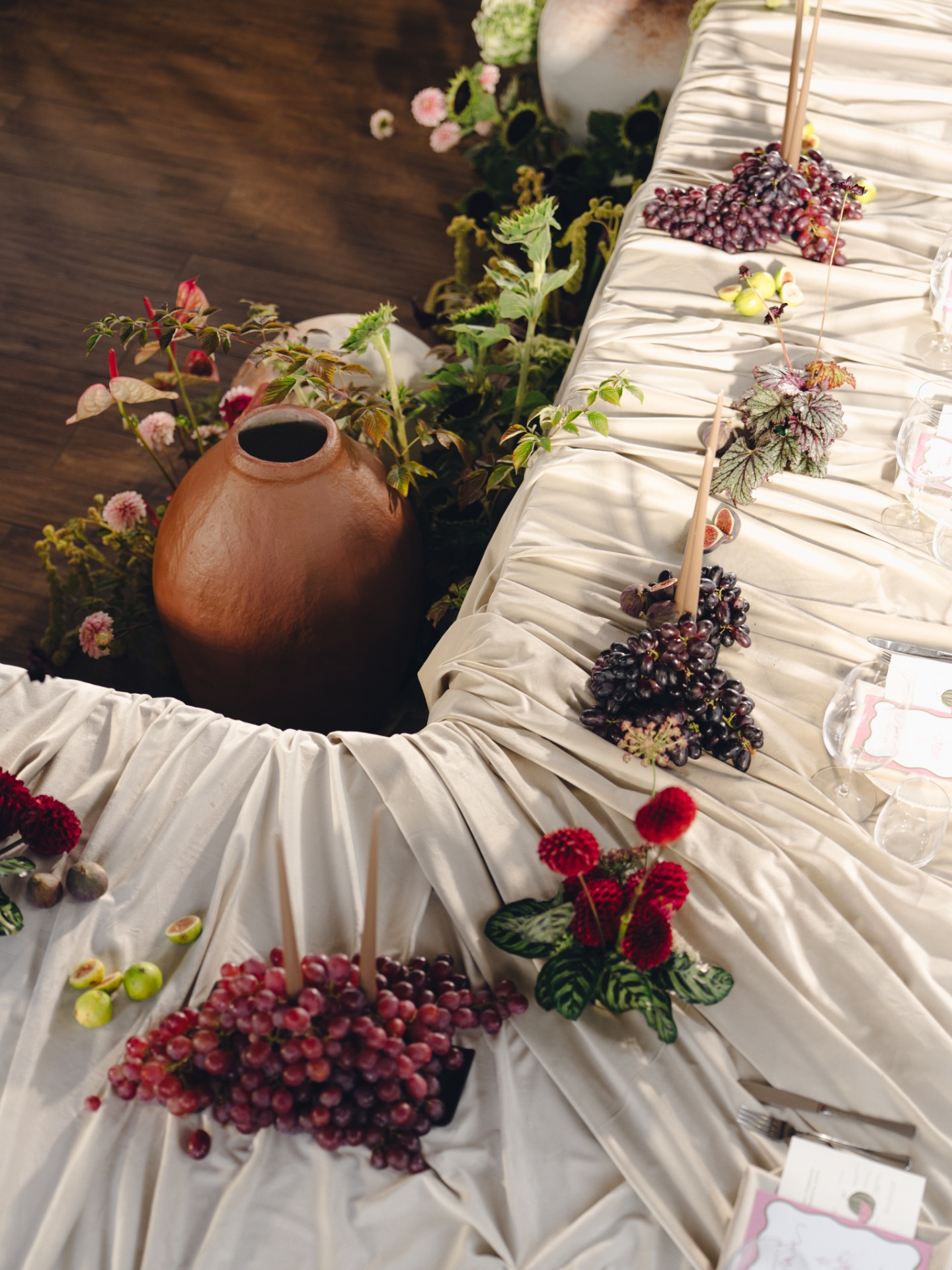 В зоне церемонии на лужайке и в зале были установлены большие вазоны с гортензиями, подсолнухами, георгинами и, конечно, много арбузов! На столах были размещены цветочные композиции, которые сочетались со свечами, сезонным инжиром и тёмным виноградом. Также отдельно была выделена лаундж-зона, украшенная национальными коврами, зонтами, небольшими кувшинами и текстилем.