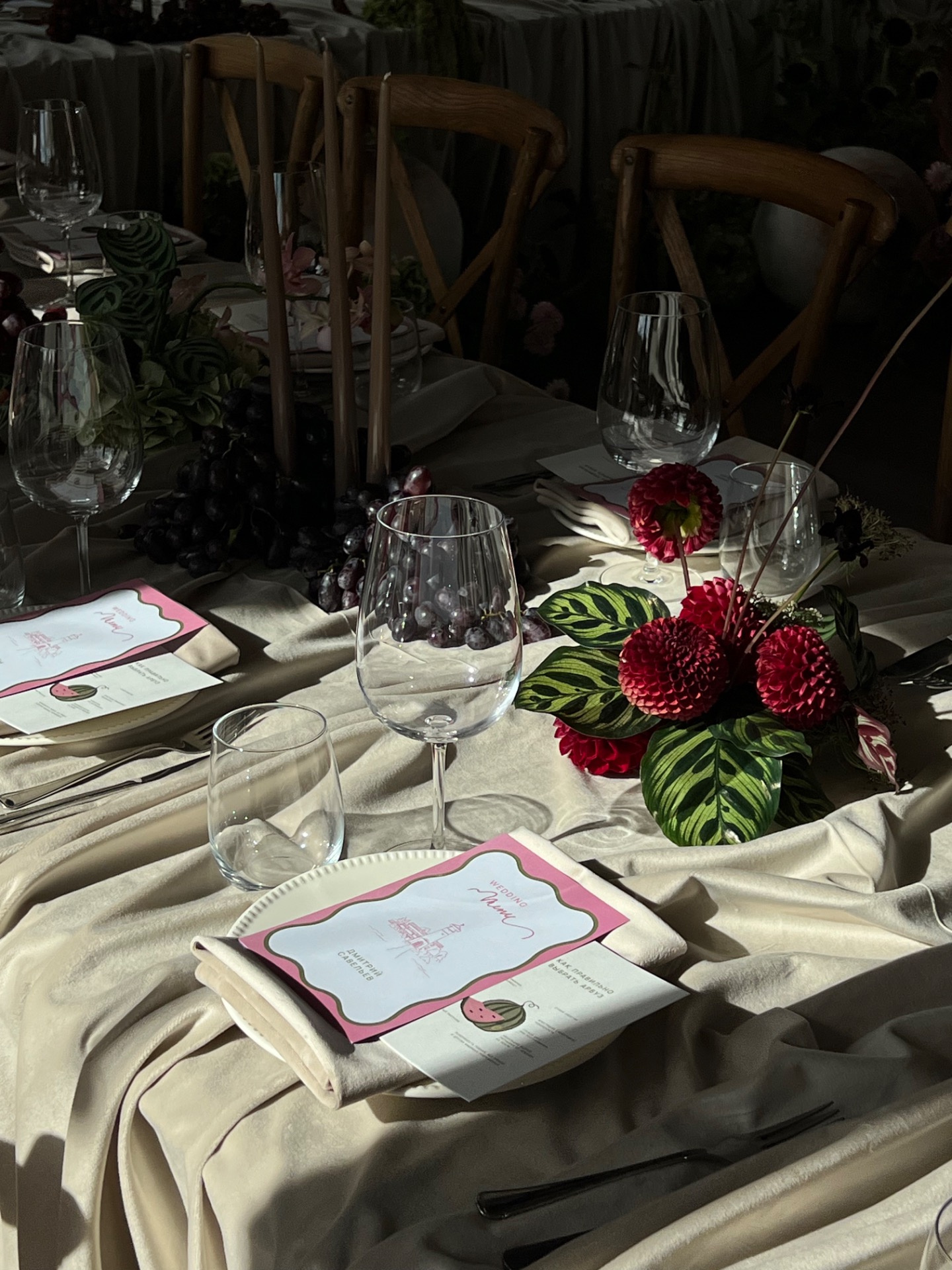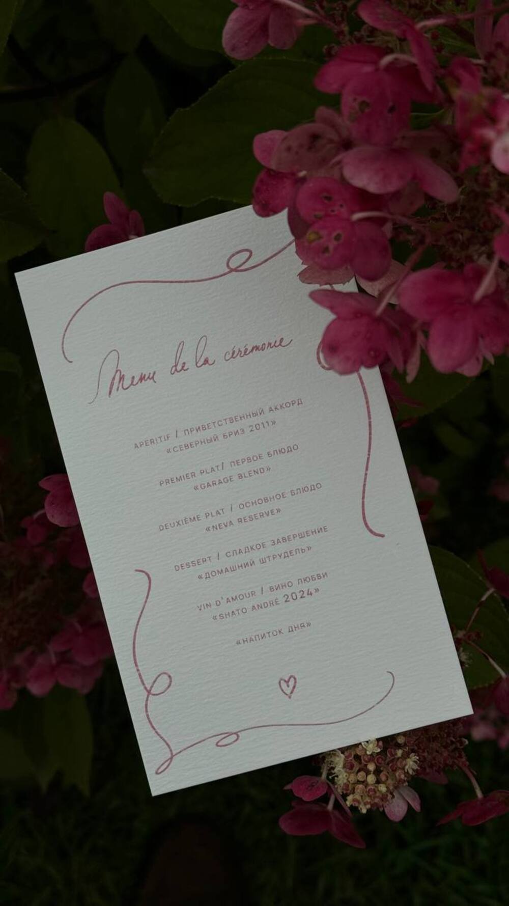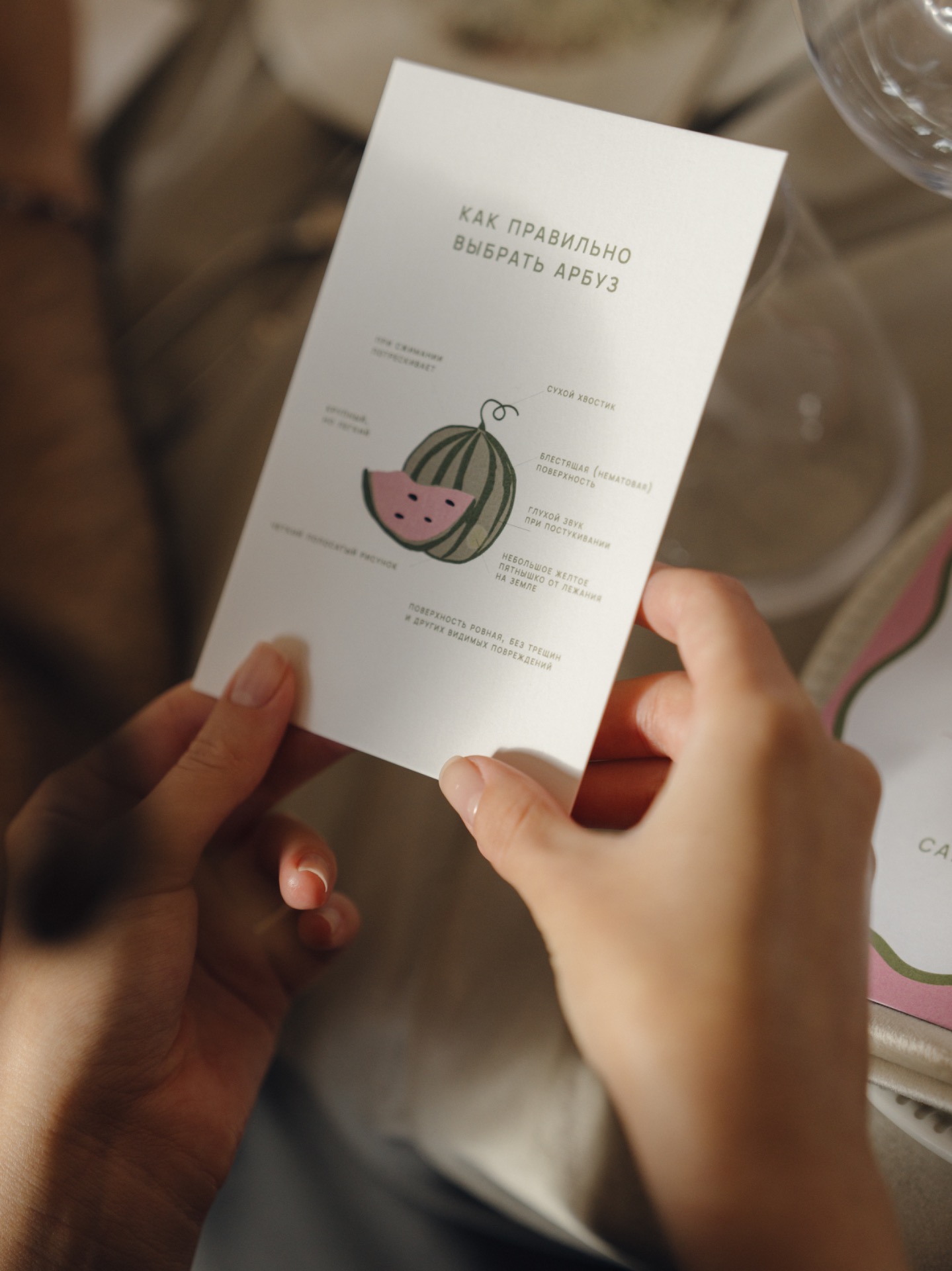 Поддерживая арбузную концепцию, на столе у каждого гостя лежала та самая карточка, которую Кирилл отправил мне в начале отношений. Она стала своеобразным памятным сувениром нашего дня.