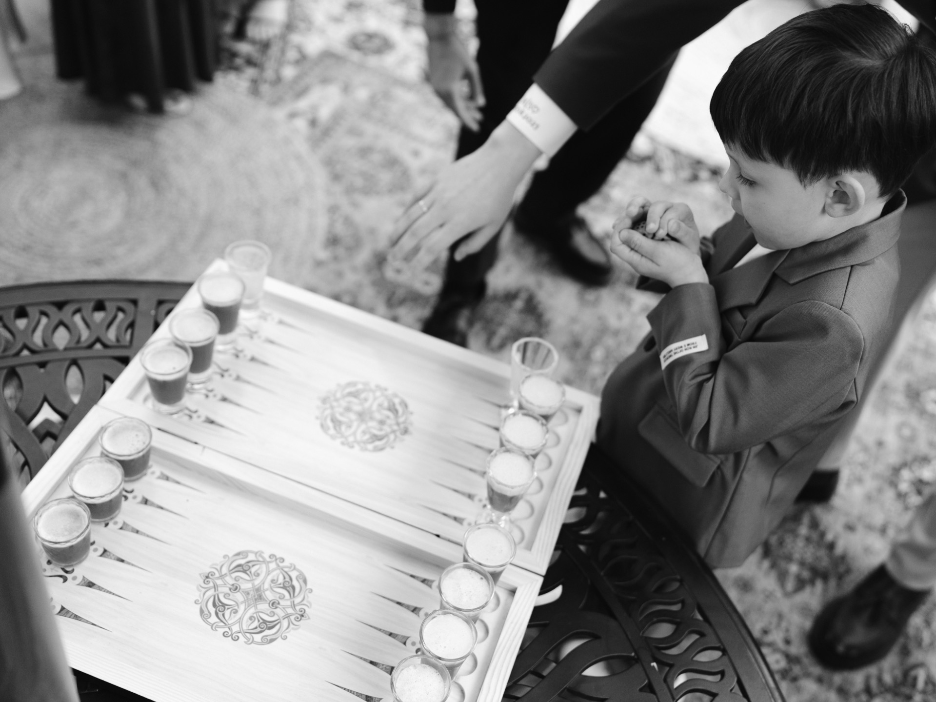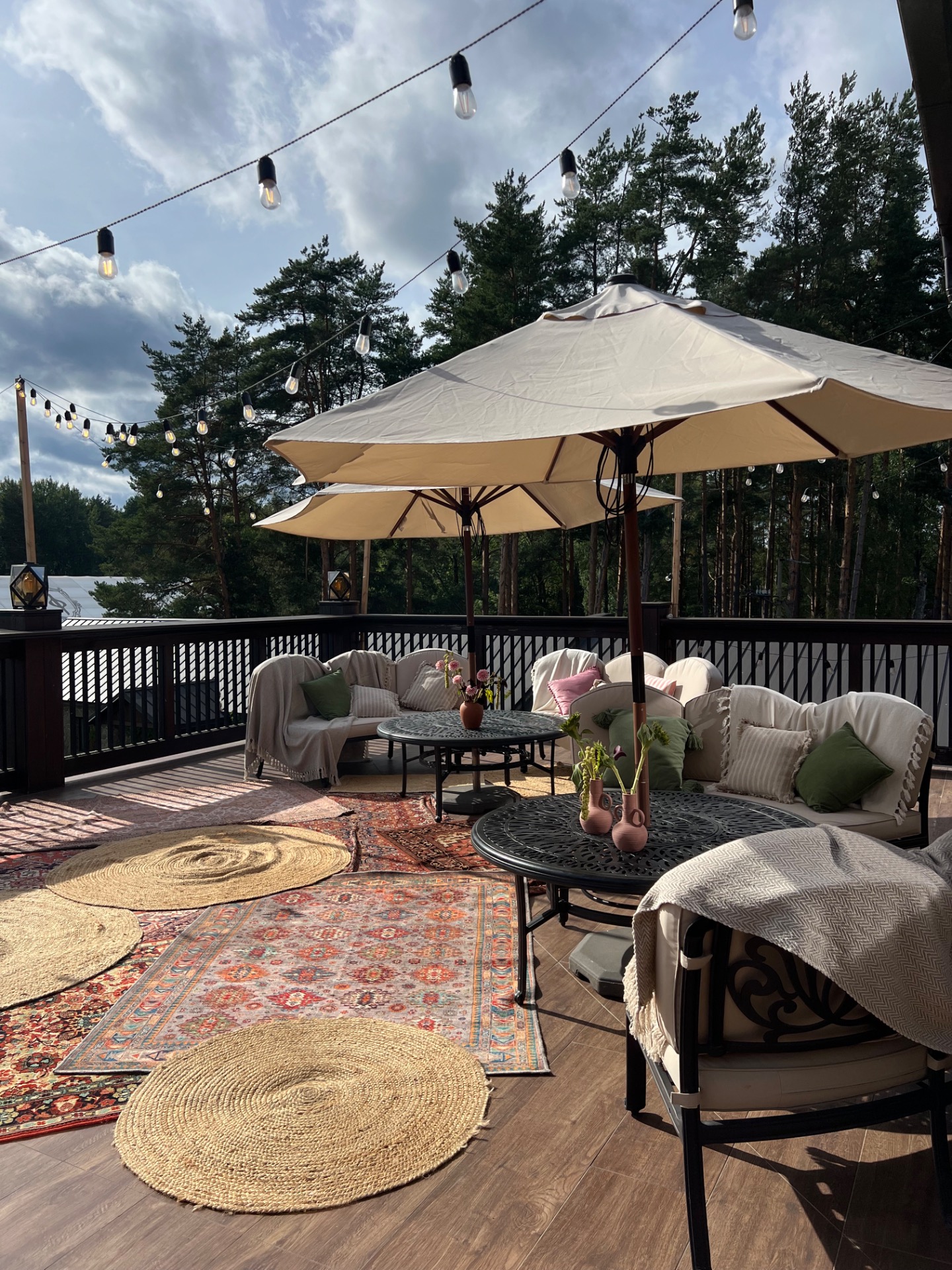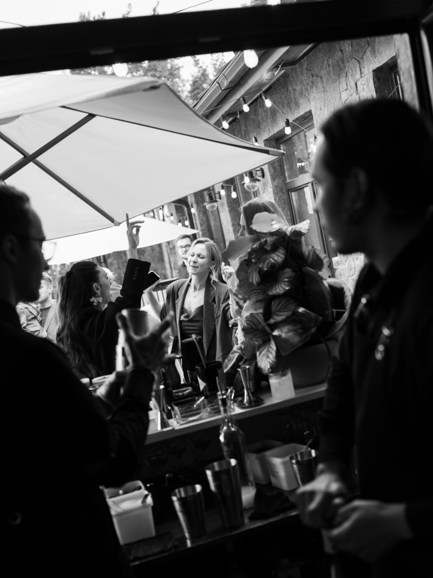 На веранде рядом с лаунджем мы расположили бар с именными коктейлями, который в середине вечера открыли игрой в «алко-нарды», придуманной по мотивам домашних посиделок.