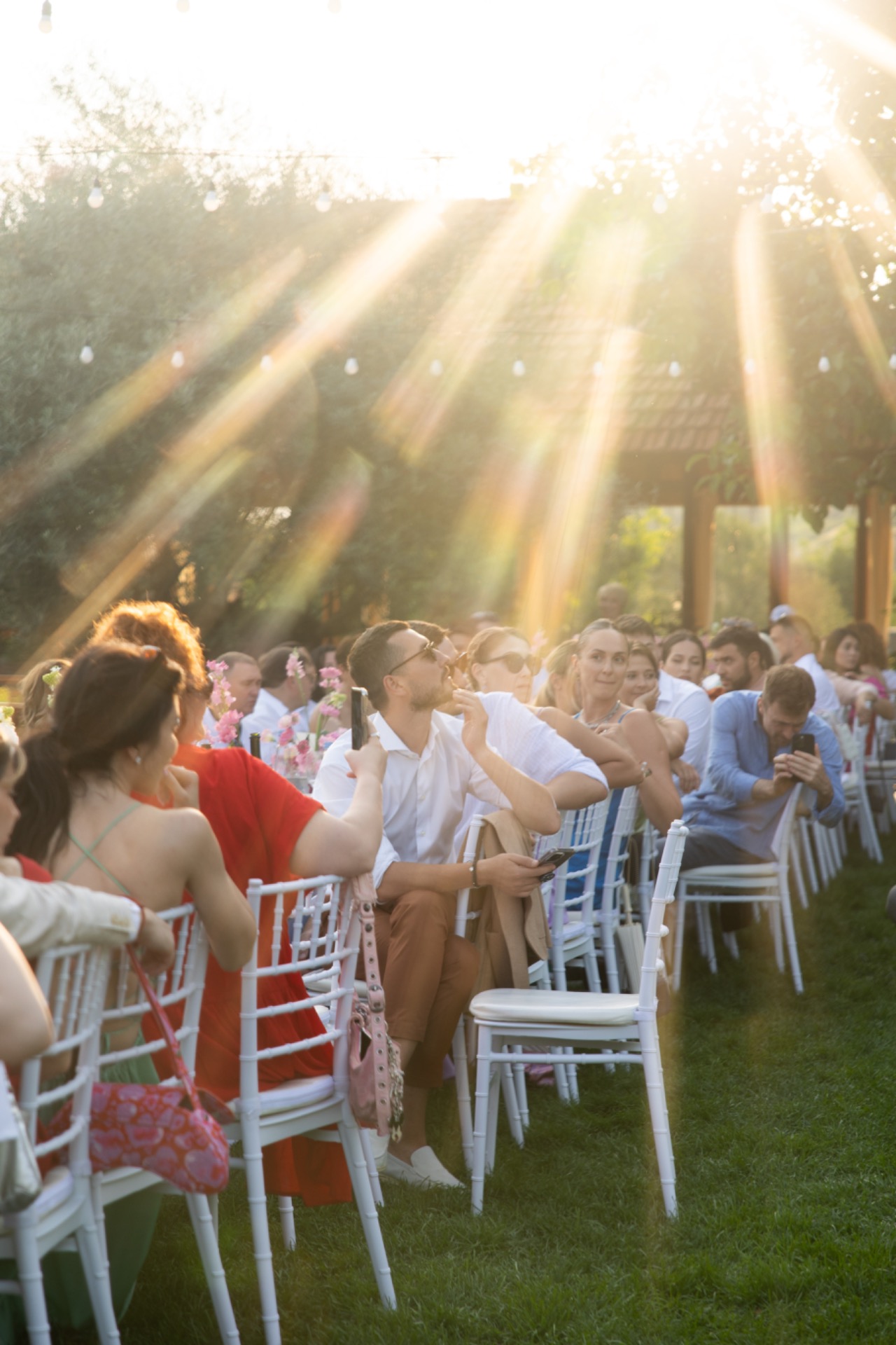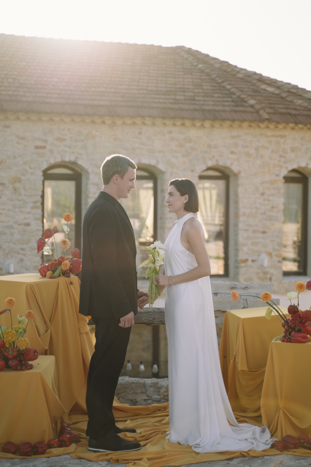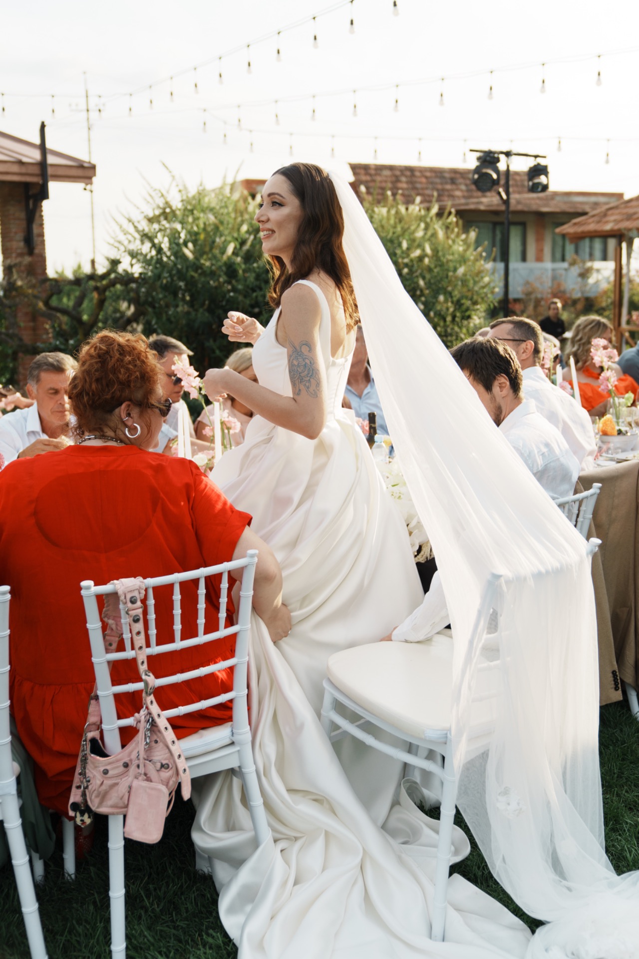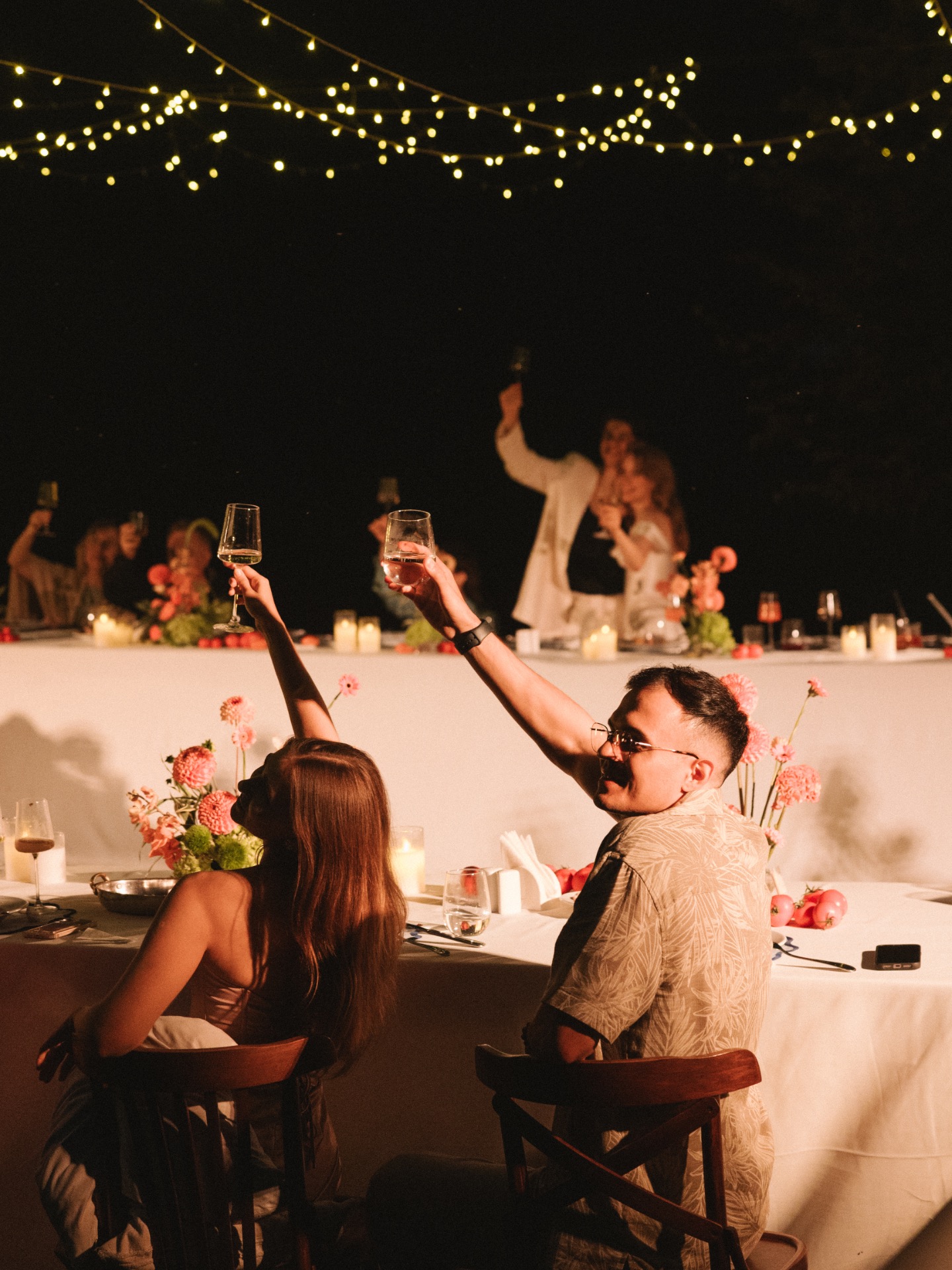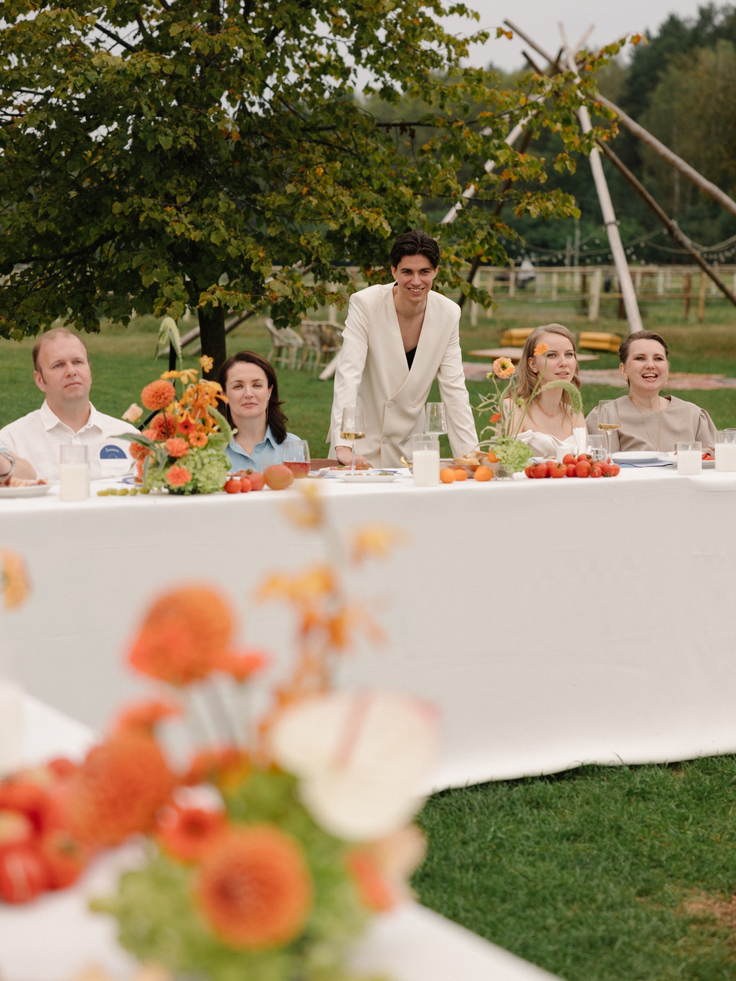 Ксения: Я просто сказала, что хочу свадьбу по механике и вайбу, как у французского дизайнера Jacquemus — только с грузинским флёром, так как я и моя семья — грузины! Было очень трогательно. Все так давно не виделись, все наболтались, натуcовались, перегрузились. Кстати, клятвы мы говорили не на церемонии, а за столом, за ужином. Жених переволновался и говорил речь на 15 минут!