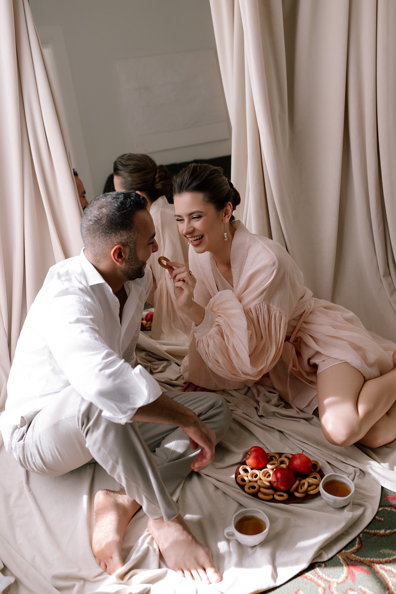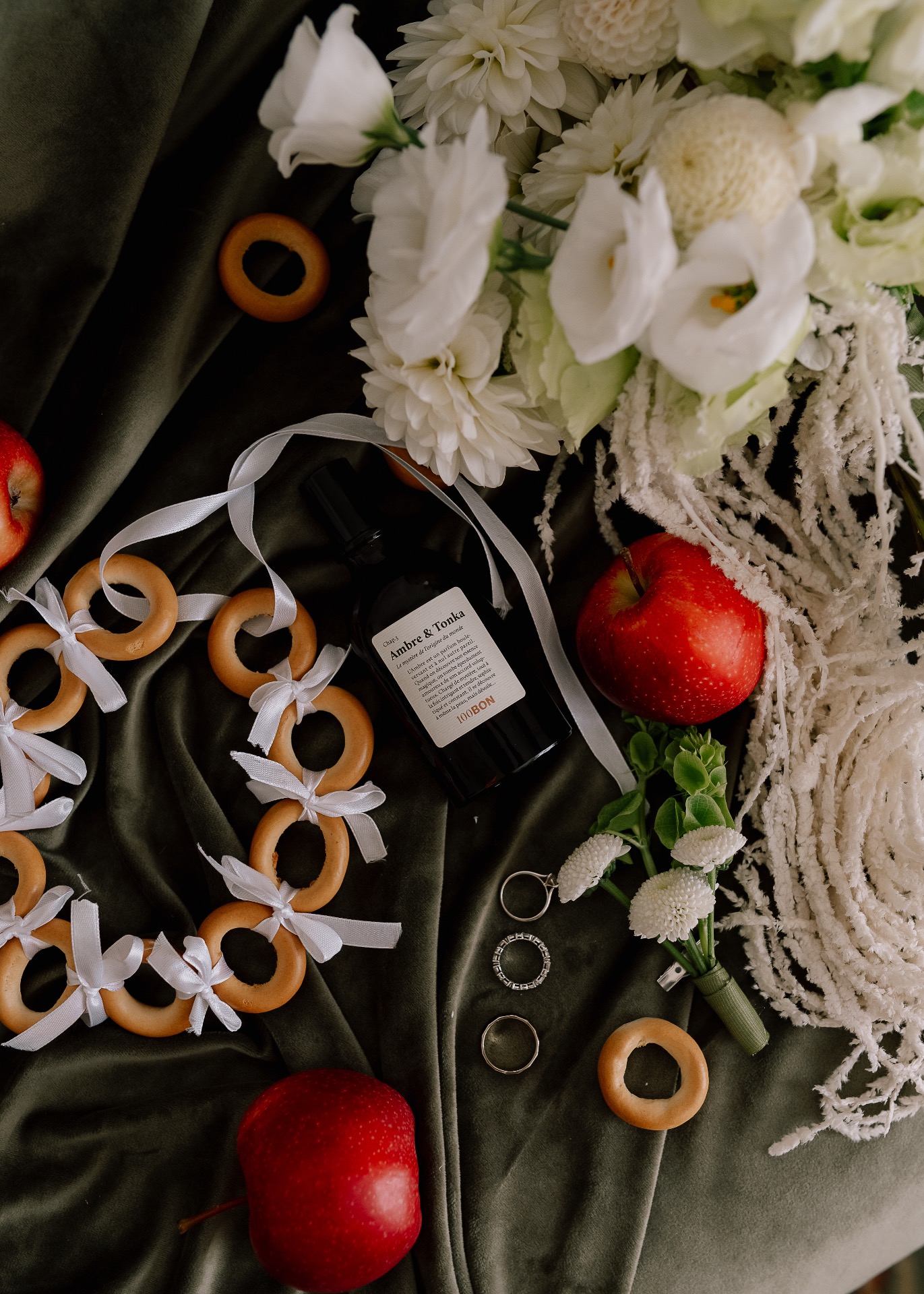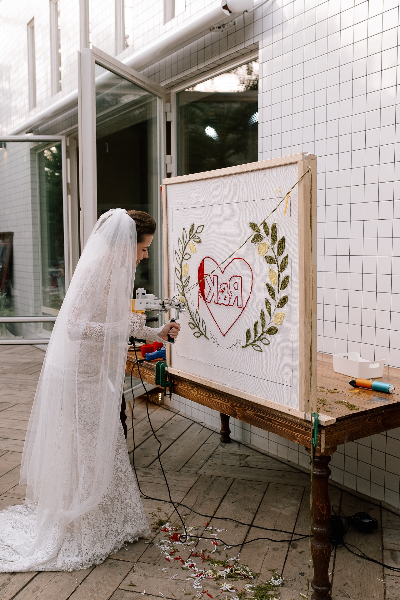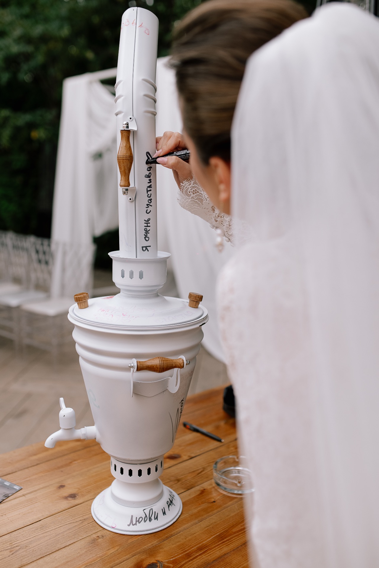 Поскольку среди гостей со стороны жениха были иностранцы, команда постаралась максимально погрузить их в русские традиции. На столе для приветствия гостей стоял настоящий самовар, возле которого каждый мог оставить свои пожелания молодожёнам. В течение дня гости вкладывали частичку души в создание именного ковра для пары — особенного памятного подарка, который вручили им в финале вечера. И, конечно же, не обошлось без традиционного хоровода, подарившего всем заряд радости и веселья.