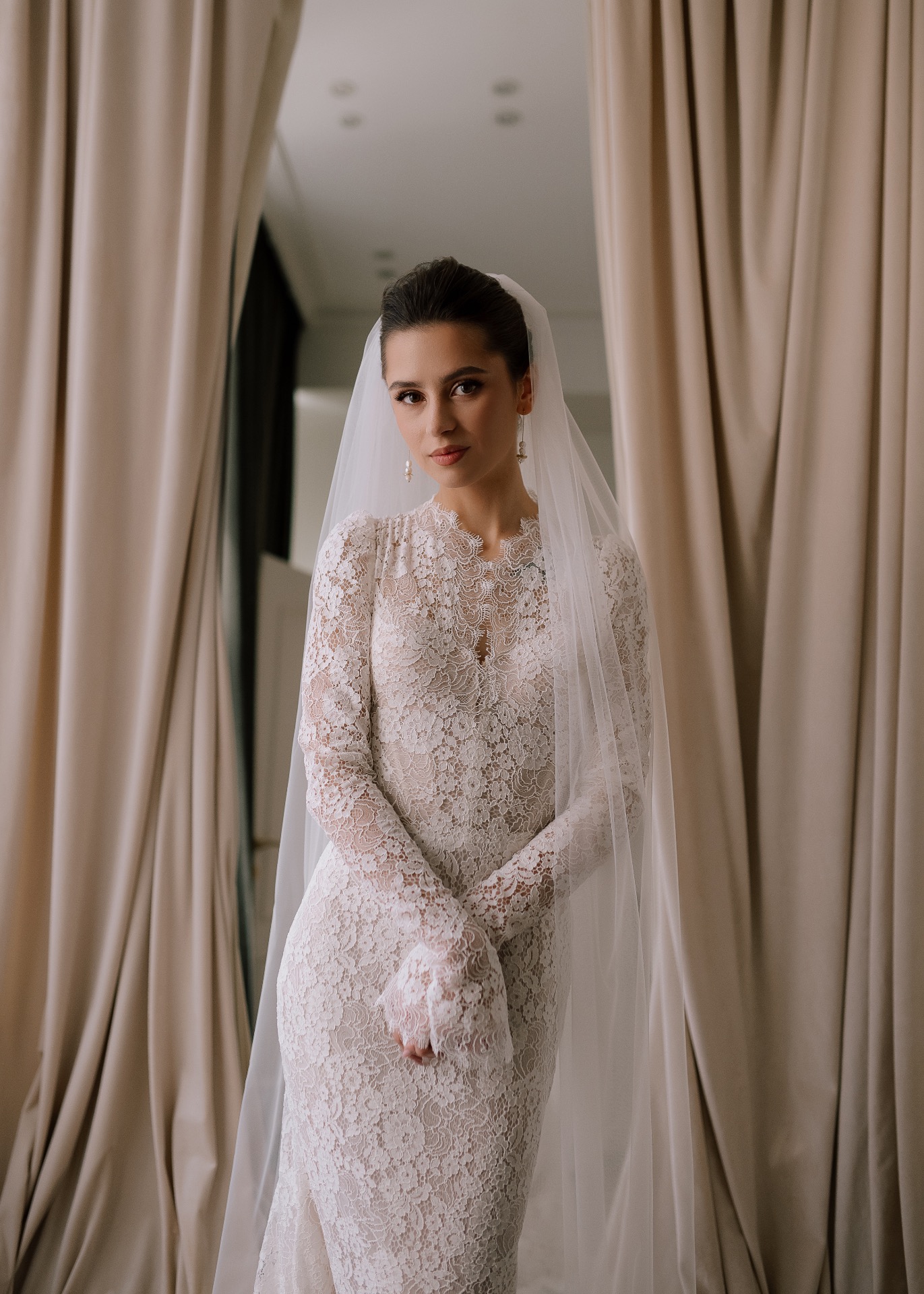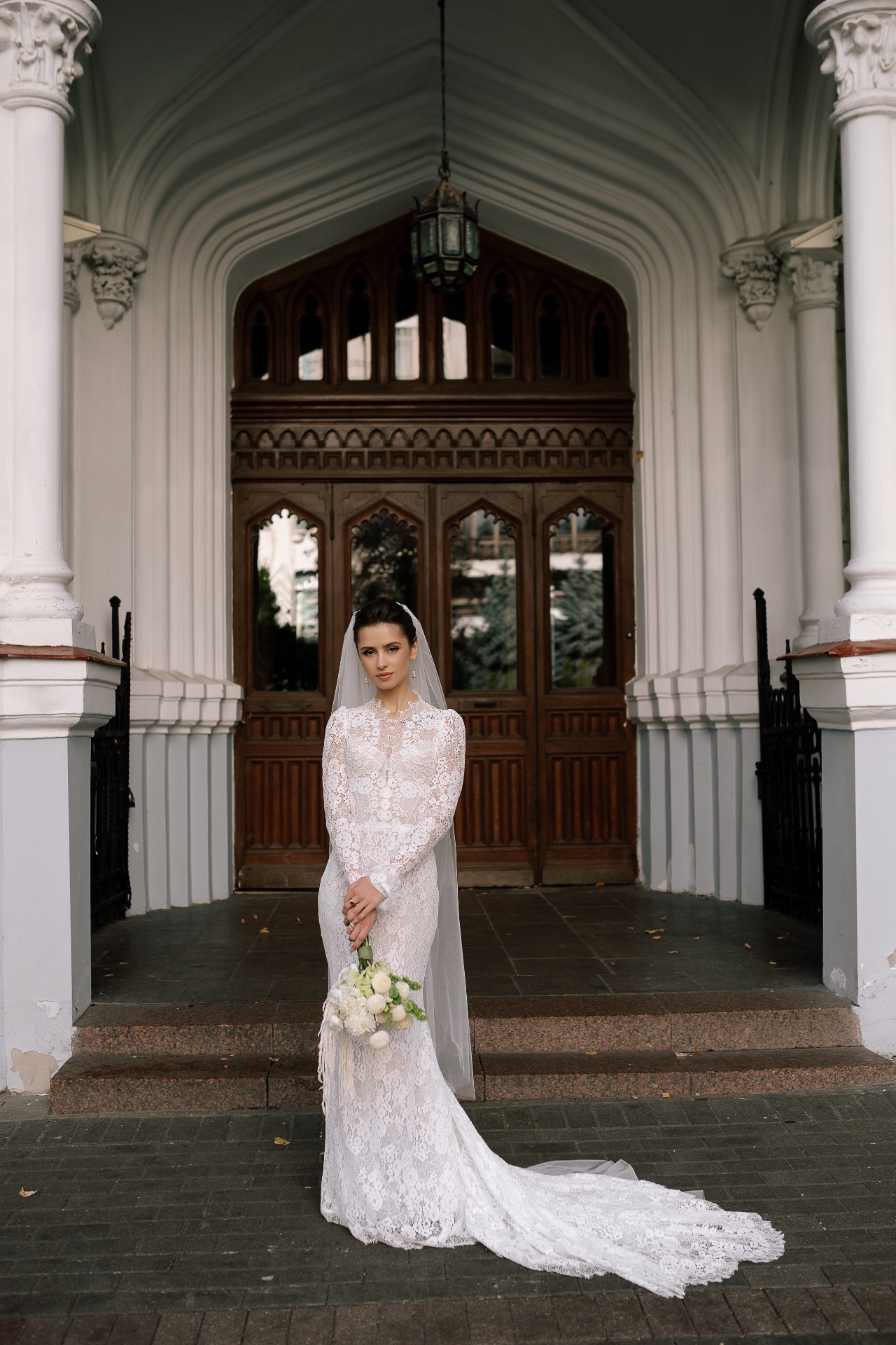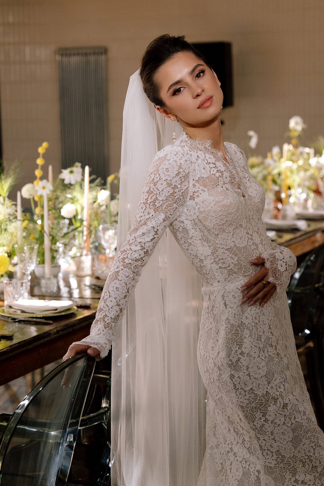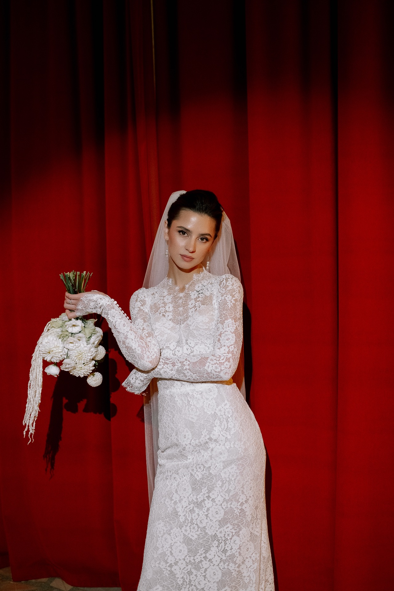 Ксения выбрала изысканный образ, сочетающий элегантность и утончённость. Платье-рыбка из нежного кружева олицетворяло изящество и женственность. Лаконичный дизайн делал образ современным и сдержанным, а кружевные детали добавляли романтичности и лёгкости. Образ дополнили фактурный пучок и нежный макияж с мягкими пастельными оттенками, который идеально гармонировал с кружевом платья и подчёркивал естественную красоту Ксении.