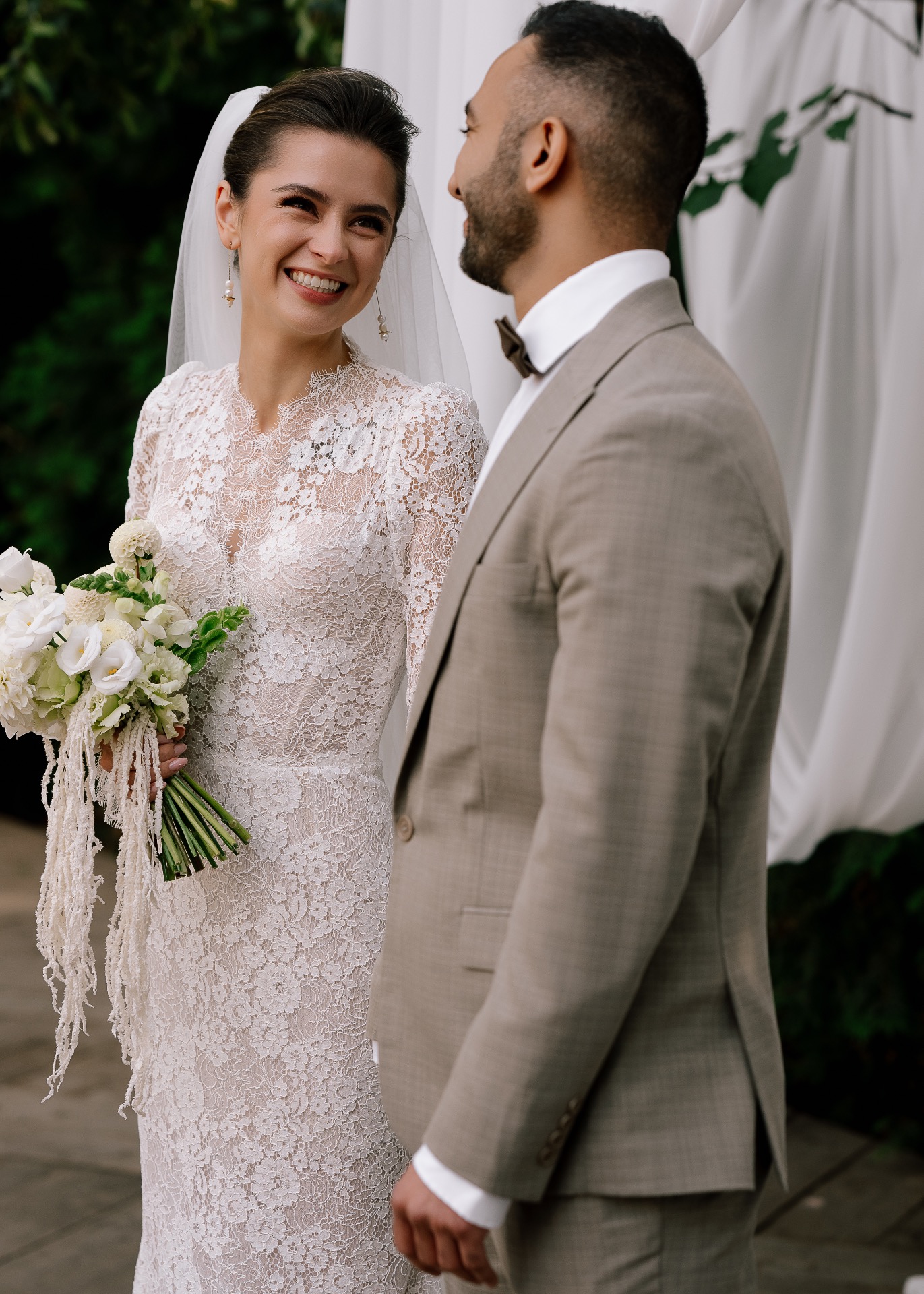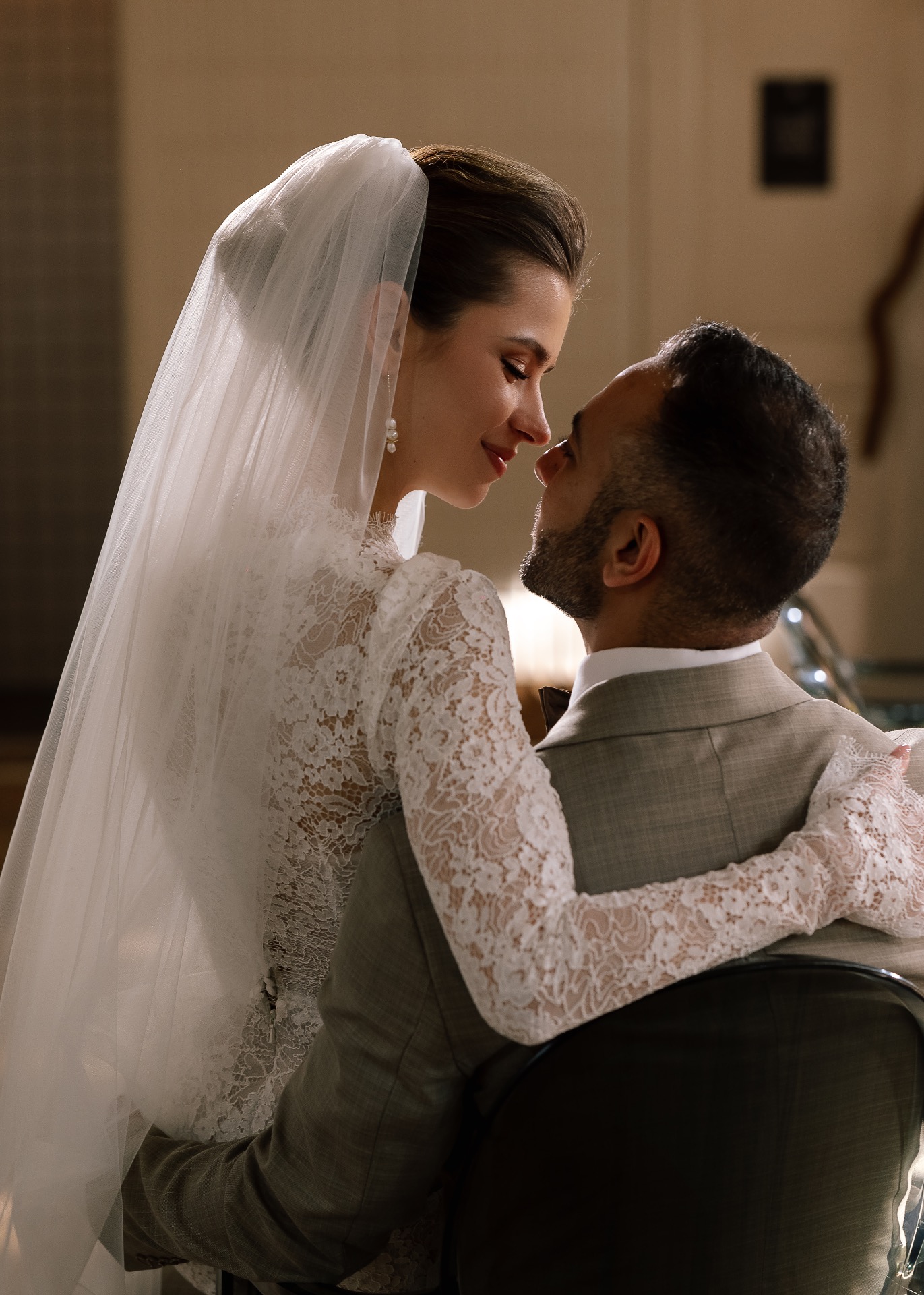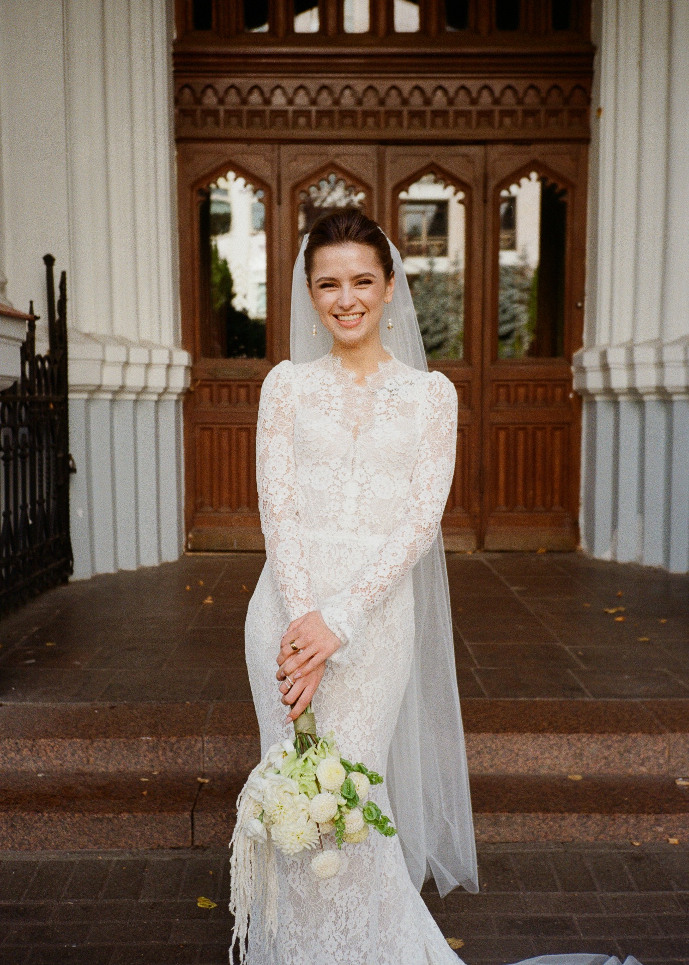Ксения выбрала изысканный образ, сочетающий элегантность и утончённость. Платье-рыбка из нежного кружева олицетворяло изящество и женственность. Лаконичный дизайн делал образ современным и сдержанным, а кружевные детали добавляли романтичности и лёгкости. Образ дополнили фактурный пучок и нежный макияж с мягкими пастельными оттенками, который идеально гармонировал с кружевом платья и подчёркивал естественную красоту Ксении.