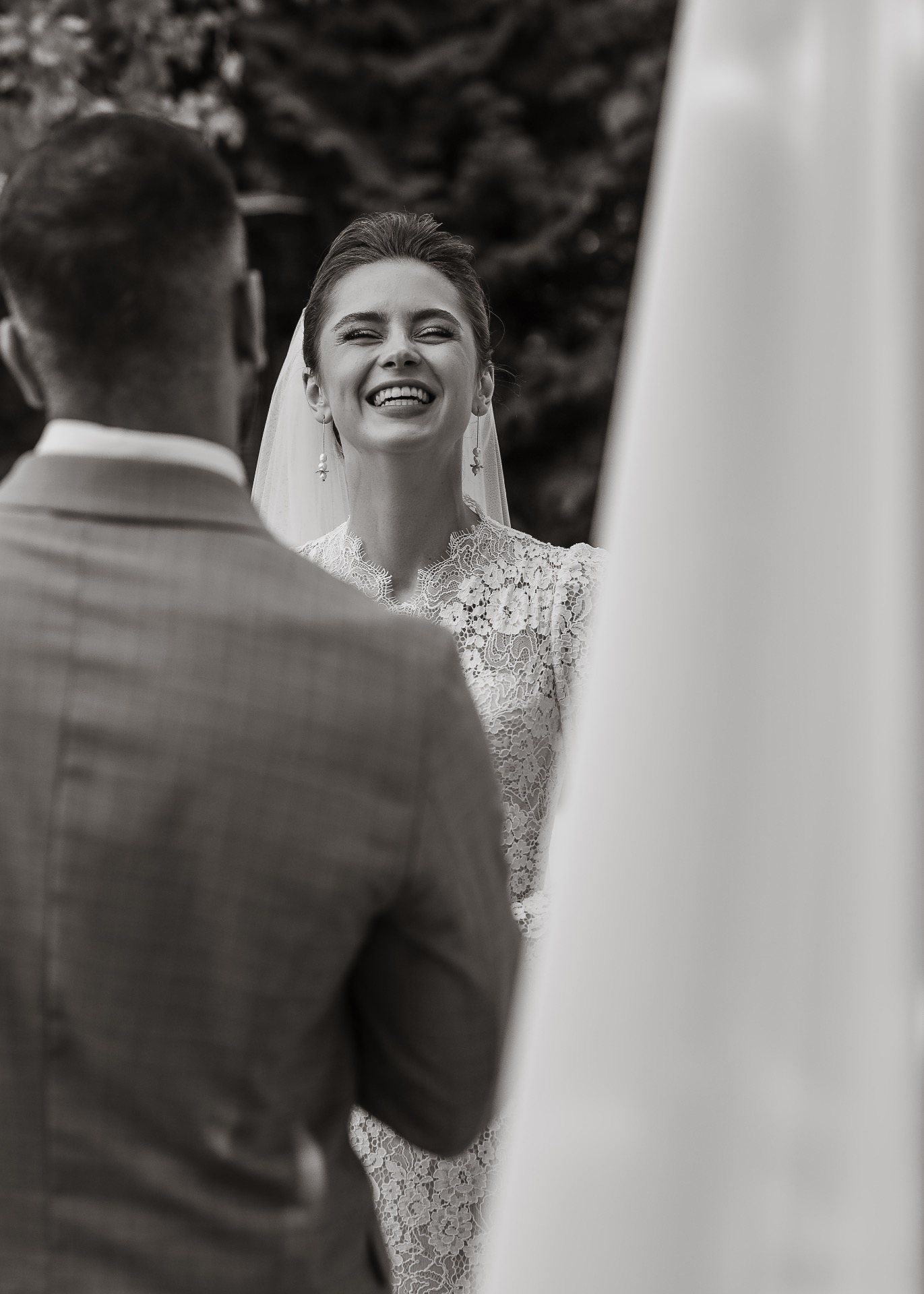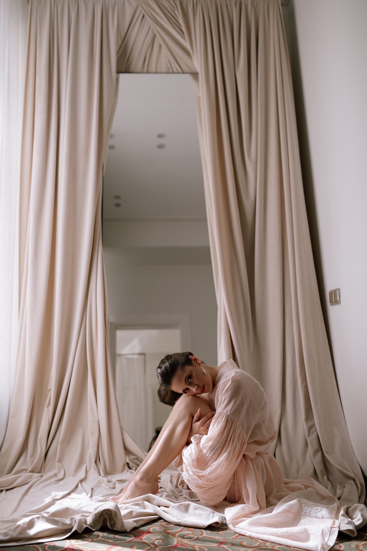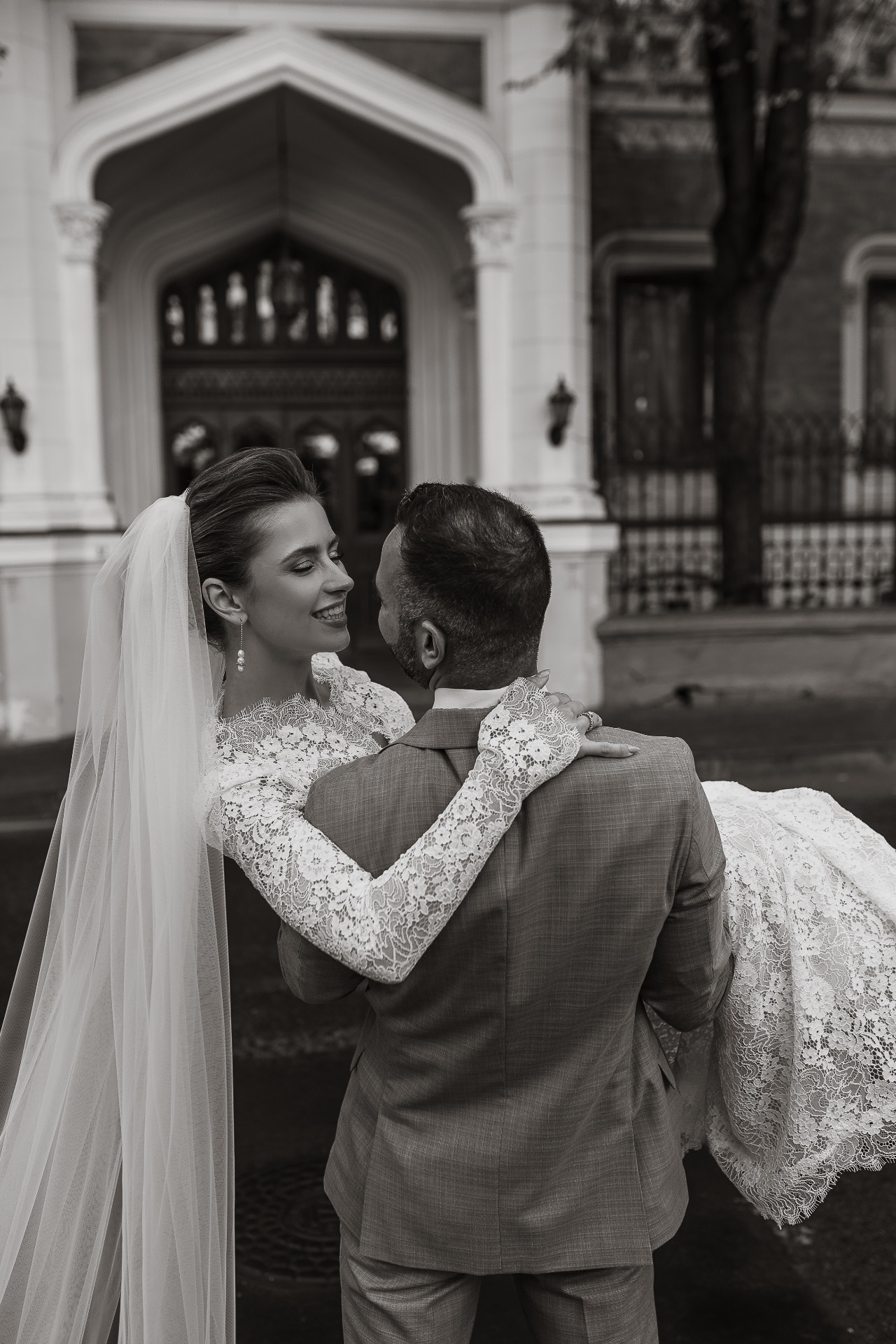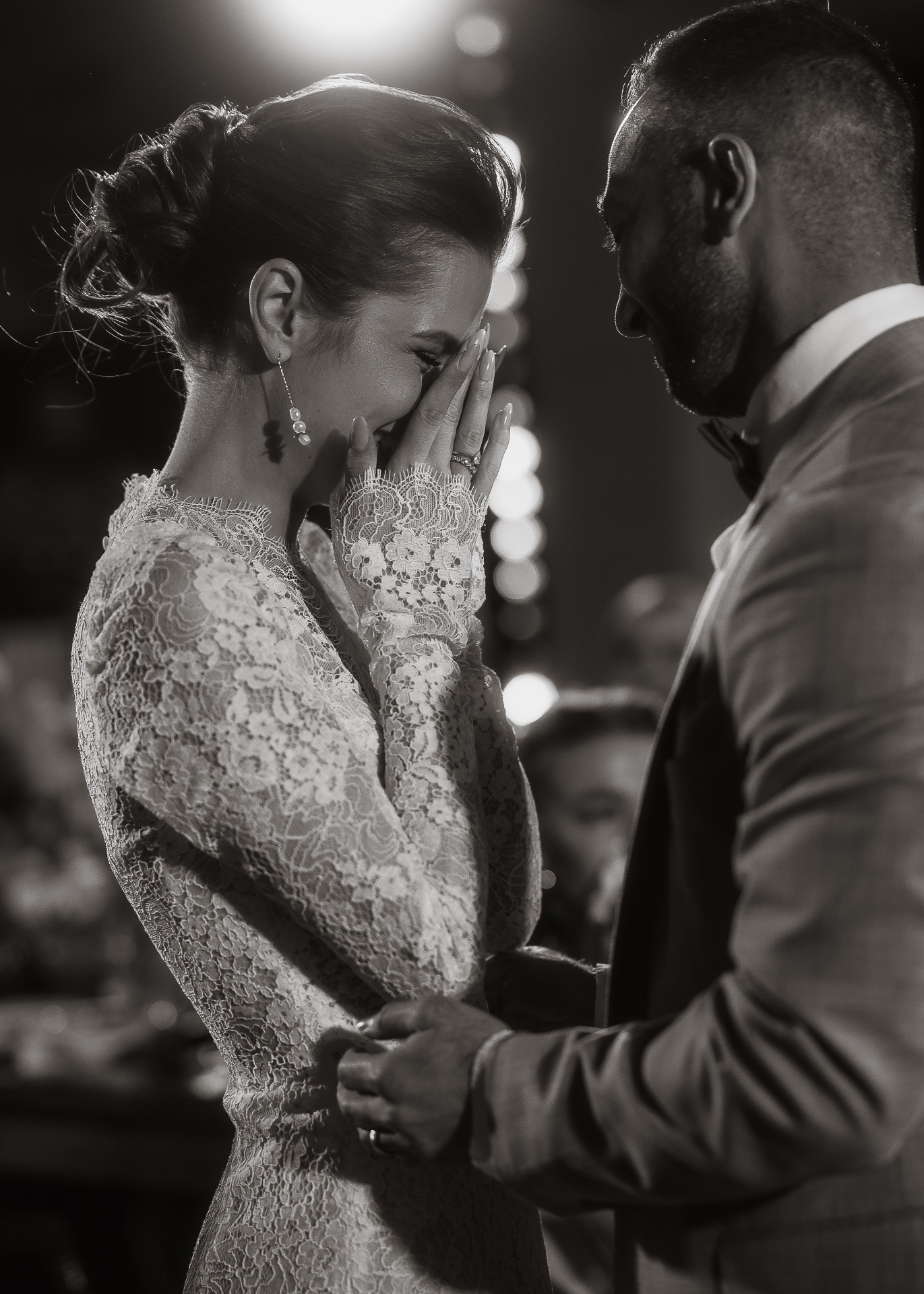Ксения выбрала изысканный образ, сочетающий элегантность и утончённость. Платье-рыбка из нежного кружева олицетворяло изящество и женственность. Лаконичный дизайн делал образ современным и сдержанным, а кружевные детали добавляли романтичности и лёгкости. Образ дополнили фактурный пучок и нежный макияж с мягкими пастельными оттенками, который идеально гармонировал с кружевом платья и подчёркивал естественную красоту Ксении.
