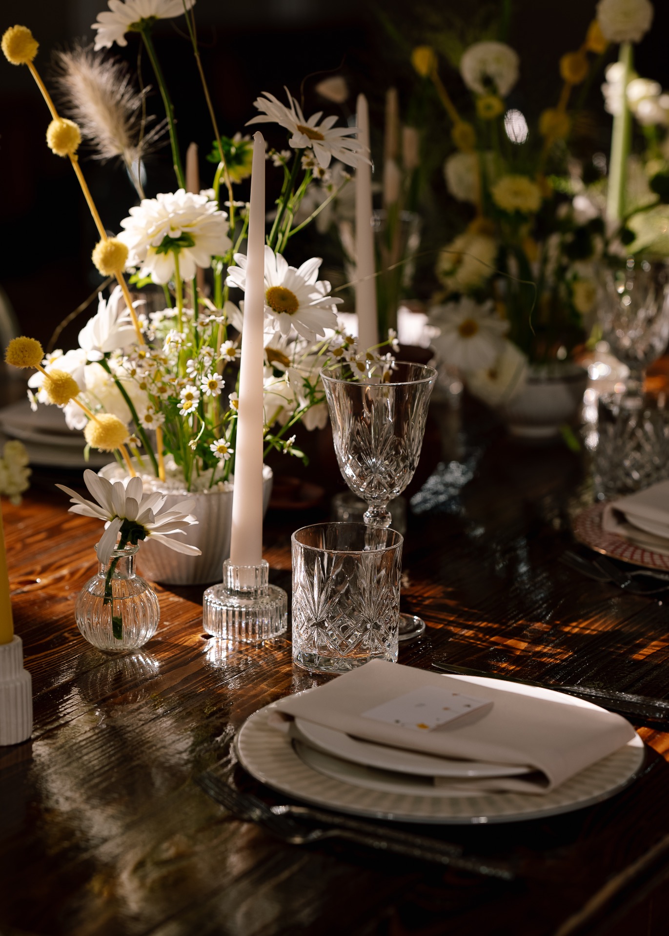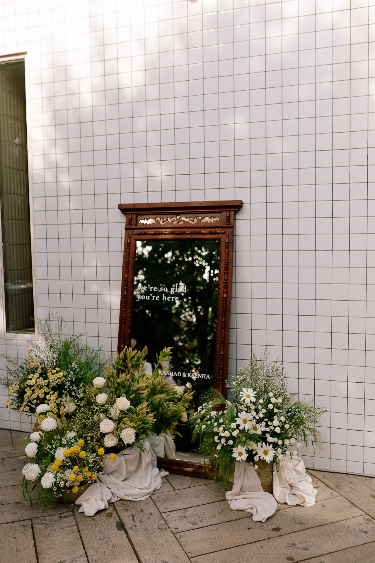 Особенно трогательно в этот день было то, что гости принесли букеты с любимыми цветами невесты — ромашками. Кстати, именно этот цветок стал вдохновением для оформления всей площадки.