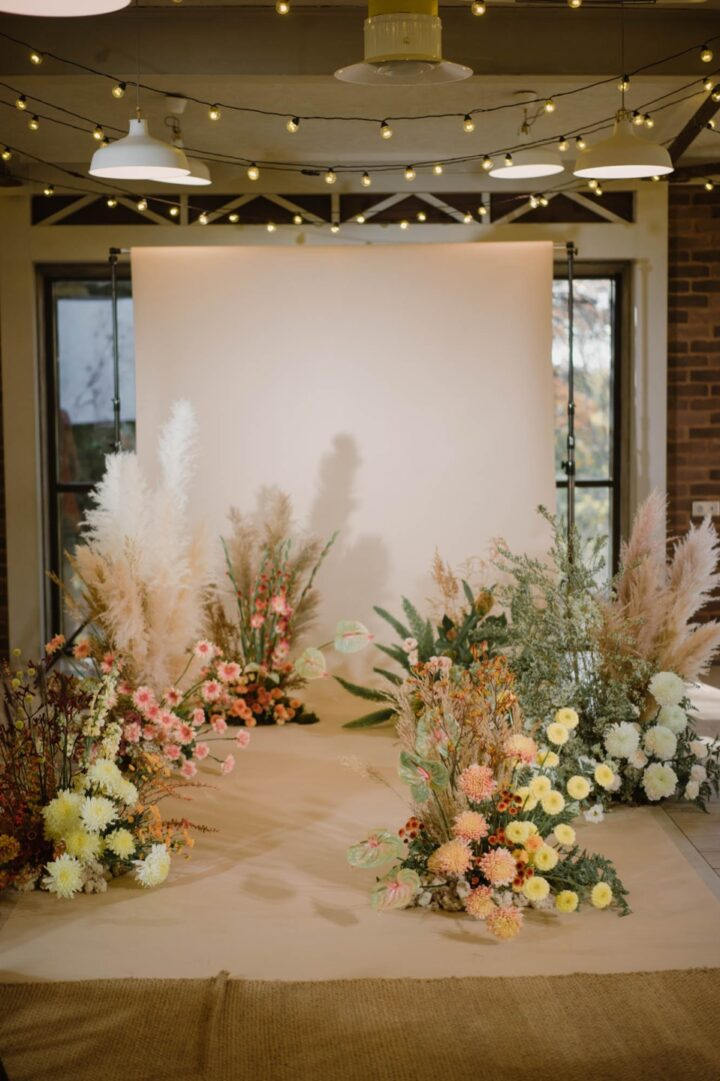Серёже подобрали смарт-кэжуал вариант в цветах палитры. Я мечтала о свадьбе именно осенью, поэтому и палитру мы выбрали осеннюю — оливковый, темно-зеленый, горчичный, бледно-желтый, коричневый. Нам безумно повезло с нашим декоратором Машей (да и вообще со всей командой)! Я просто молила ее о необычной зоне церемонии, без роз, непохожей на стандартные арки, но и минималистичную при этом. Вместе мы придумали сделать фотофон, как в студии. Маша разработала концепцию «танцующей флористики» и обошлась вообще без роз.