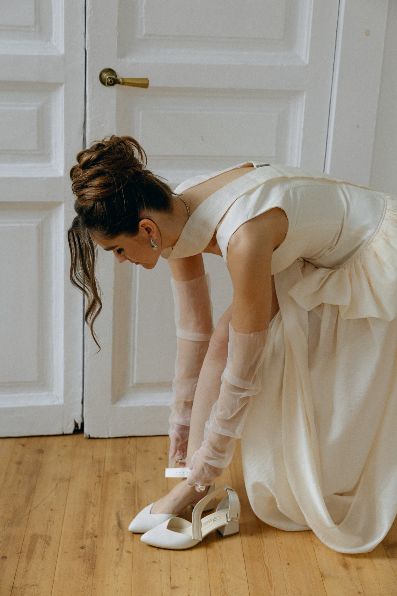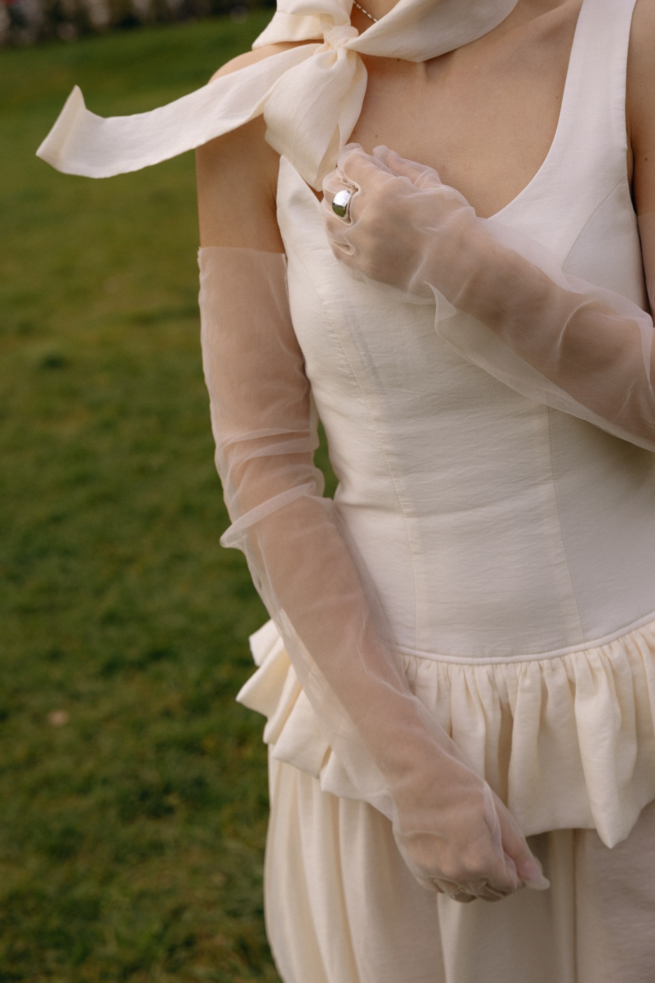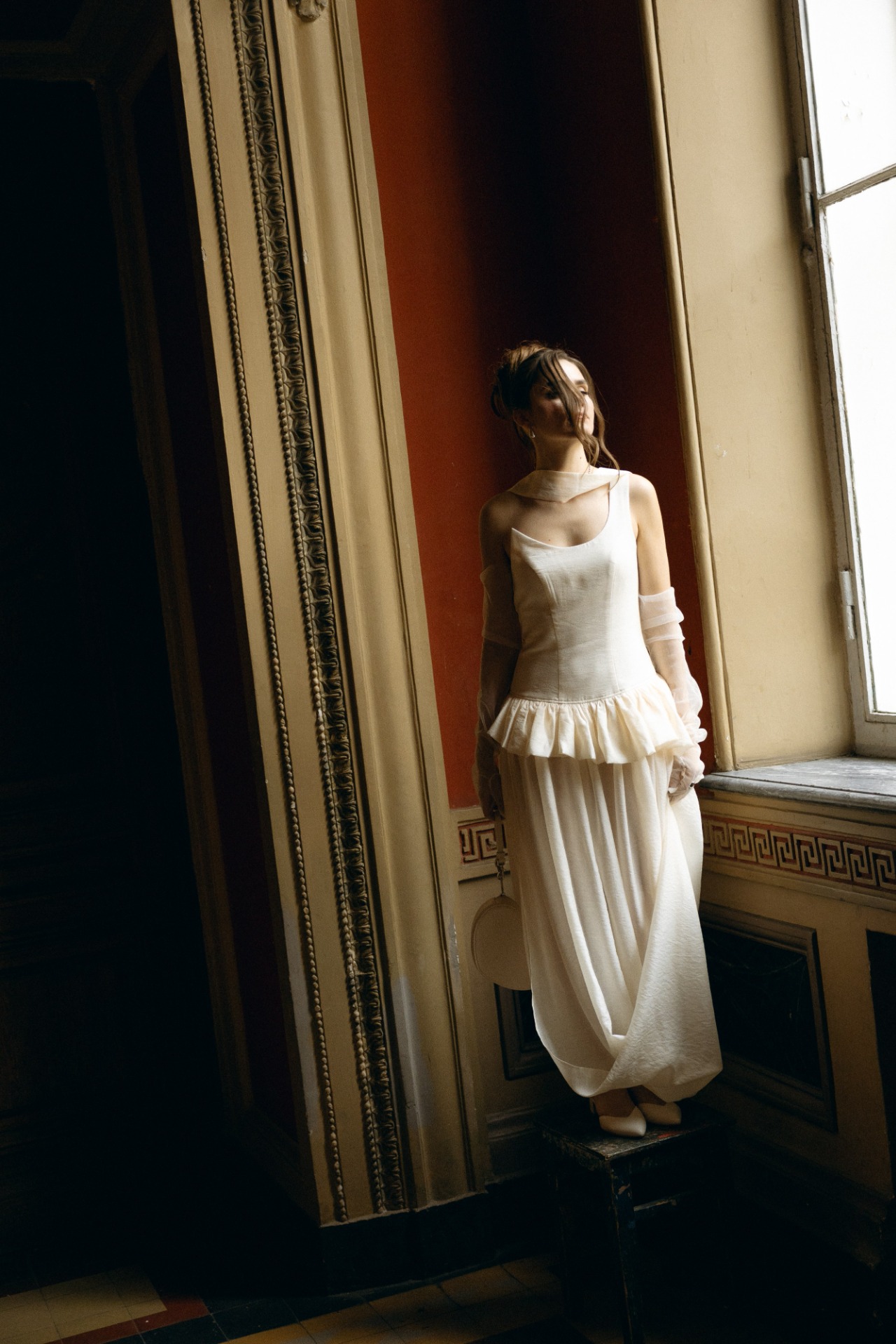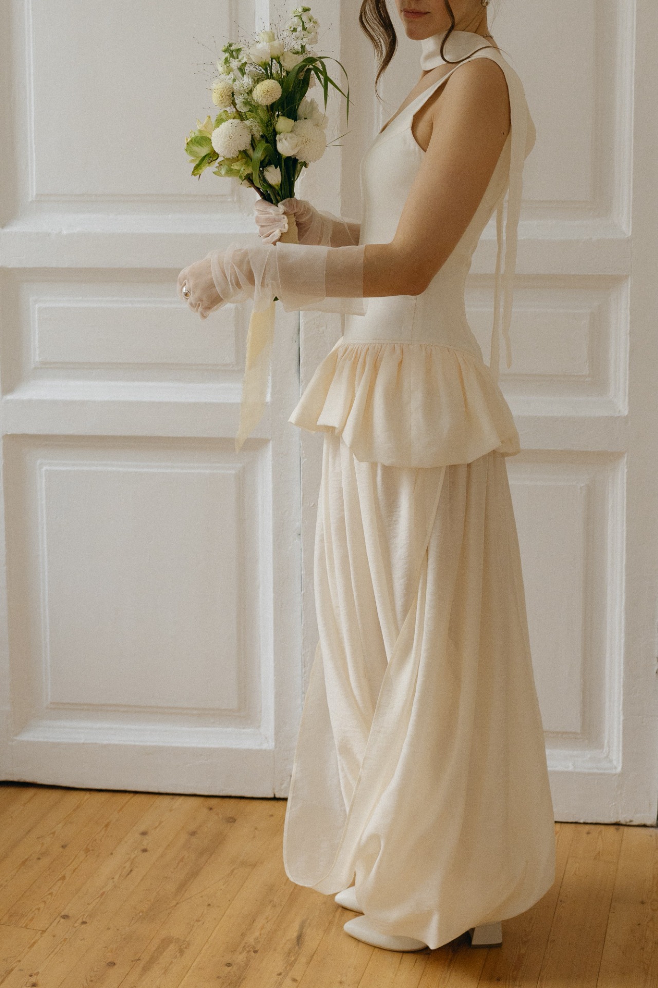 Мой образ тоже был выдержан в древнерусском стиле на новый лад: высокий пучок, белый хлопковый корсет, кружевные панталоны, балетки-лапти. В процессе долгих поисков основного образа я случайно нашла бренд Monreve и платье сливочного цвета на одно плечо с необычной юбкой. Образ дополняли туфли в тон, прозрачные перчатки, сумка-сердце и маленькое сердечко на щеке в качестве мушки.