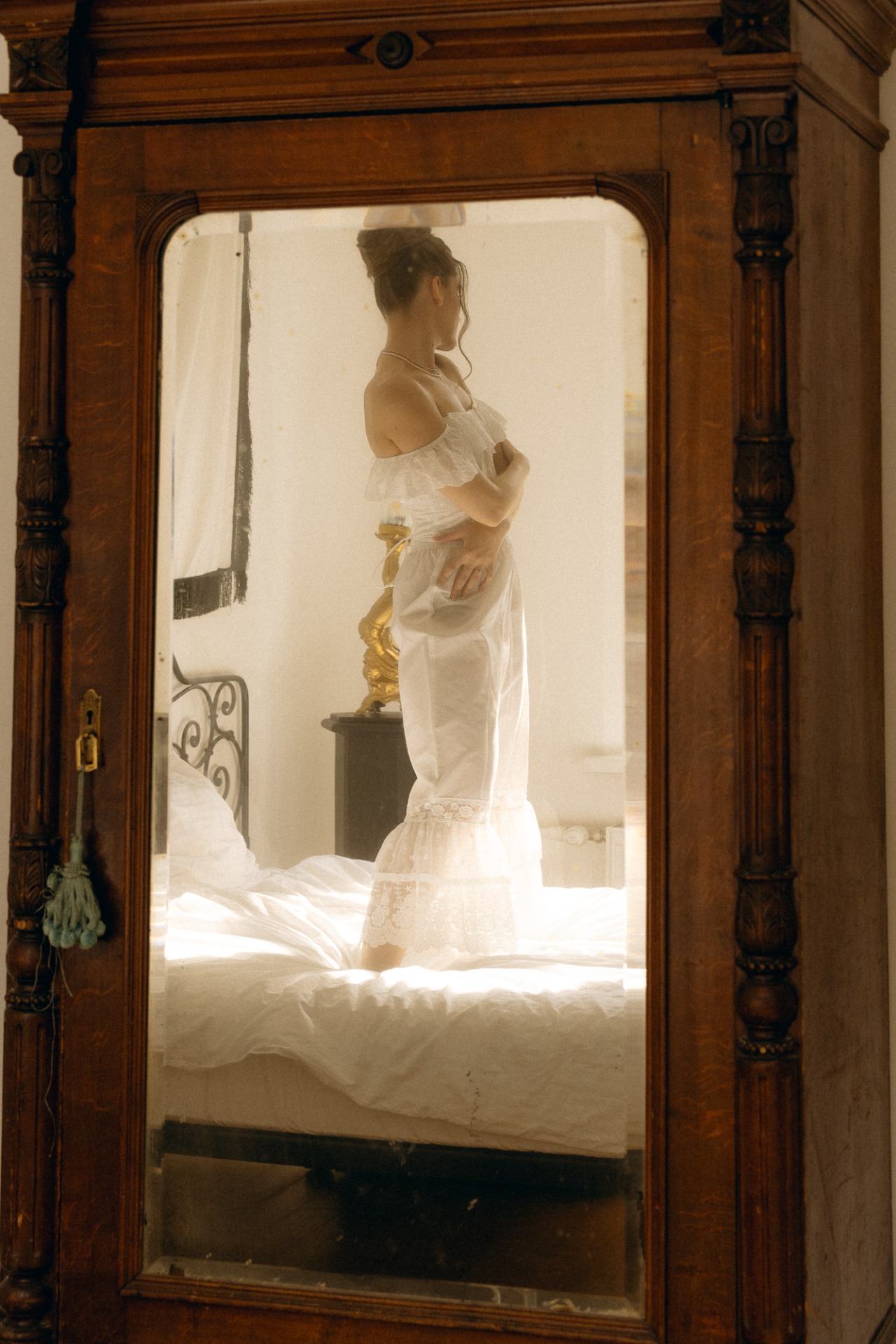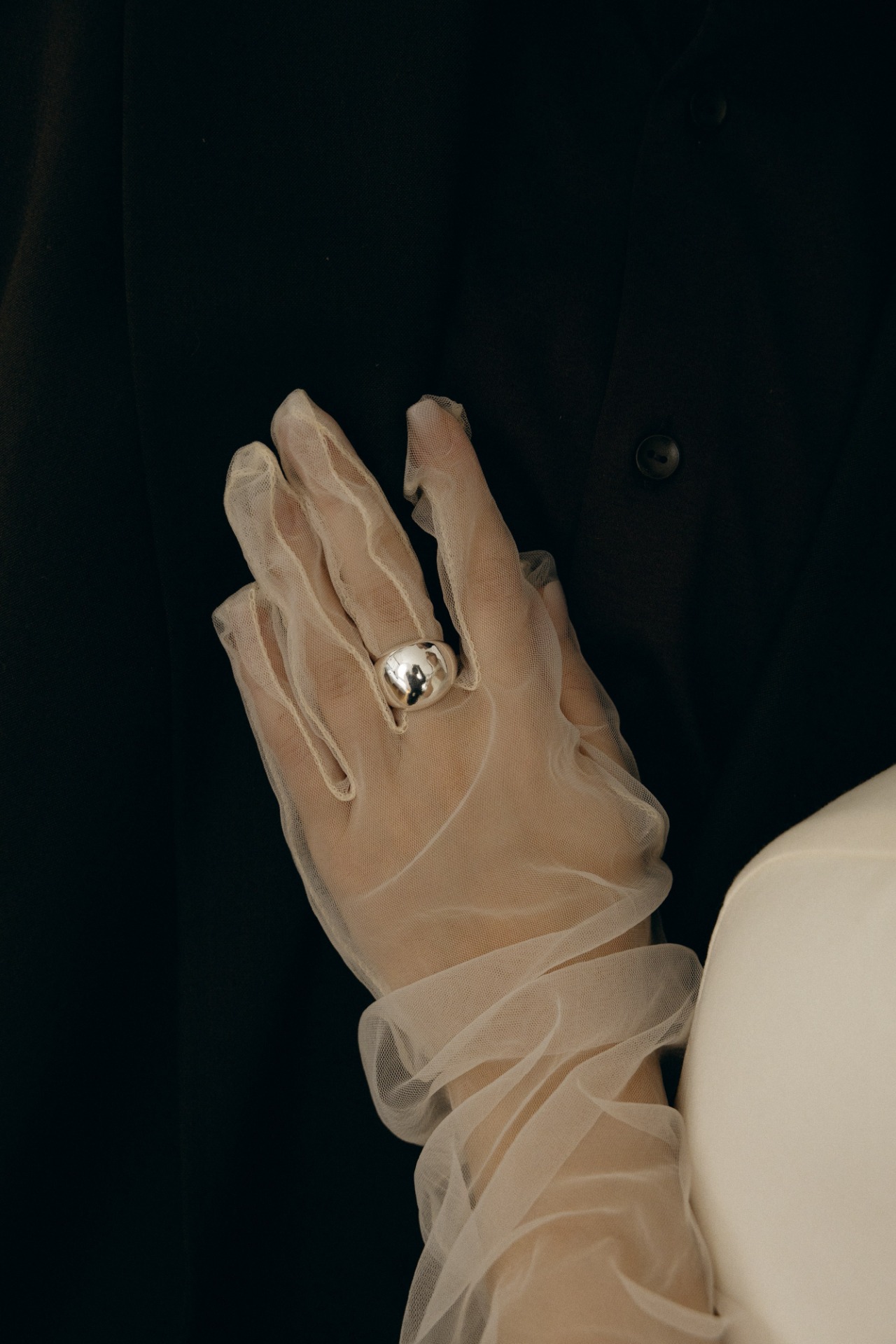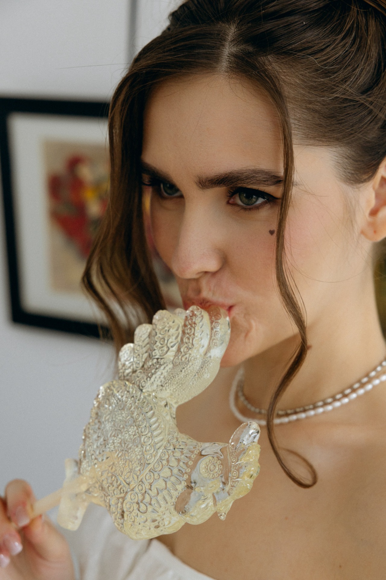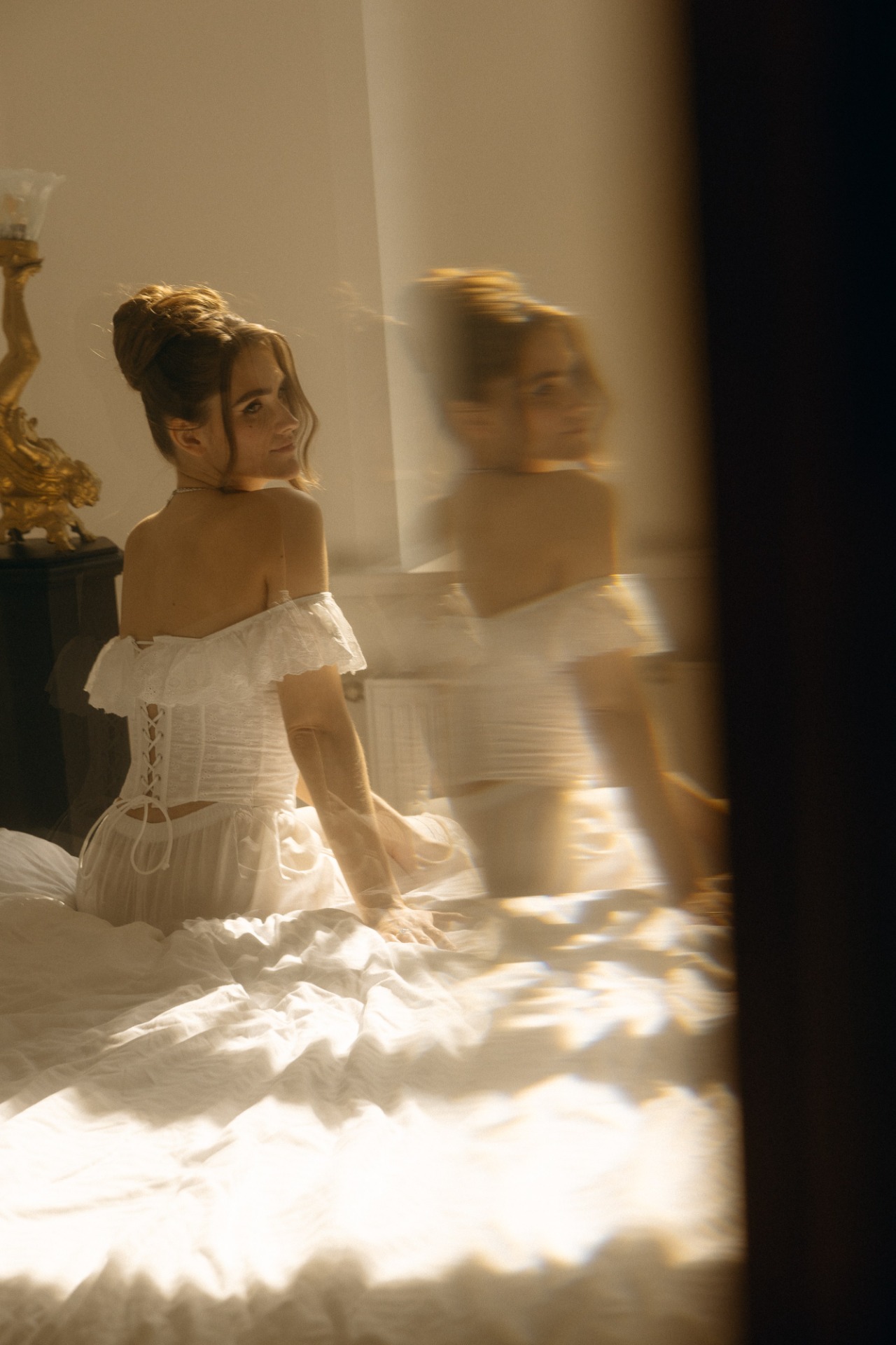Мой образ тоже был выдержан в древнерусском стиле на новый лад: высокий пучок, белый хлопковый корсет, кружевные панталоны, балетки-лапти. В процессе долгих поисков основного образа я случайно нашла бренд Monreve и платье сливочного цвета на одно плечо с необычной юбкой. Образ дополняли туфли в тон, прозрачные перчатки, сумка-сердце и маленькое сердечко на щеке в качестве мушки.