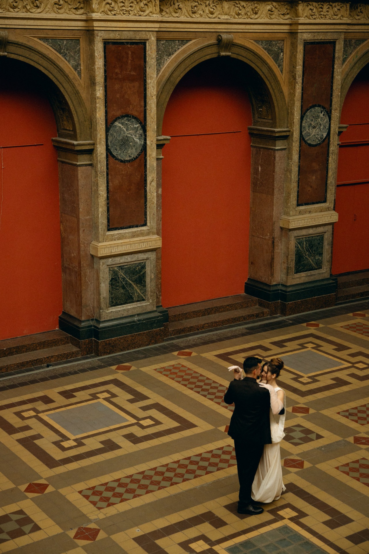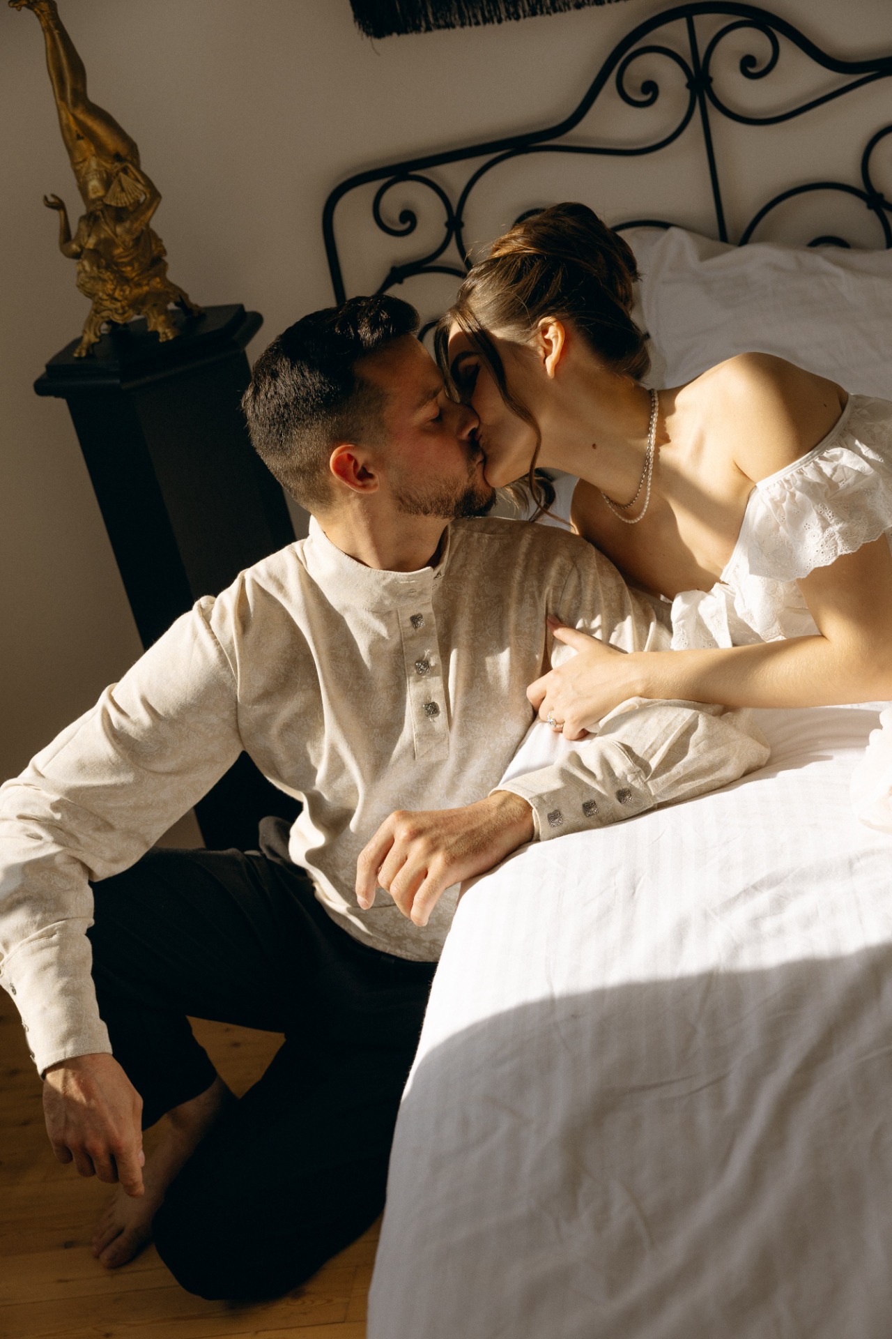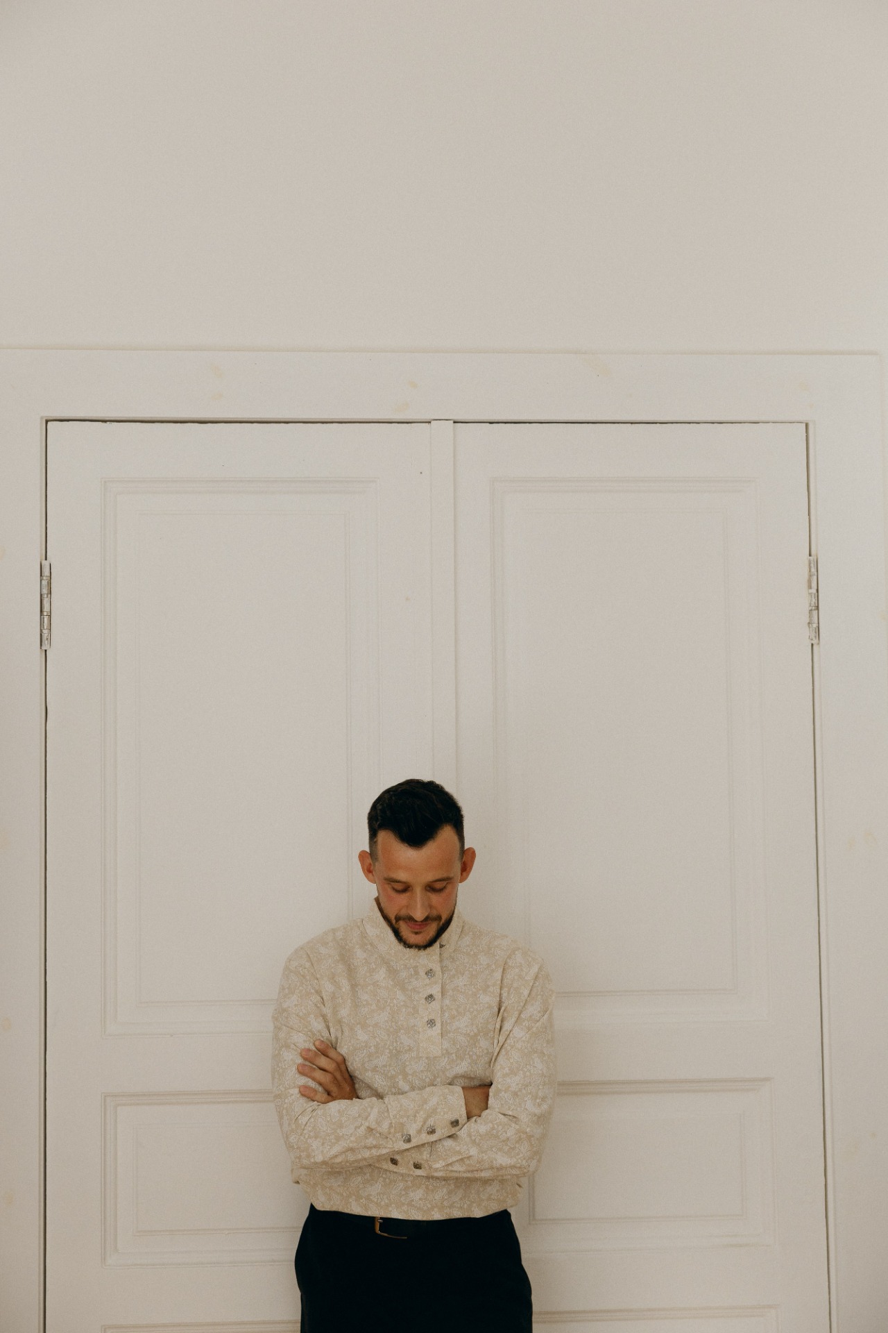 Образы для основной свадьбы и росписи мы решили сделать разными. В Северной столице утром Роман был в чёрных брюках в стиле old money и бежевой рубашке с принтом a la Russe, а в качестве основного образа он выбрал классический total brown.