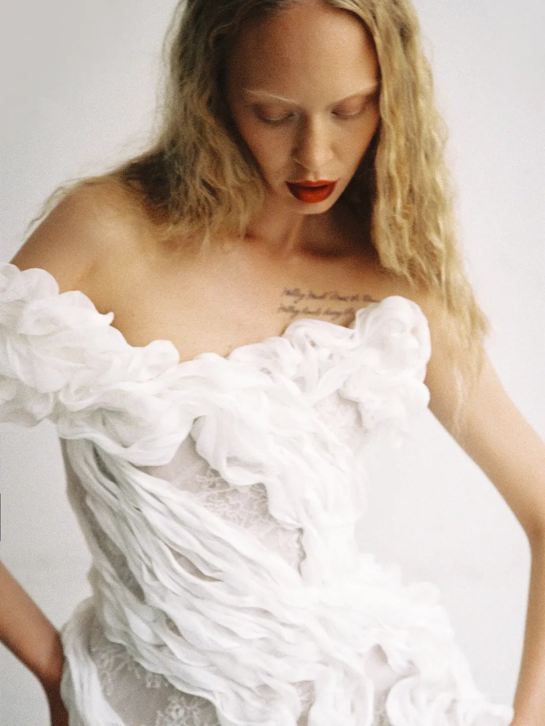 К этому времени платье уже почти готово, и внимание сосредоточено на посадке, деталях и удобстве. Важно примерить его с будущей обувью и бельём, а также провести финальную примерку полностью готового платья с отделкой, фурнитурой, фатой и аксессуарами.