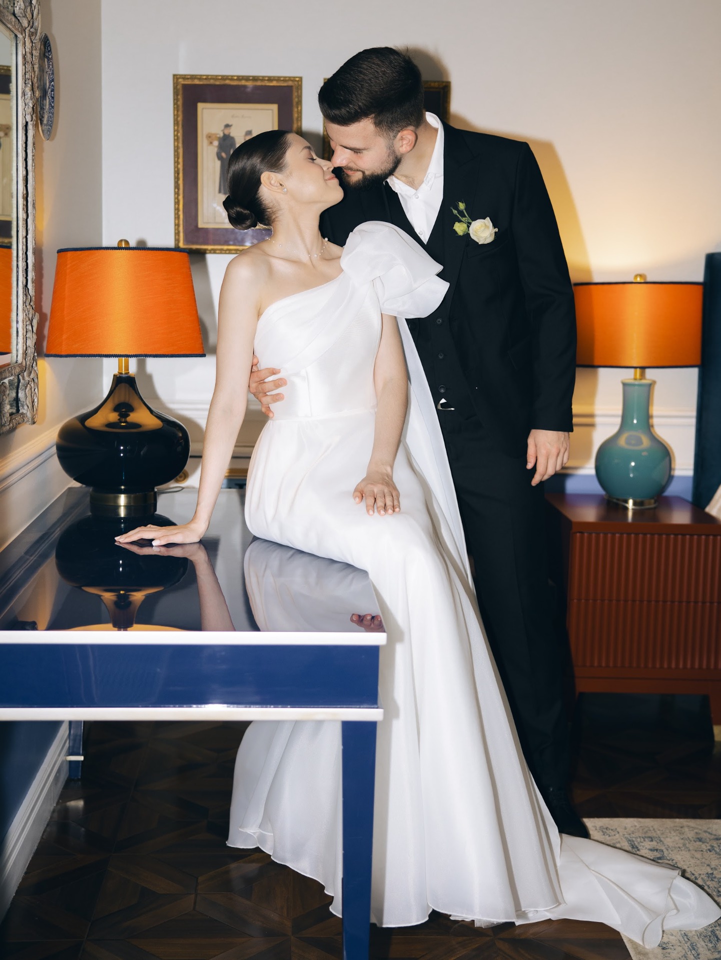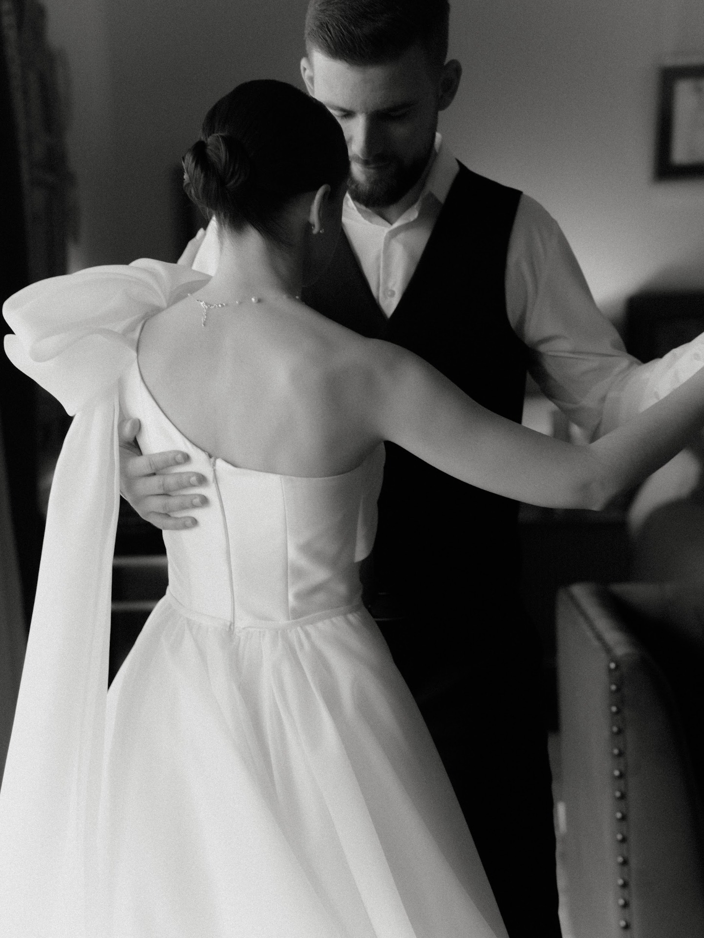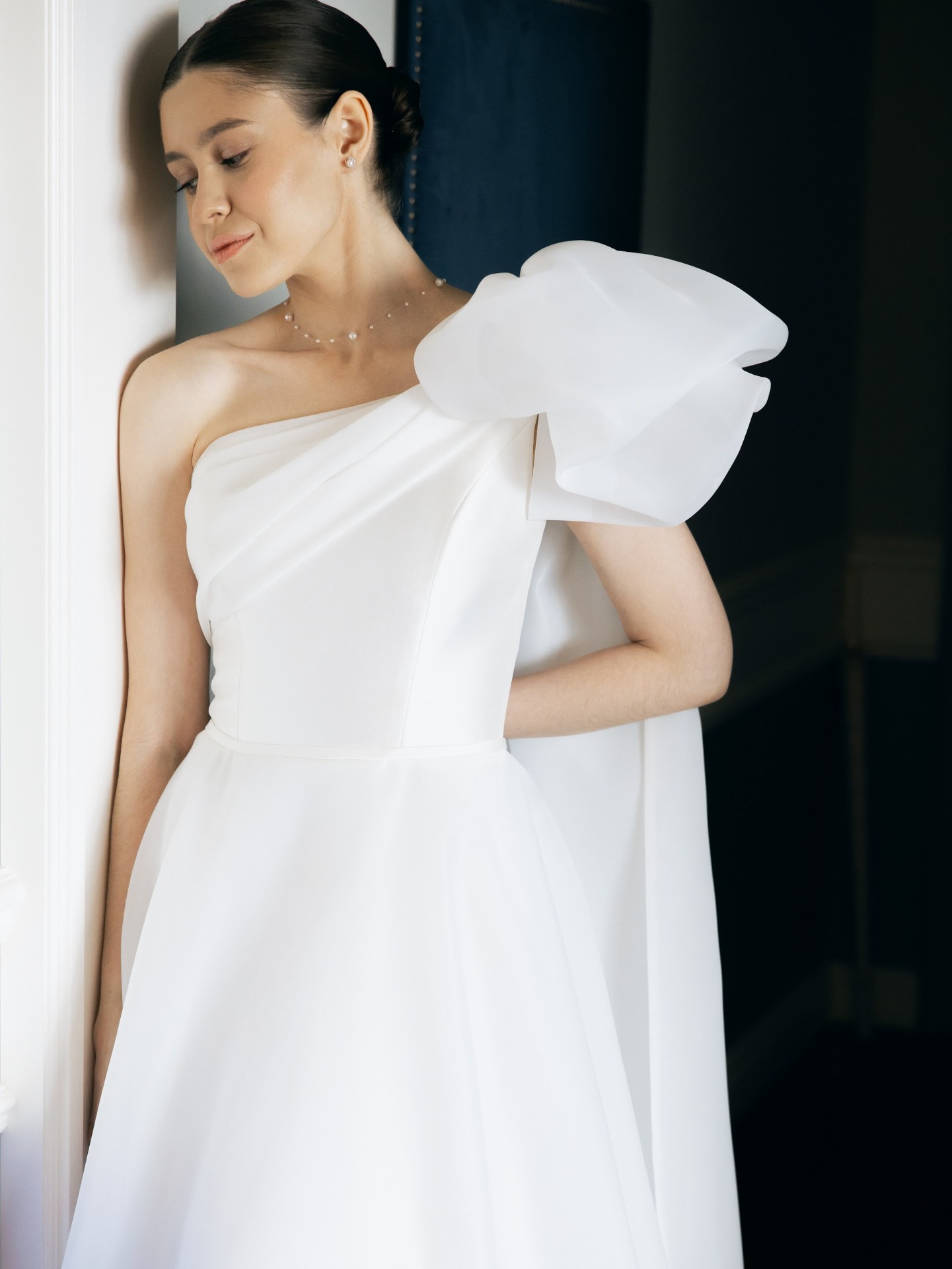 Невеста выбрала лаконичное, но изысканное платье с воланами — лёгкое и выразительное. Его нежный силуэт подчёркивал хрупкость и грацию невесты, а воланы добавляли романтики. Образ невесты дополнял букет из моно-цветов. Это был сдержанный, минималистичный, но при этом эффектный акцент.