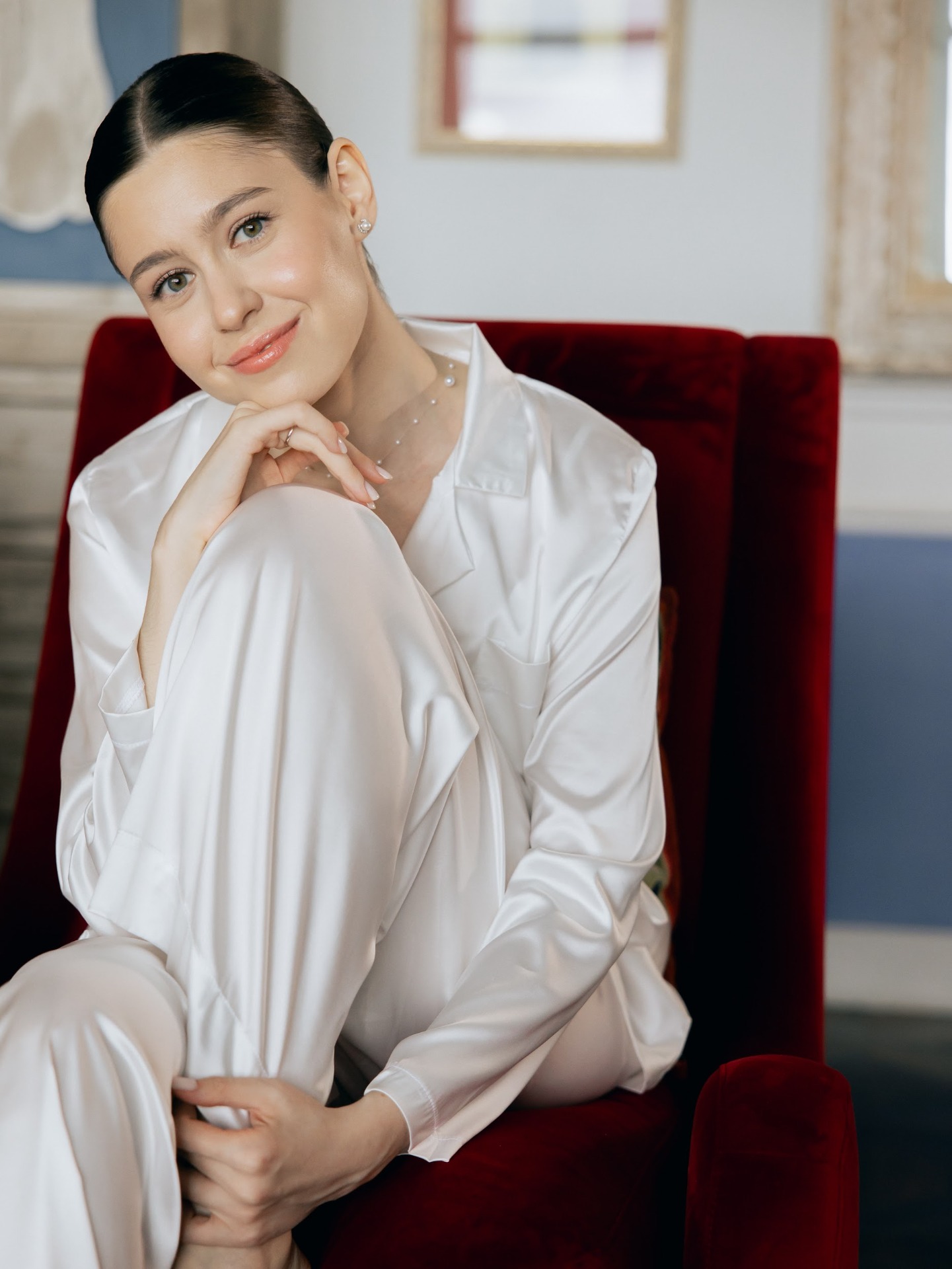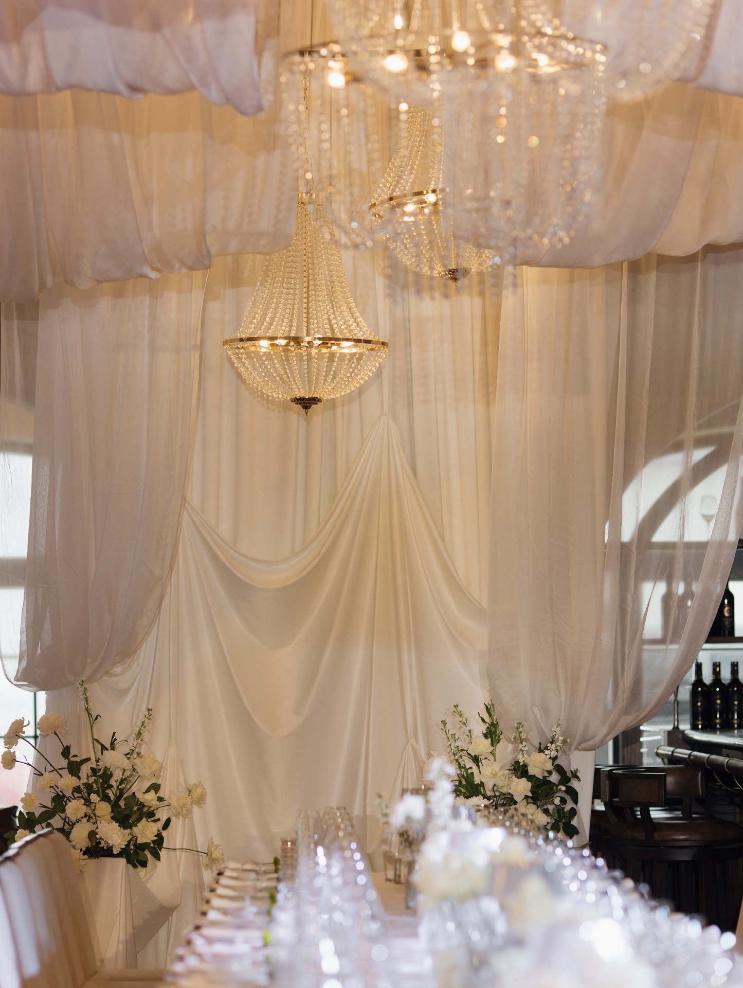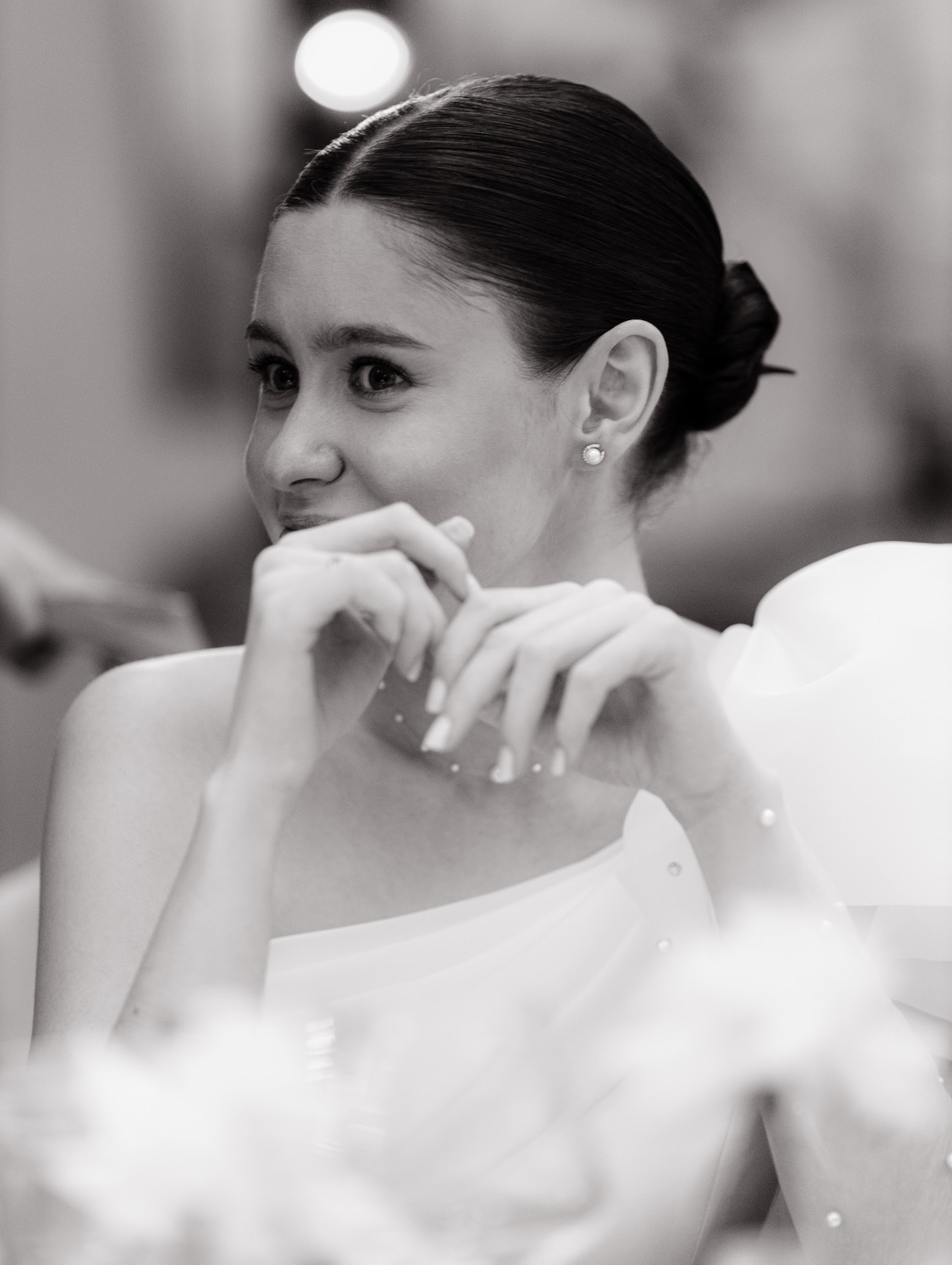 Невеста выбрала лаконичное, но изысканное платье с воланами — лёгкое и выразительное. Его нежный силуэт подчёркивал хрупкость и грацию невесты, а воланы добавляли романтики. Образ невесты дополнял букет из моно-цветов. Это был сдержанный, минималистичный, но при этом эффектный акцент.