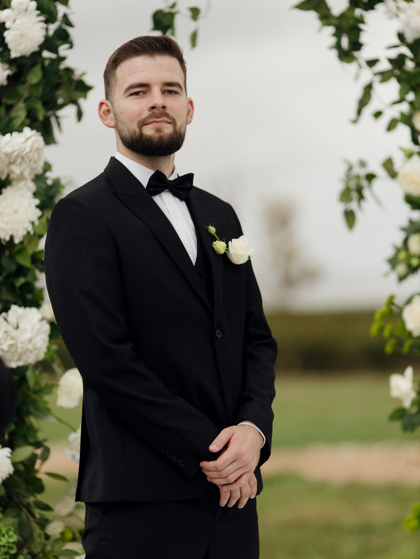 Жених был в классическом чёрном смокинге, он выглядел в нём безупречно.