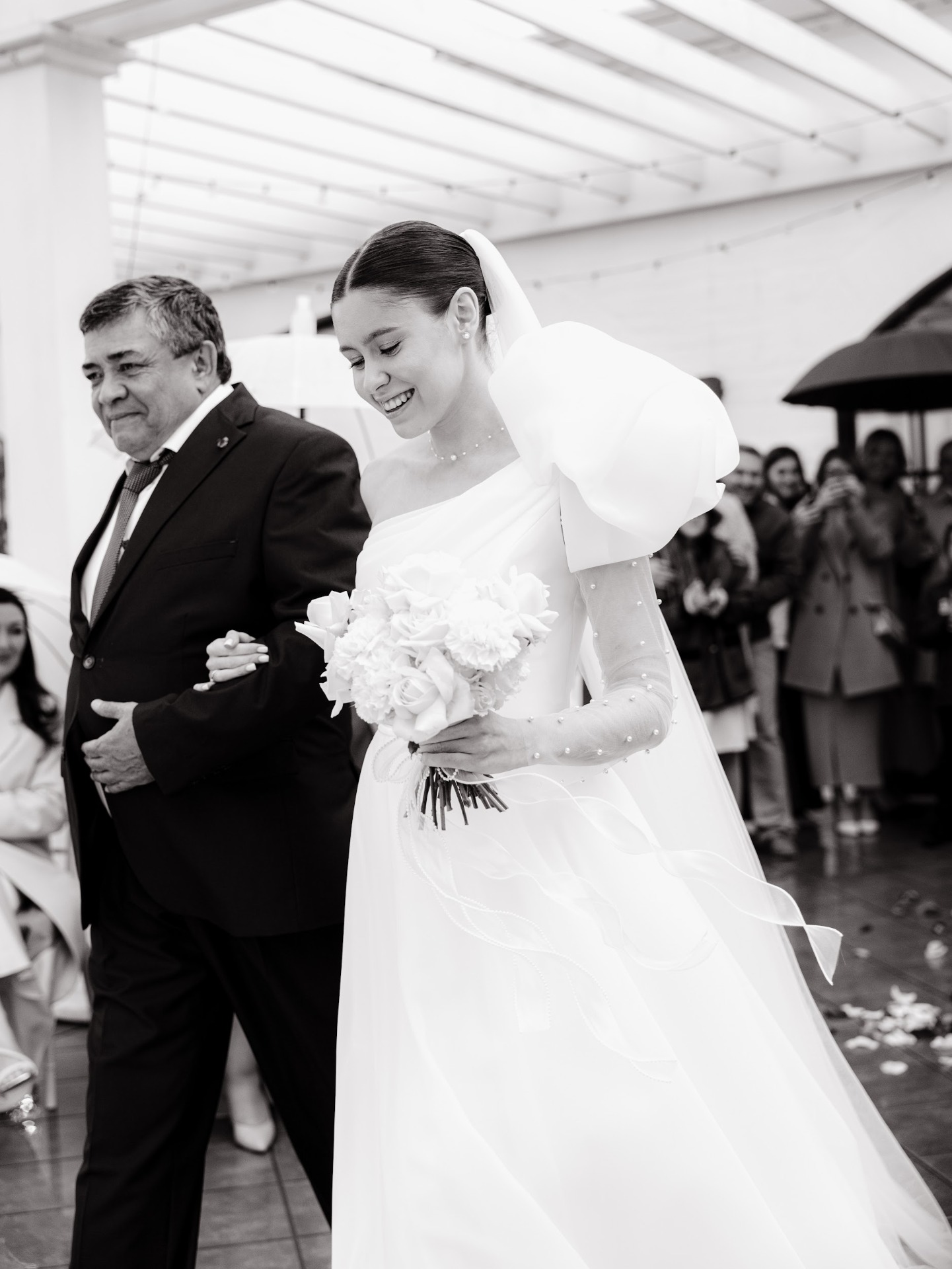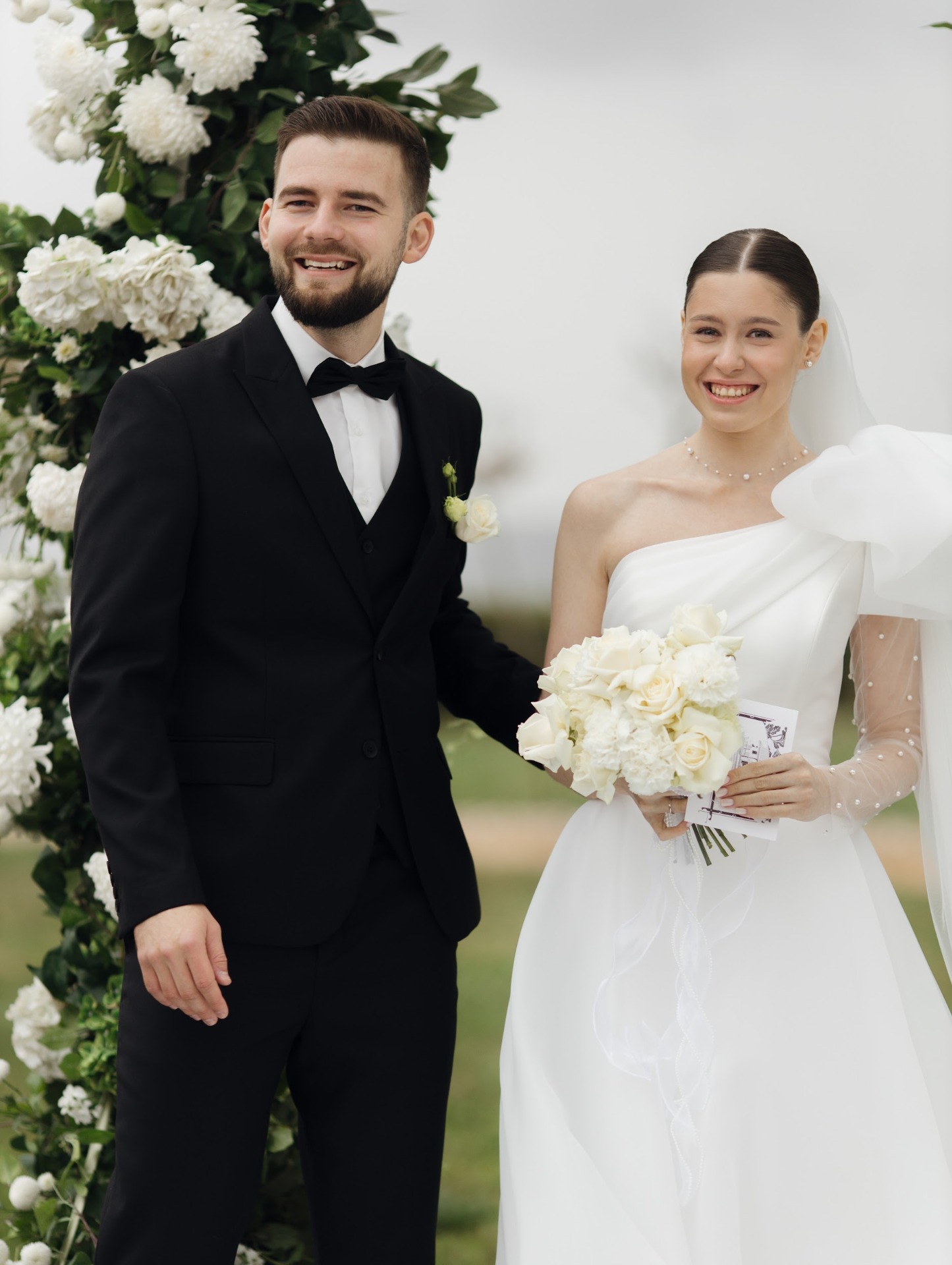Церемония получилась невероятно трогательной. Воздушная флористика, музыка и запах дождя в воздухе — всё создавало атмосферу лёгкости, чистоты и нежности.