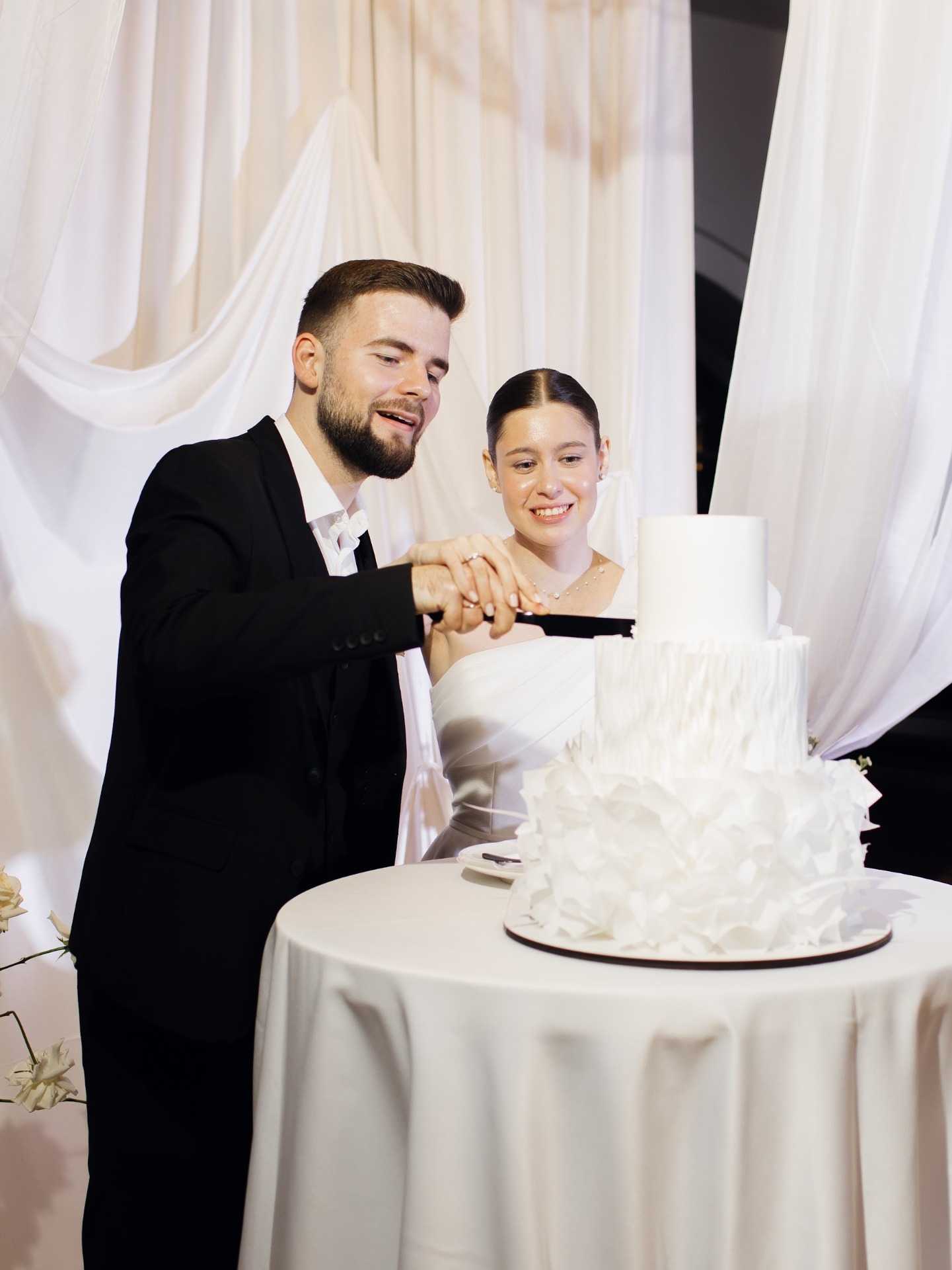 Финальный штрих — торжественная подача торта. Он был оформлен в том же стиле, что и всё остальное: сдержанно, романтично, с акцентом на текстуры и детали. Он словно подвёл тонкую черту под всем праздником.