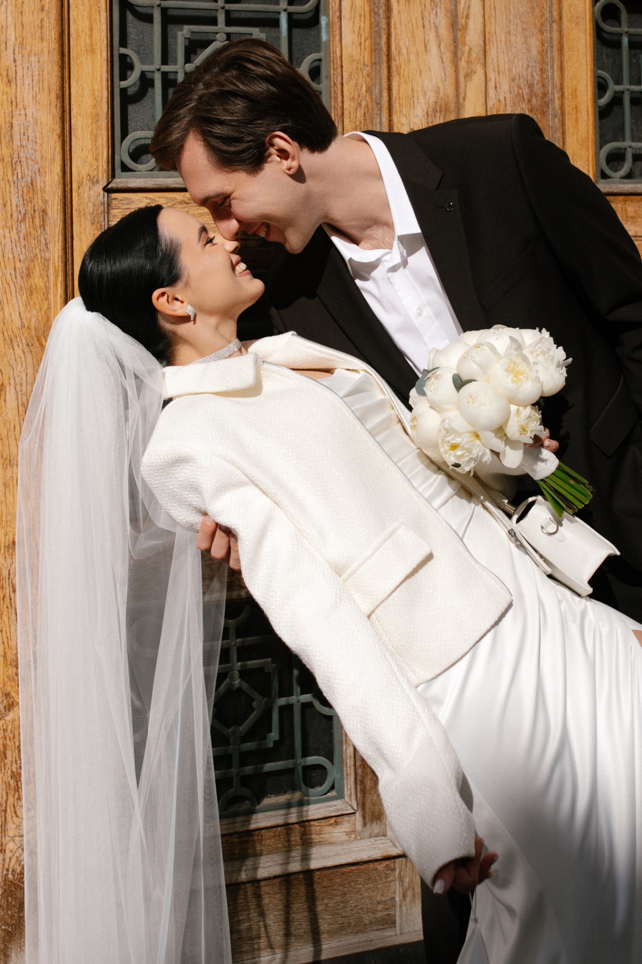 Образ жениха подобрали у бренда Cacharel: коричневый, элегантный, итальянский костюм, который ему идеально подошёл.