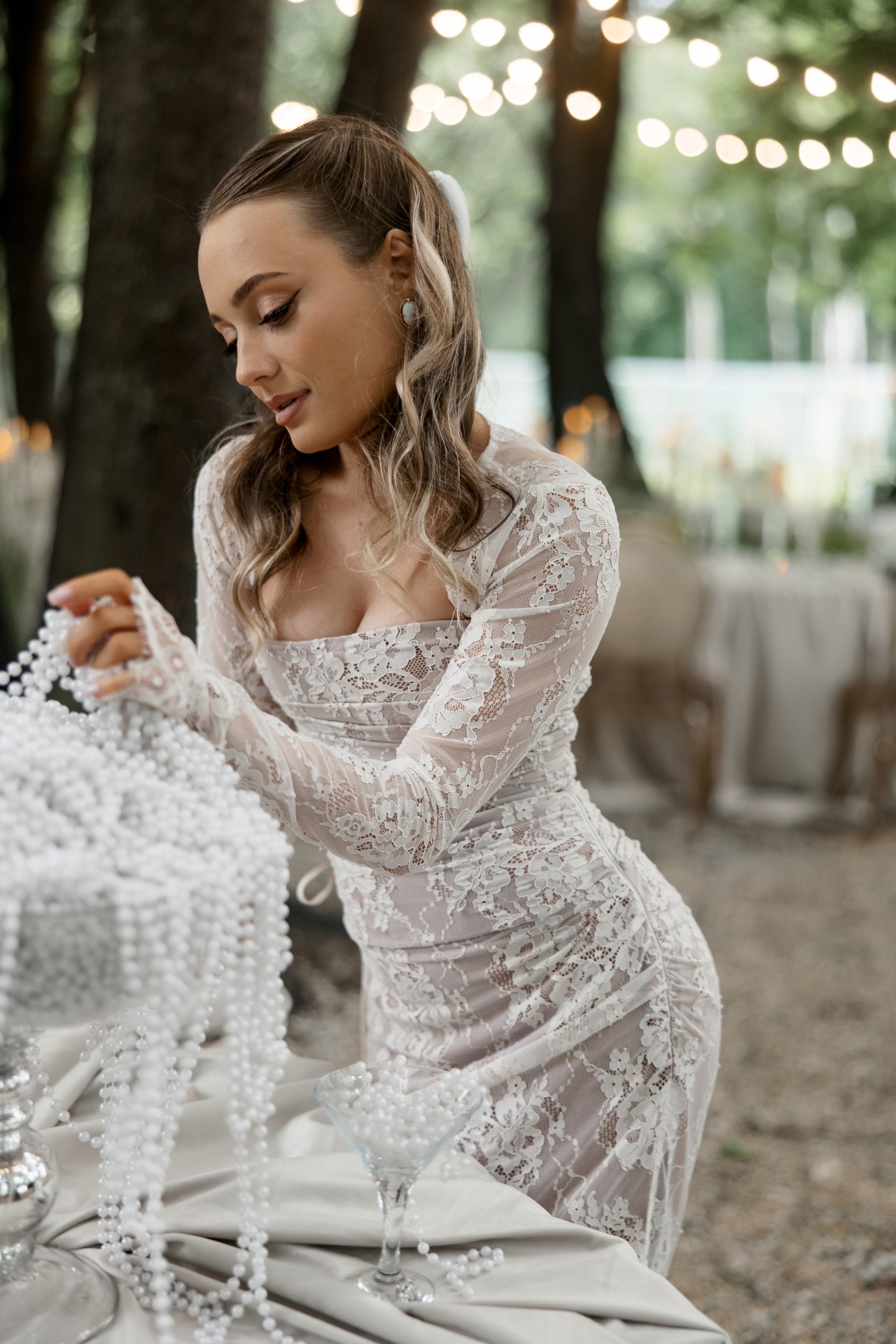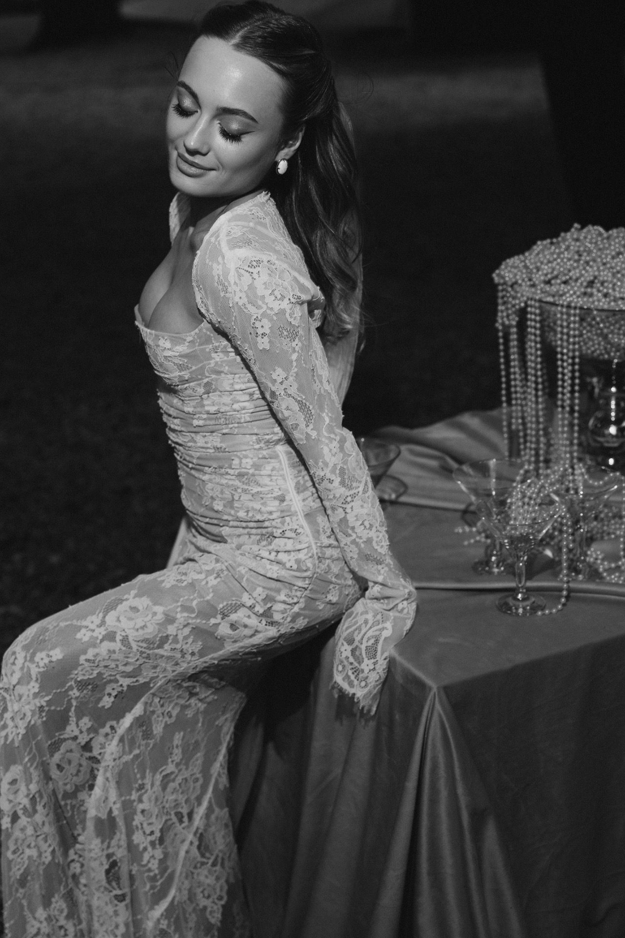 Арина — очень миниатюрная и стройная девушка, скрывать это было бы преступлением. На ней было обтягивающее платье с нежно-розовой подкладкой и молочным кружевом сверху. Длинные рукава, шнуровка на спине и изящное декольте стали тонкой, но выразительной «изюминкой» образа.