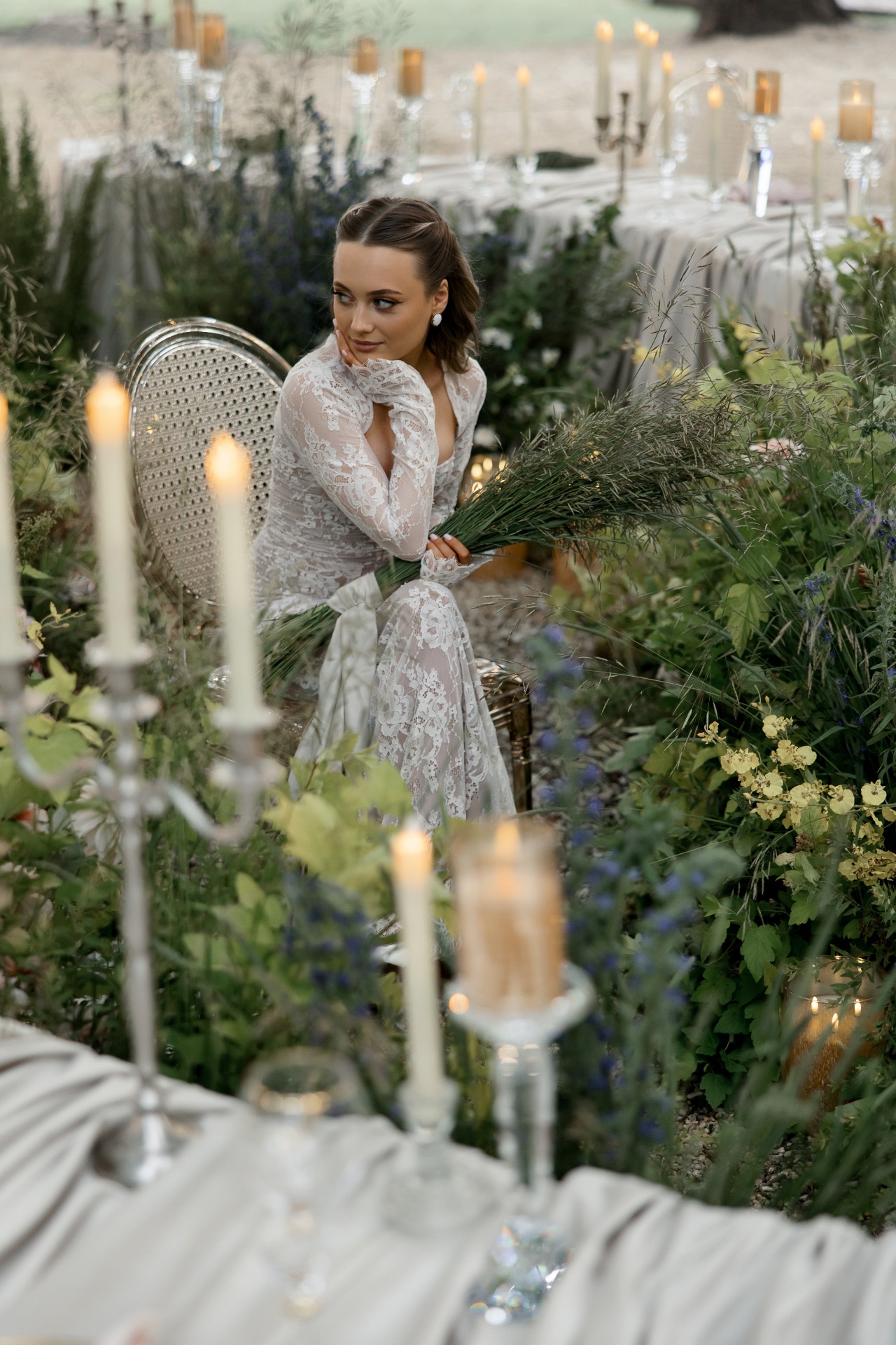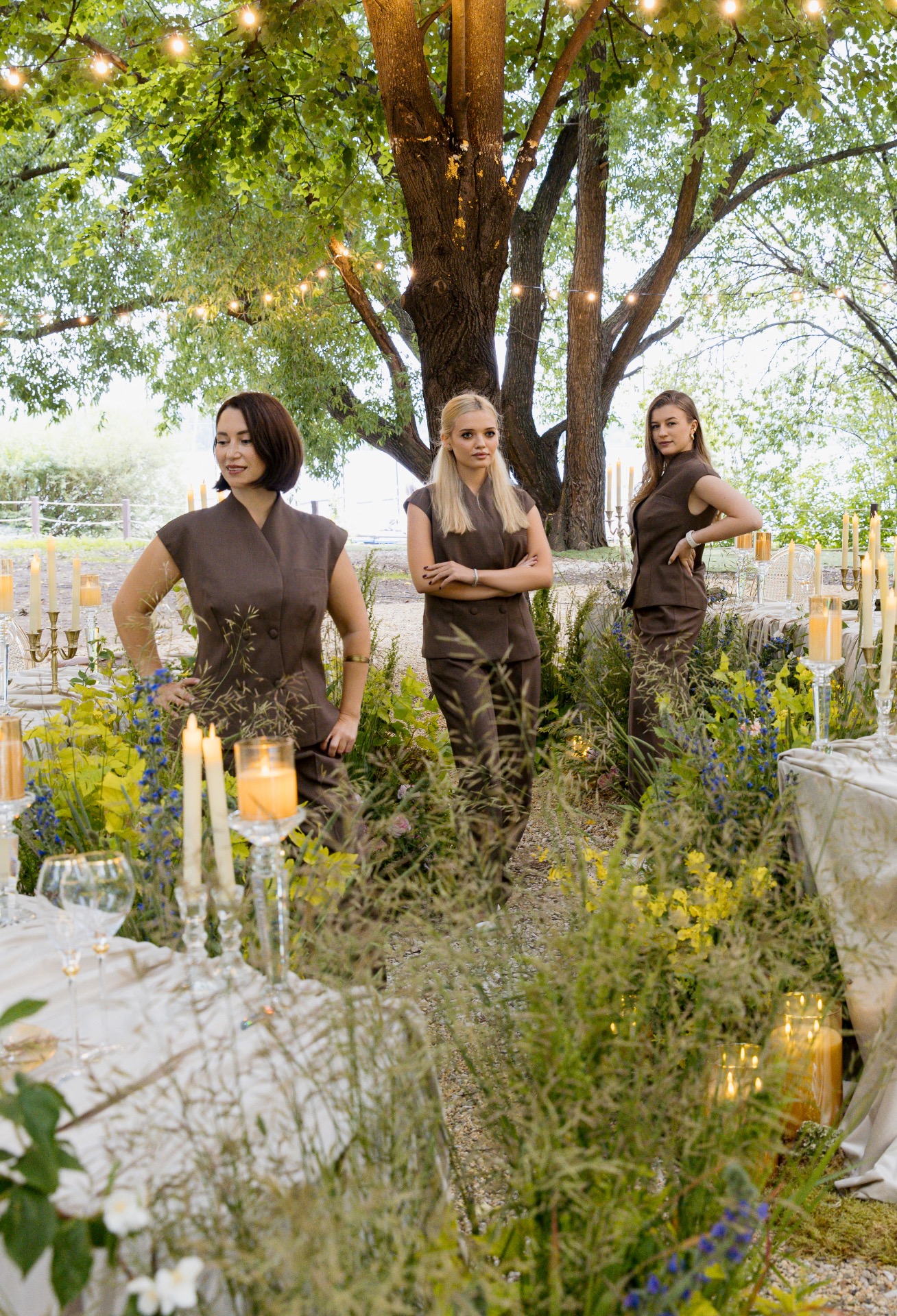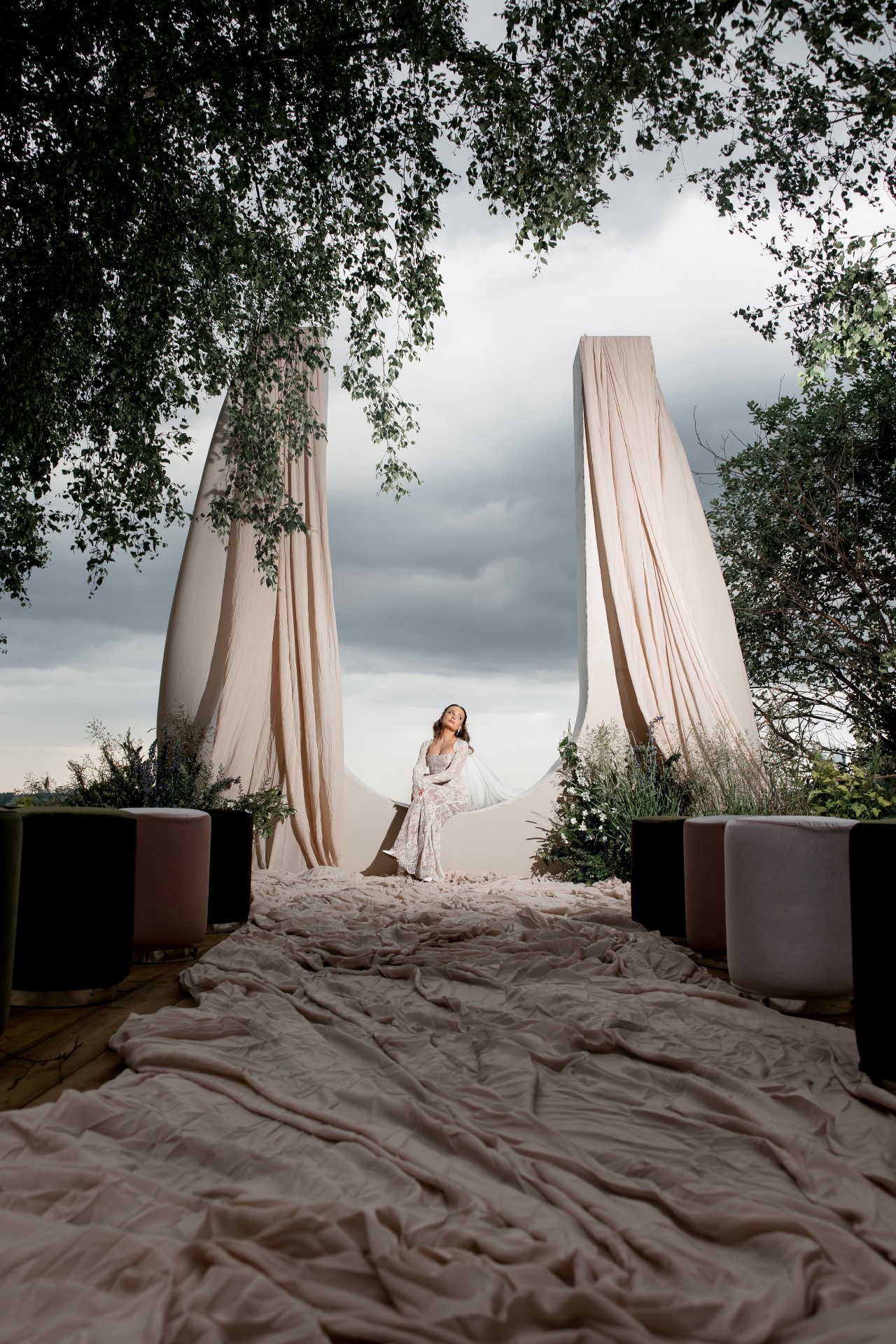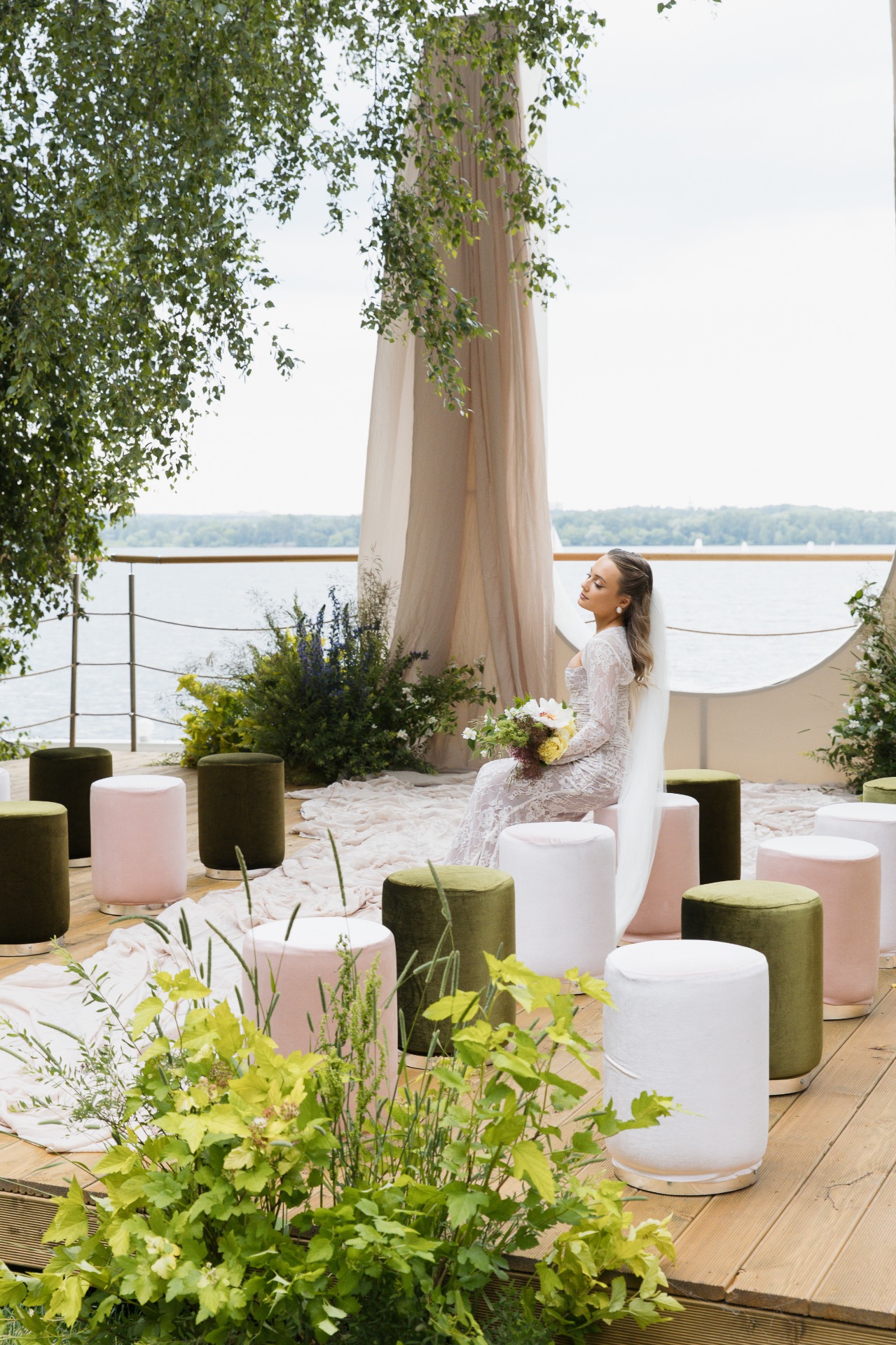 В оформлении соединились натуральные зелёно-бежевые оттенки с модными акцентами розового и салатового. Было много зелени, живой ткани, света и свечей — всё было про лёгкость и нежность момента.