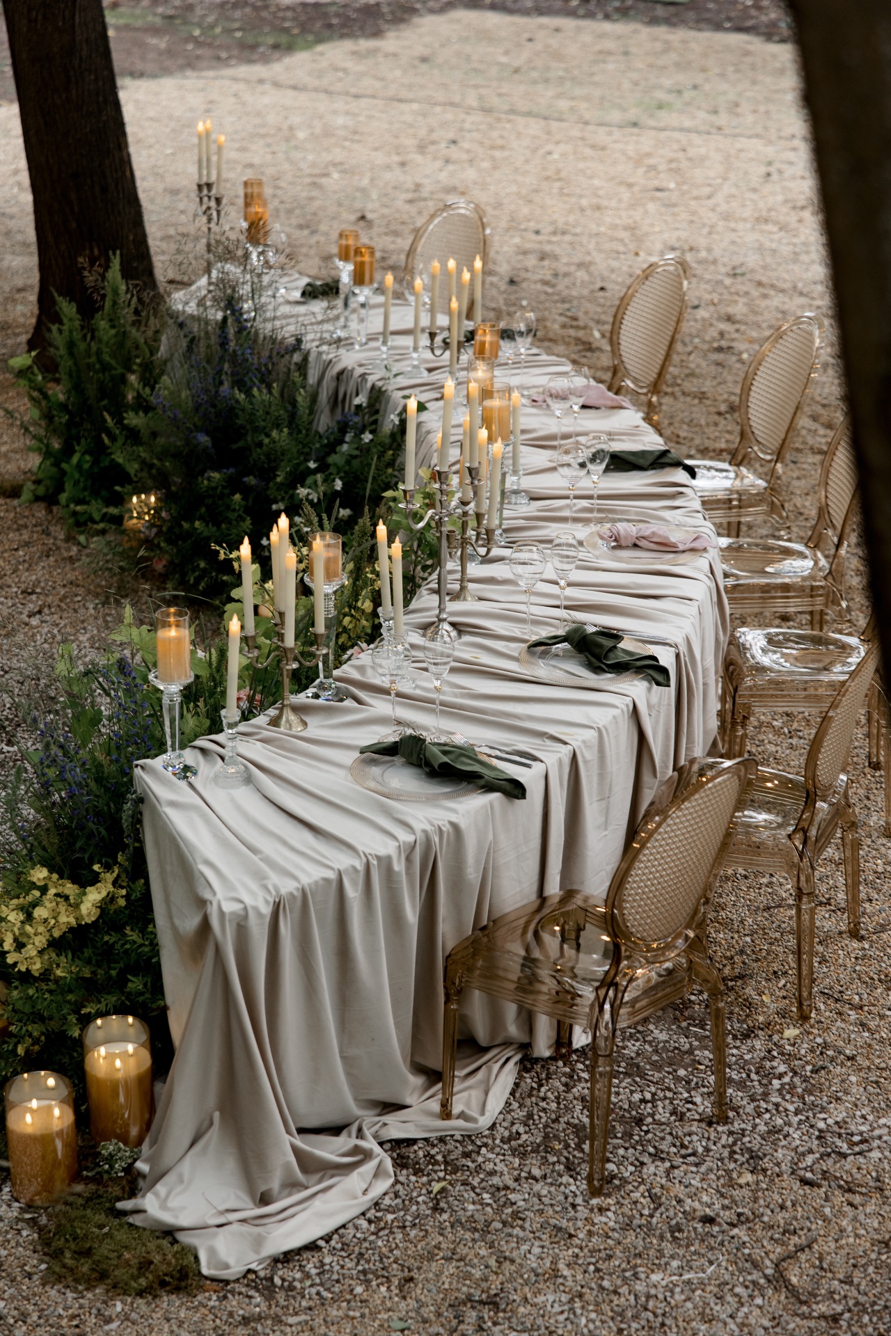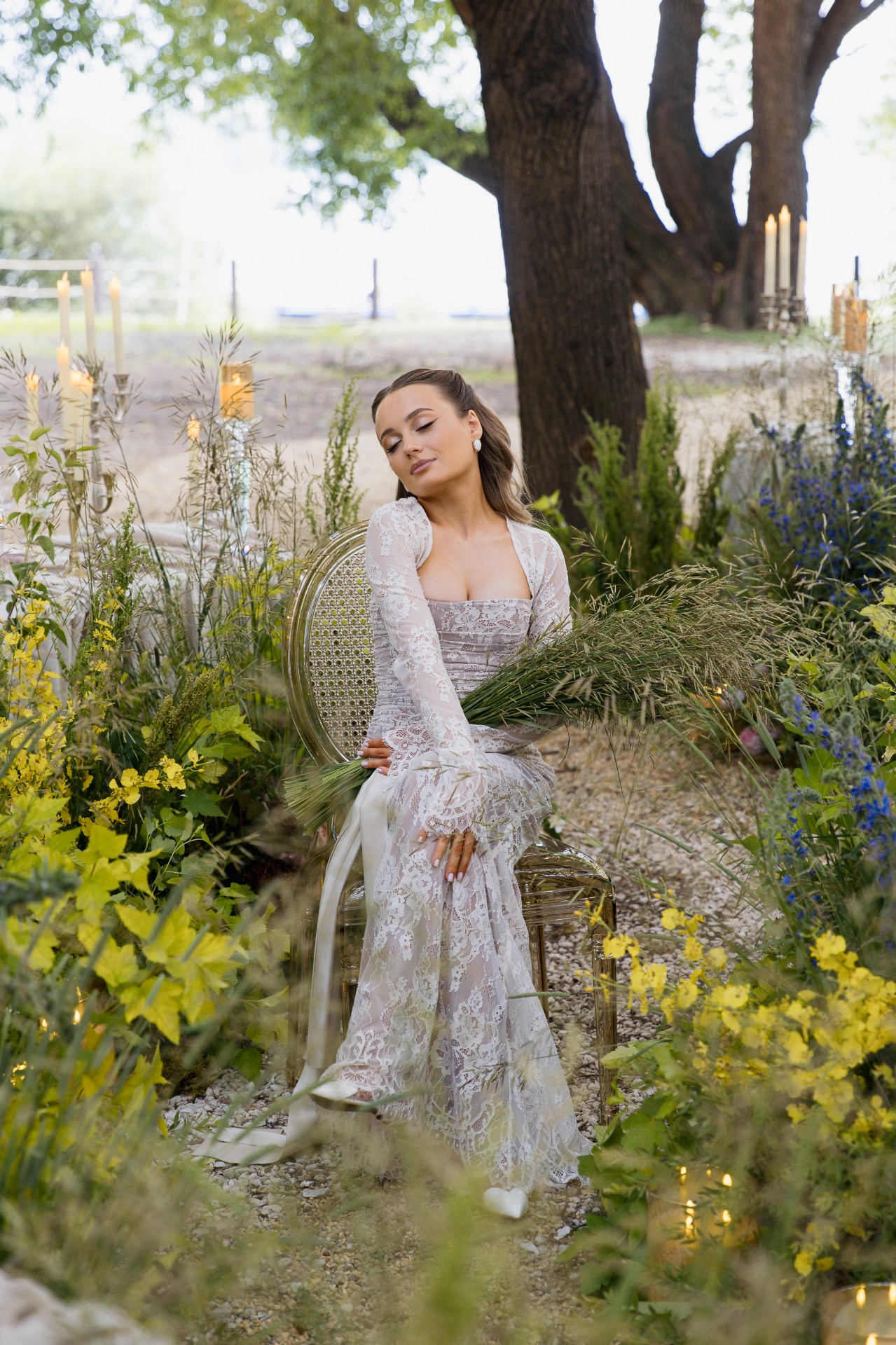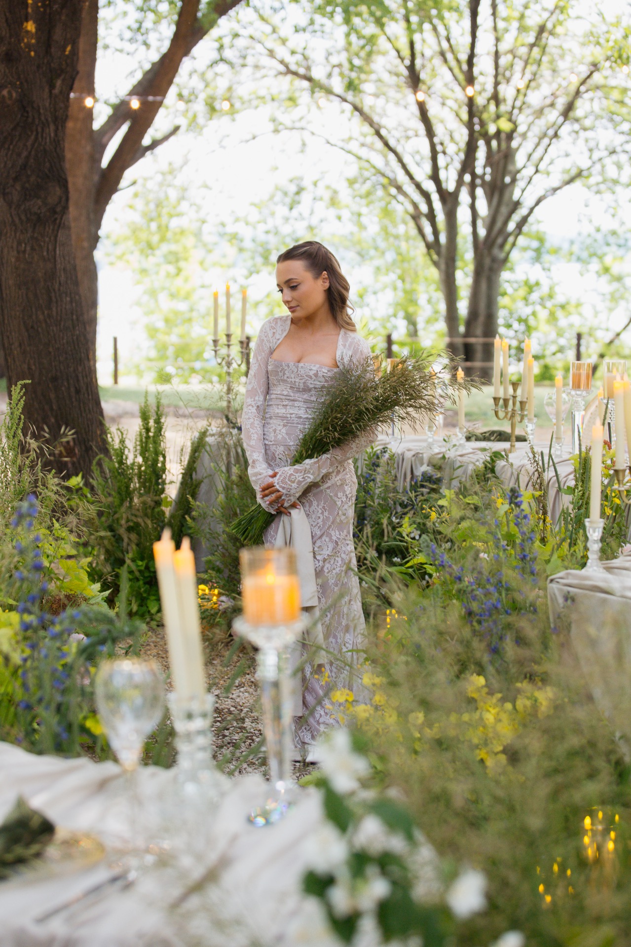 В оформлении соединились натуральные зелёно-бежевые оттенки с модными акцентами розового и салатового. Было много зелени, живой ткани, света и свечей — всё было про лёгкость и нежность момента.
