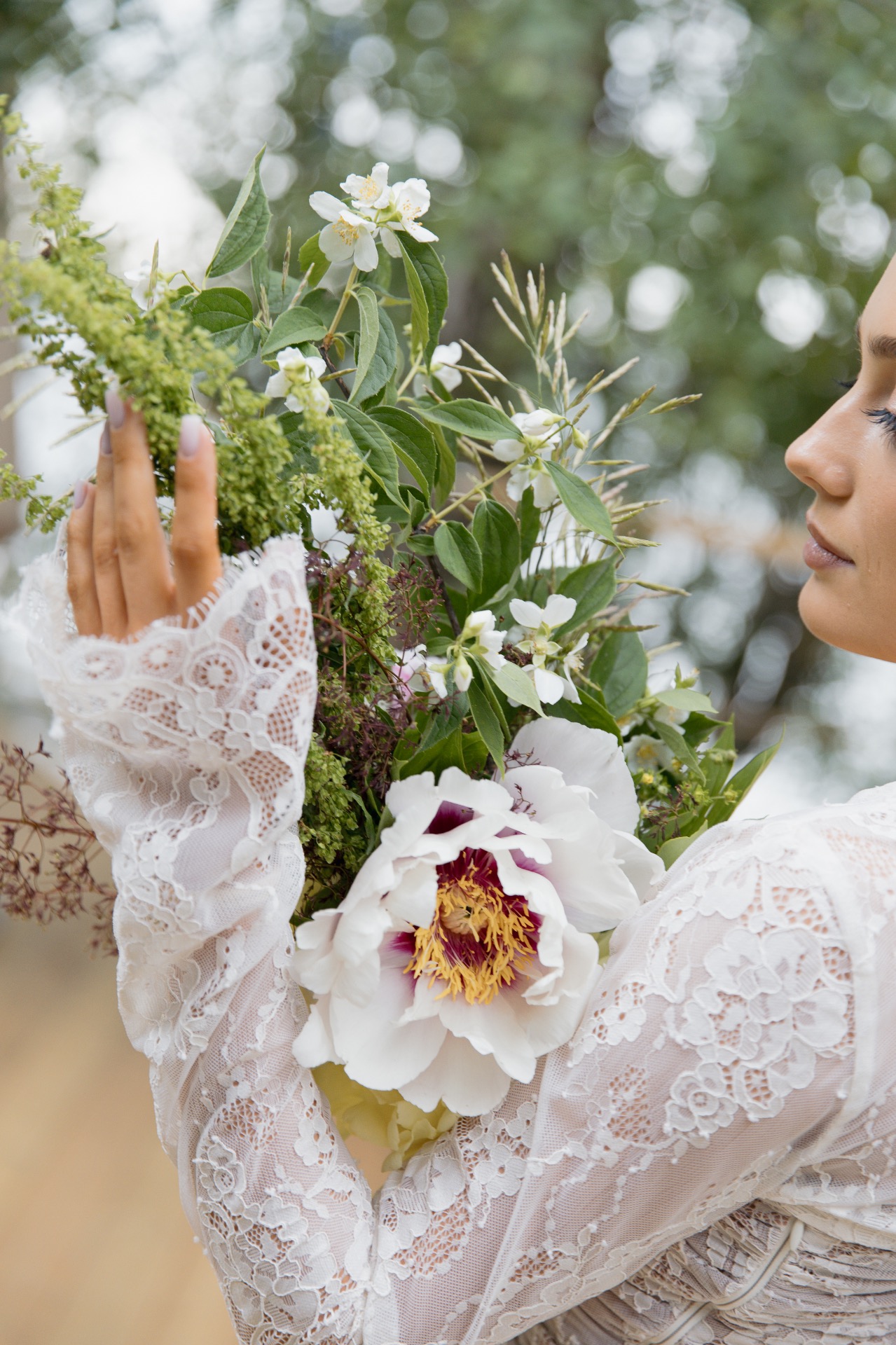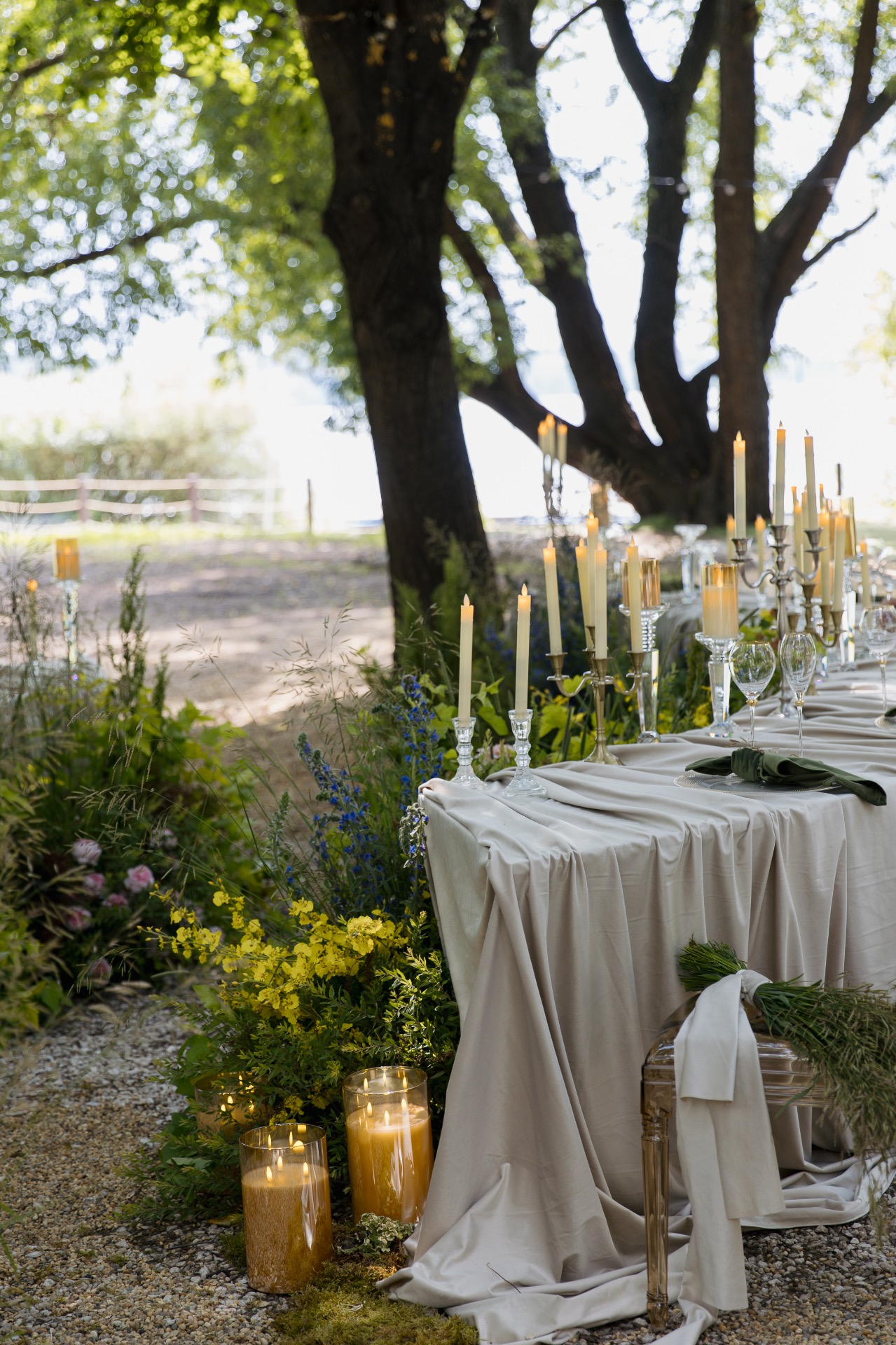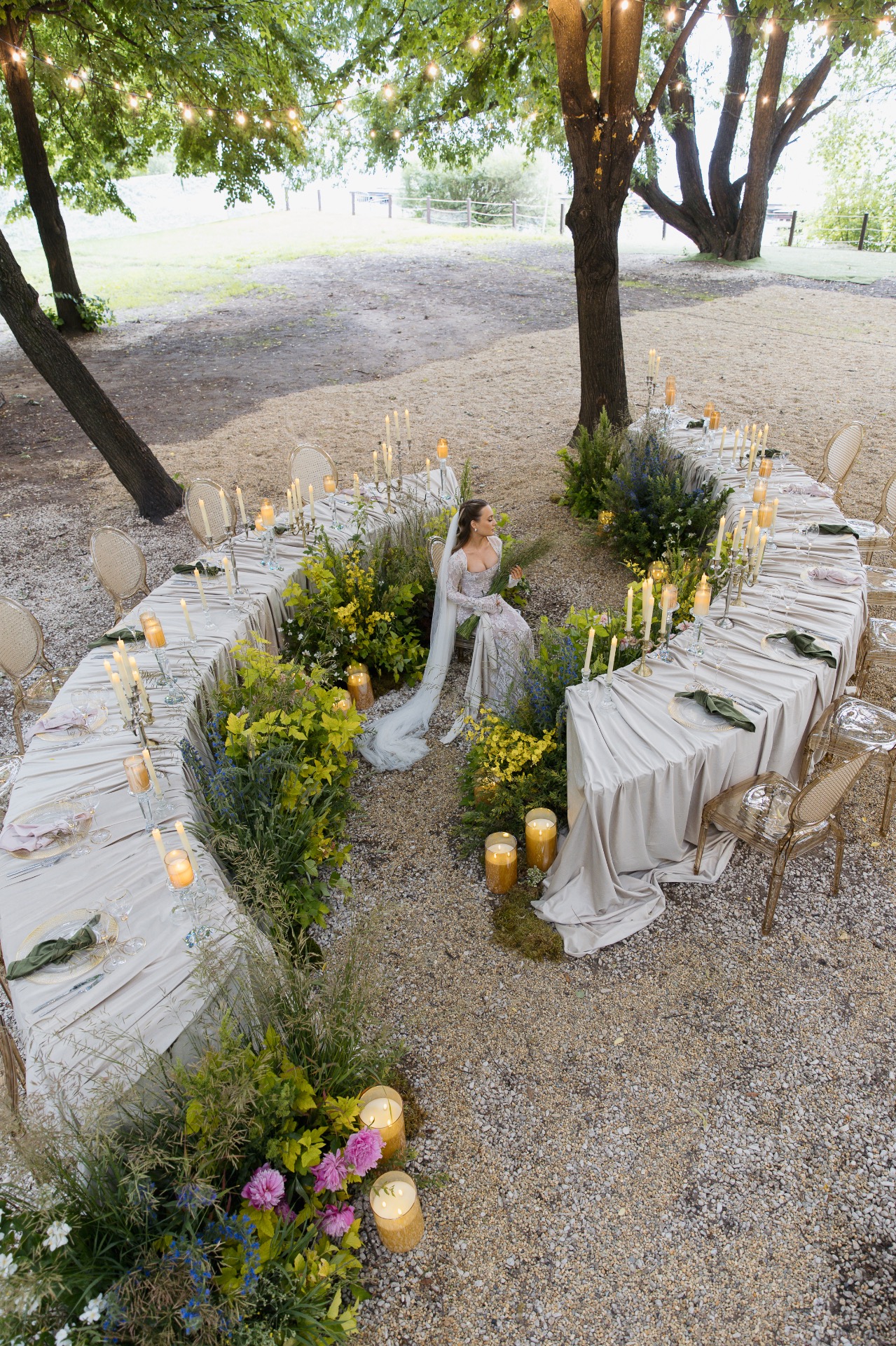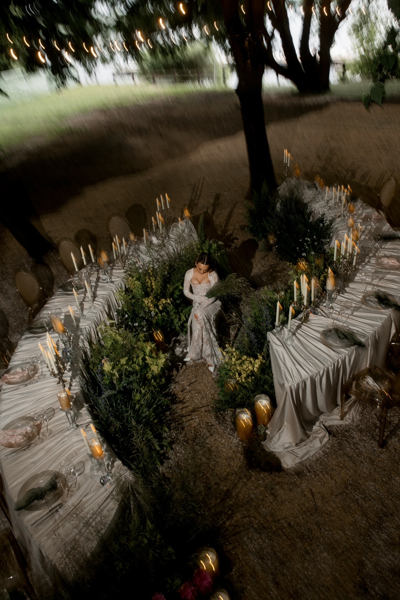 В оформлении соединились натуральные зелёно-бежевые оттенки с модными акцентами розового и салатового. Было много зелени, живой ткани, света и свечей — всё было про лёгкость и нежность момента.