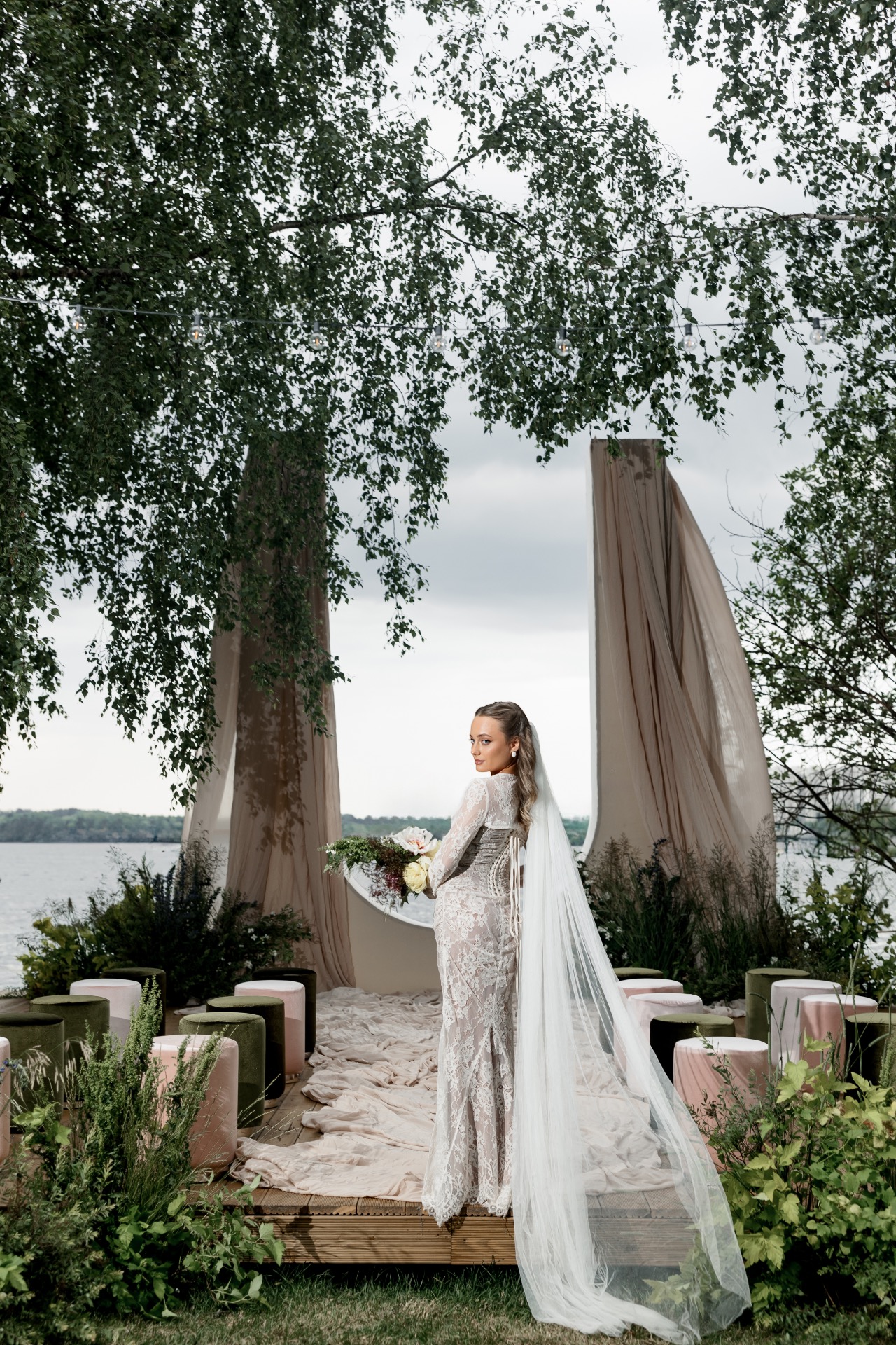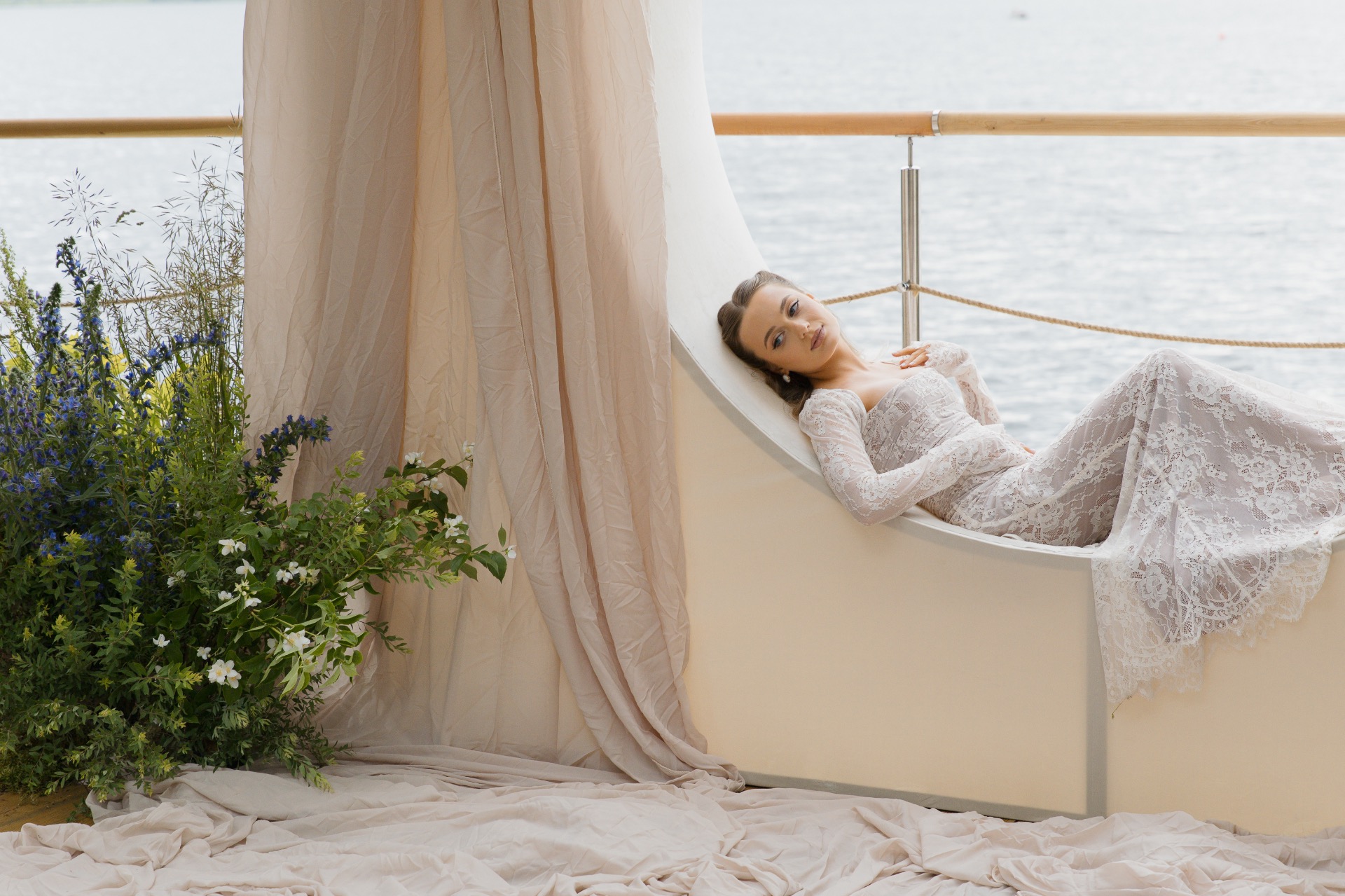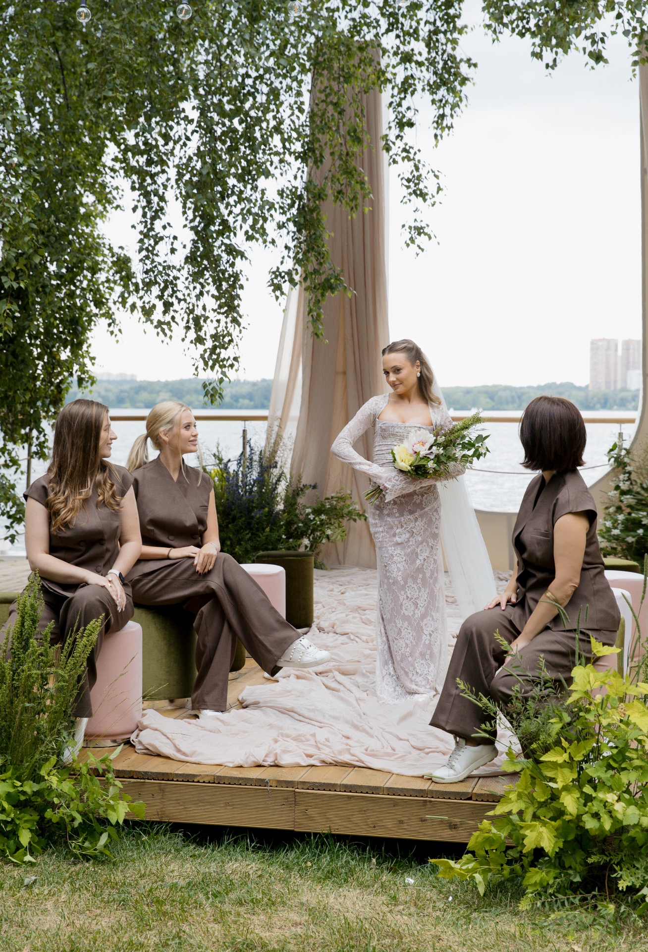 Гостей встречали интерактивные головоломки в велком-зоне, были танцы босиком на пирсе, а к алтарю невесту вёл отец. Главной подружкой была её любимая сестра.