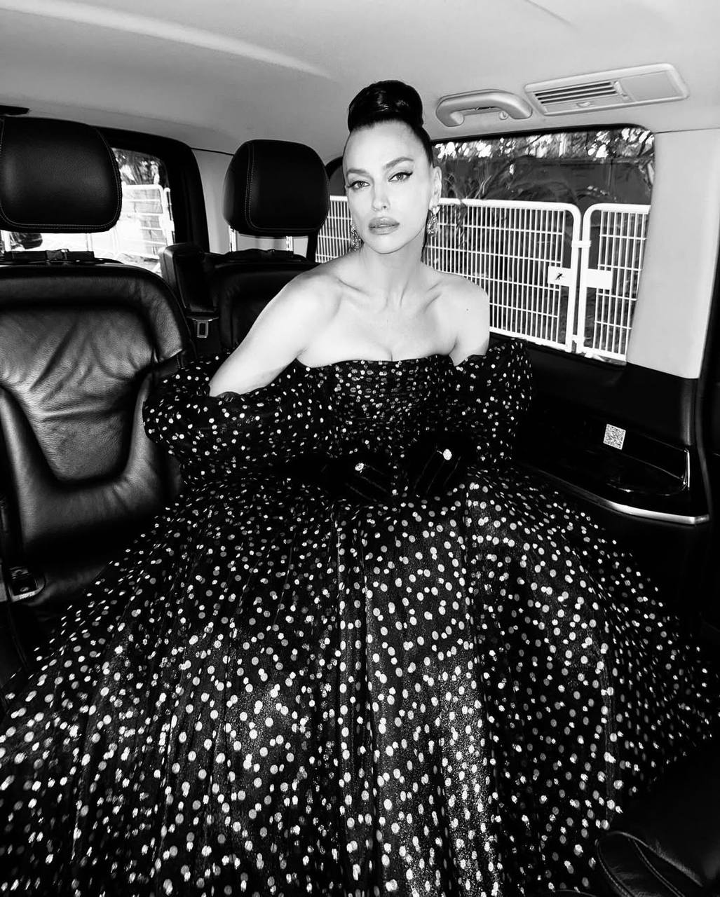 Российская супермодель Ирина Шейк удивила публику неожиданно сдержанным и элегантным образом от Armani Privе. В отличие от своих прошлых, более откровенных выходов, Ирина выбрала чёрно-белое платье в горошек из коллекции осень-зима 2019.