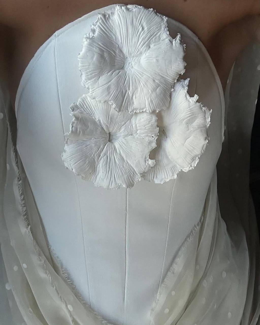 Свадебный дизайнер Ориа Азран представила впечатляющий образ в платье собственного бренда Oria Azran Bridal Couture, которое сочетает в себе минимализм, скульптурность и арт-акценты.