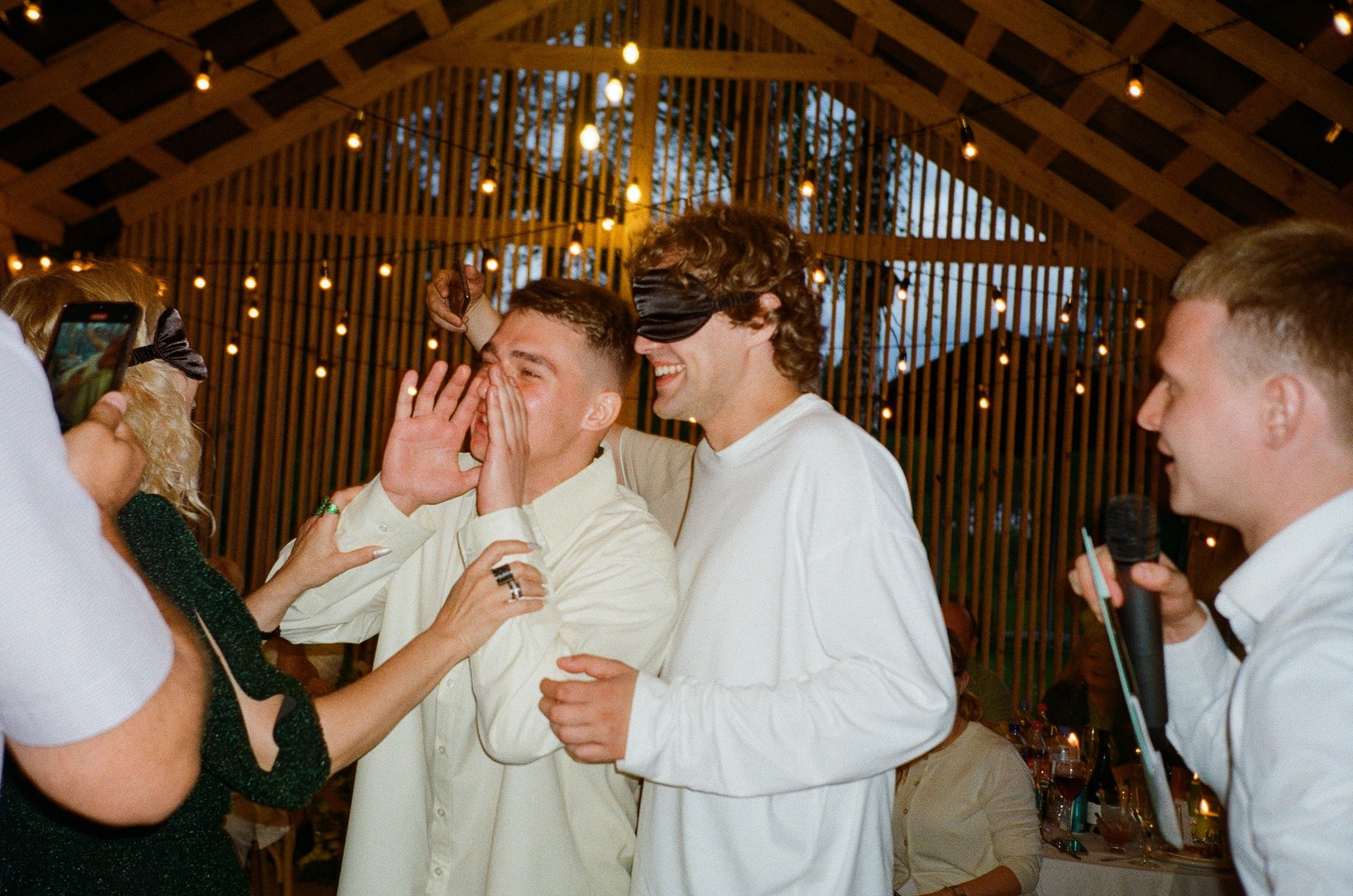 Поскольку на свадьбе были и взрослые, и молодёжь, мы старались сделать праздник весёлым и комфортным для всех. Были и традиционные активности: каравай, бросание букета, сбор на мальчика и девочку. Но были и неожиданные фишки для молодёжи: мы снимали про нас Reels, подвязку не бросали, парни за ней бегали челноком, а в финале мы раздавали гостям татуировки с нашими лицами.