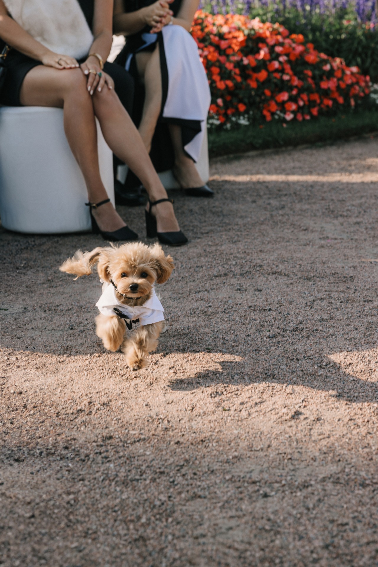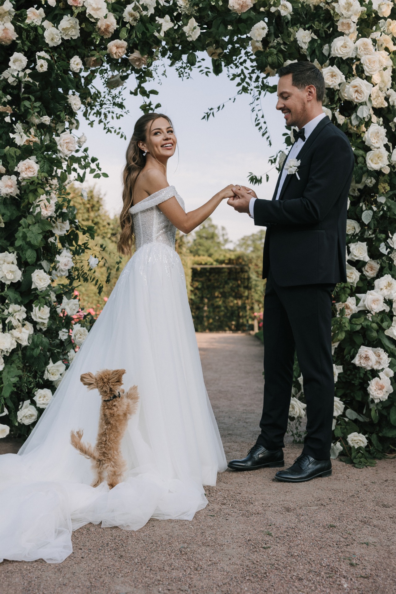 На церемонию меня вёл папа. Сама церемония была до слёз трогательной. В конце к нам выбежал наш пёсик Ерошик с колечками, закреплёнными на спине.