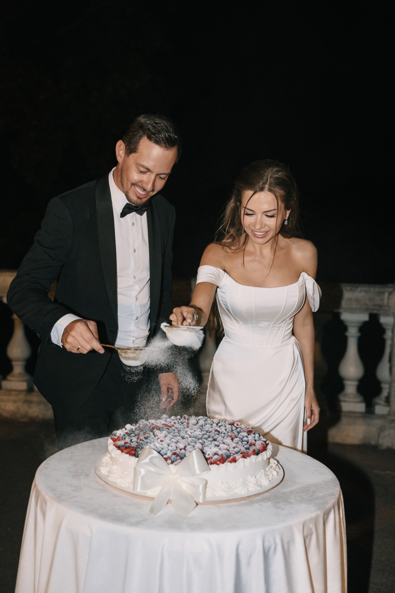Курсовая подача блюд, много тёплых пожеланий, наш первый танец, диджей, горка шампанского, торт, который мы сами посыпали сахарной пудрой. Без «горько» не обошлось :)