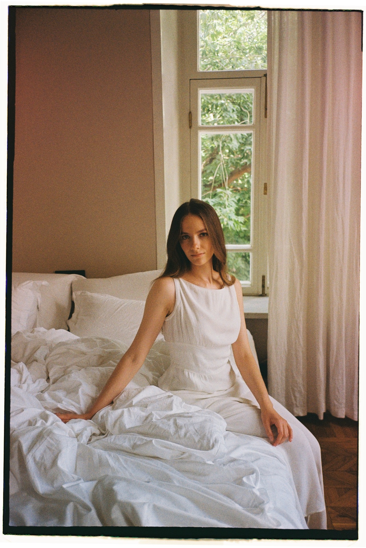 Утром, во время съёмки, я надела мамино свадебное платье, которому почти тридцать лет. Оно оказалось удивительно актуальным, несмотря на свой возраст. Для второго образа платье мне одолжила моя тётя. Она у меня — настоящая модница. В этом наряде я чувствовала себя легко и свободно.
