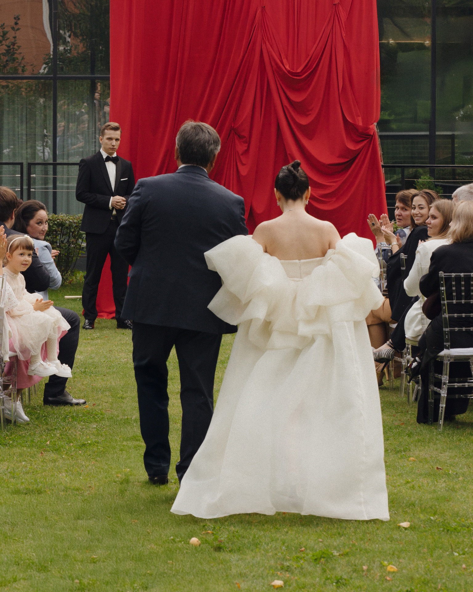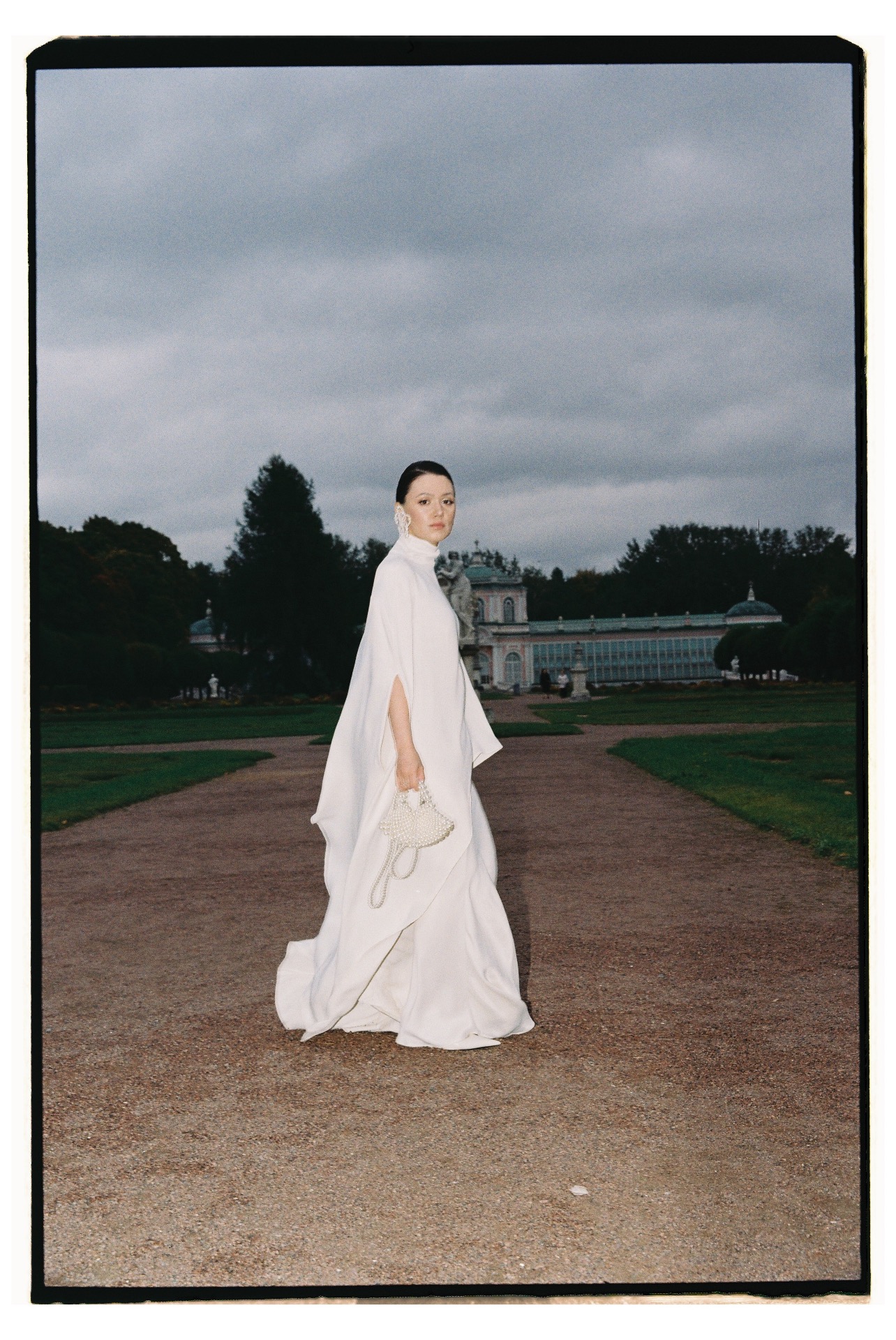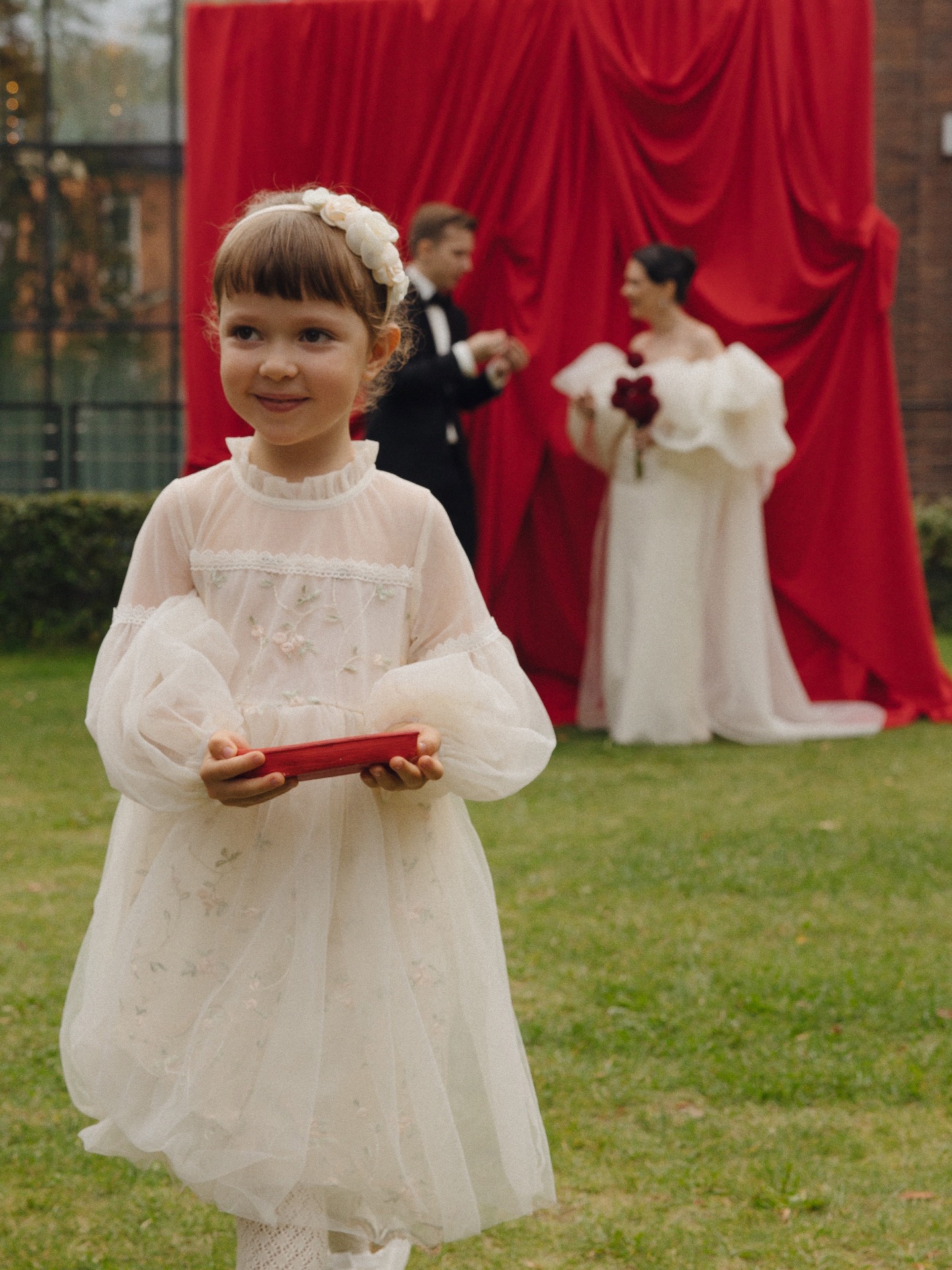 Мой образ сложился так же интуитивно. Я увидела новую коллекцию бренда 1811, поехала примерить платье и накидку, и просто поняла, что это оно. Без бесконечных салонов и мучительного выбора: лёгкость, естественность, немного воздушности – всё, что я хотела передать в этот день.