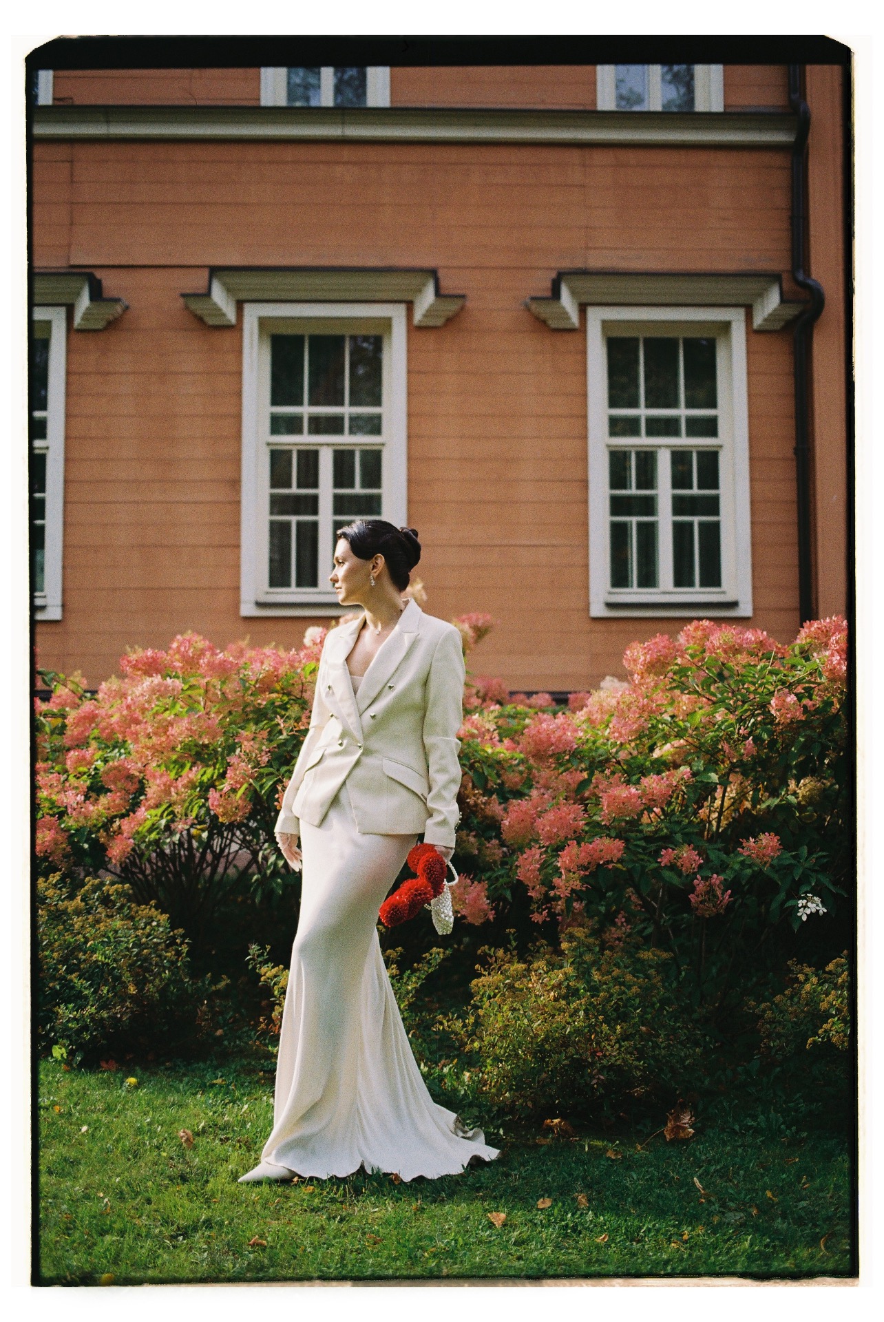 Для велкома я выбрала третий вариант – шёлковую юбку молочного оттенка и жакет из белой экокожи. Я заменила фурнитуру, поставив вместо пуговиц маленькие стальные сердечки – небольшой штрих, но очень важный. Эта деталь была очень про меня.