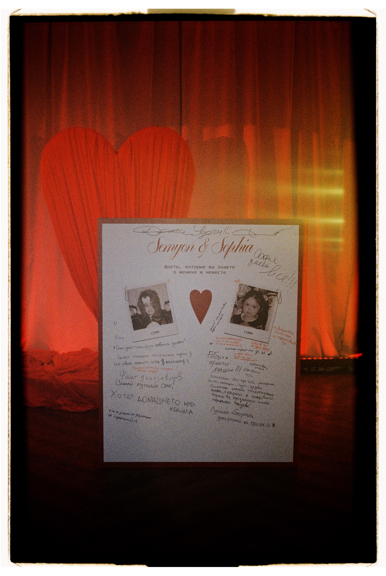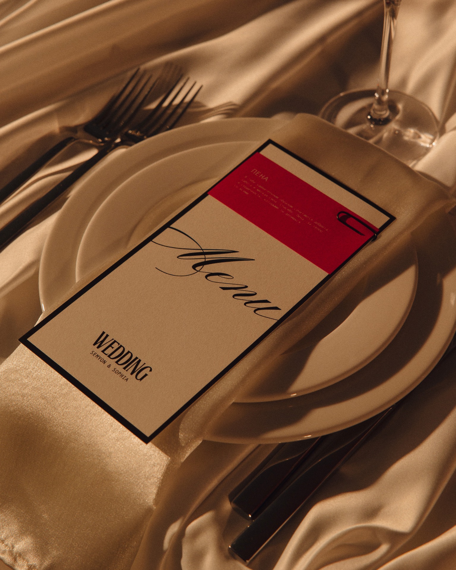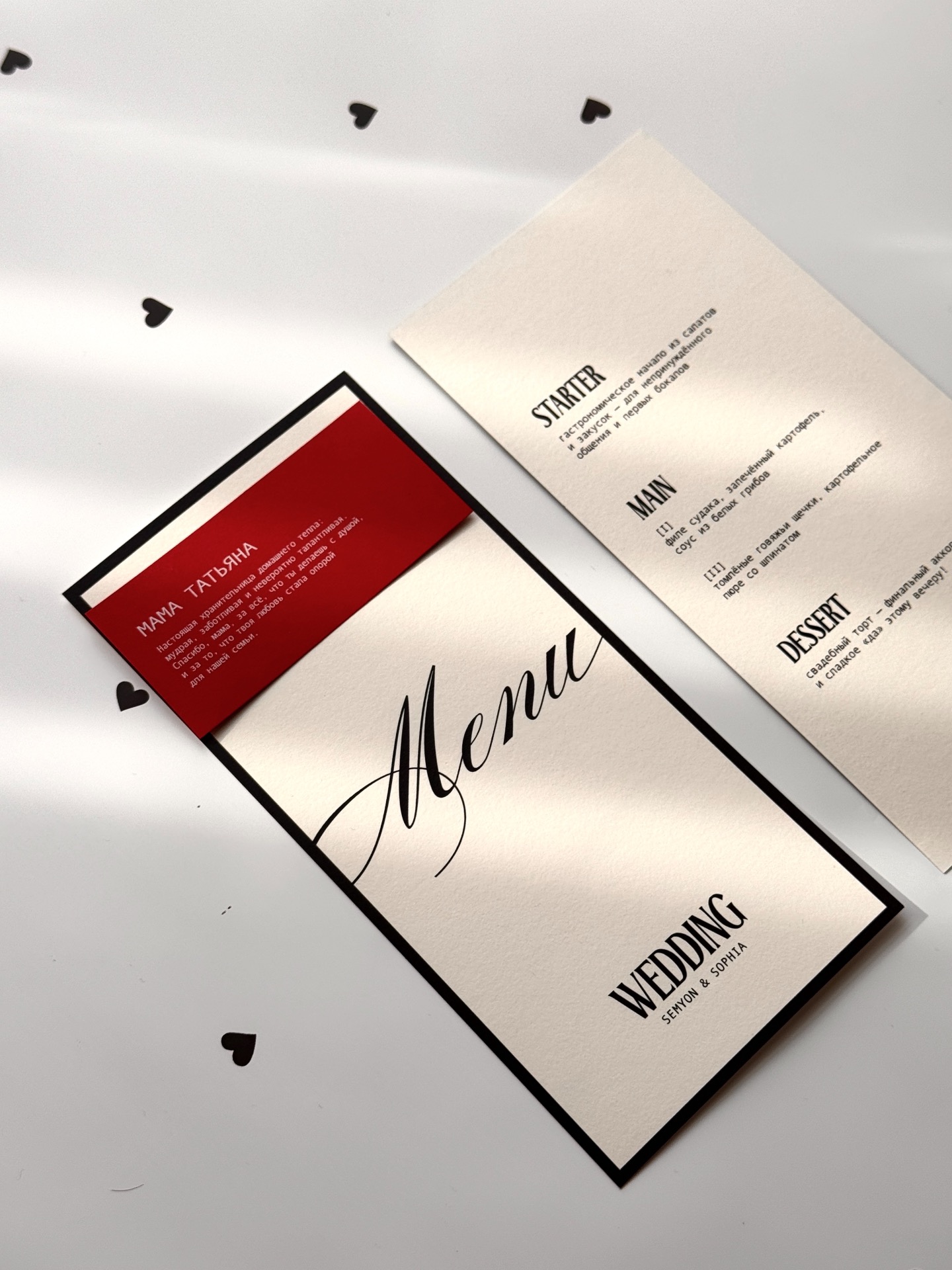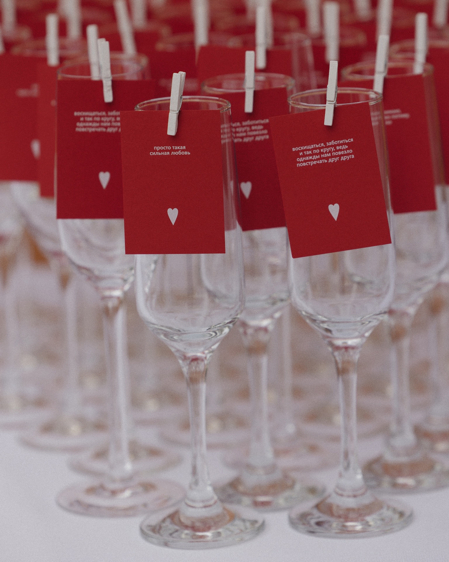 Красный проходил через всё: от флористики до полиграфии. Я — графический дизайнер, поэтому занималась дизайном полиграфии самостоятельно. В том числе я разработала карточки для гостей, на которых мы писали персональные слова благодарности. И это оказалось одной из самых трогательных деталей праздника.