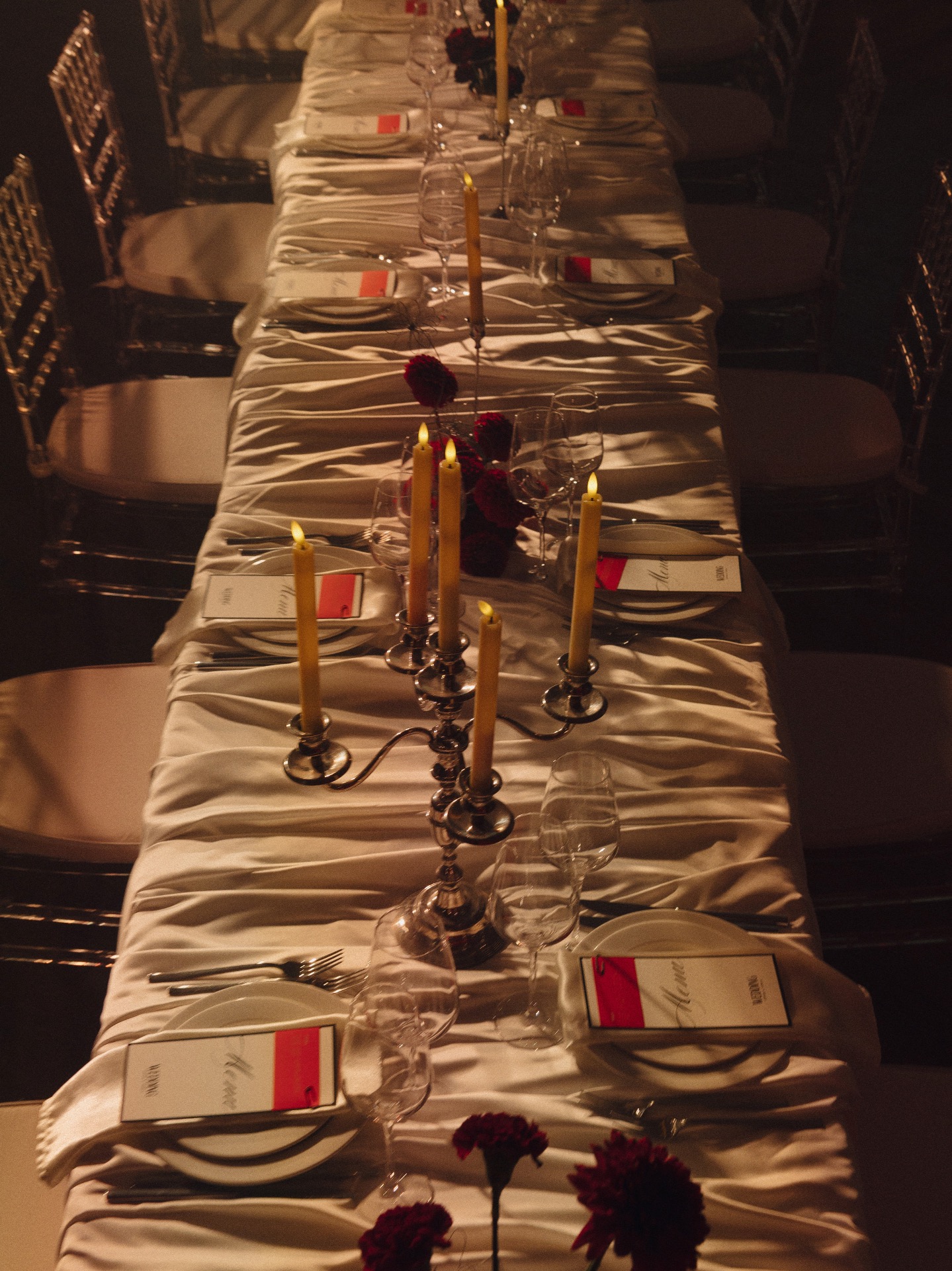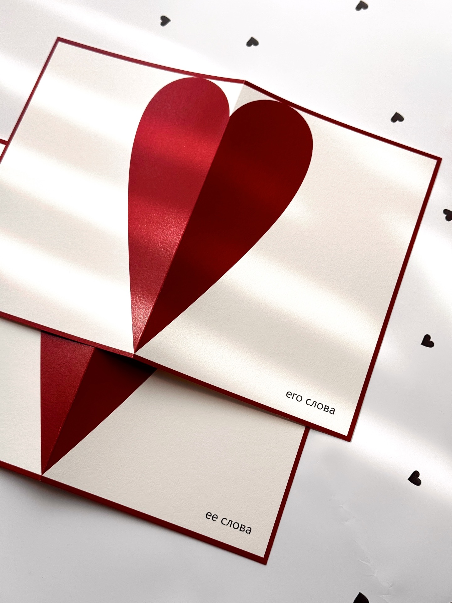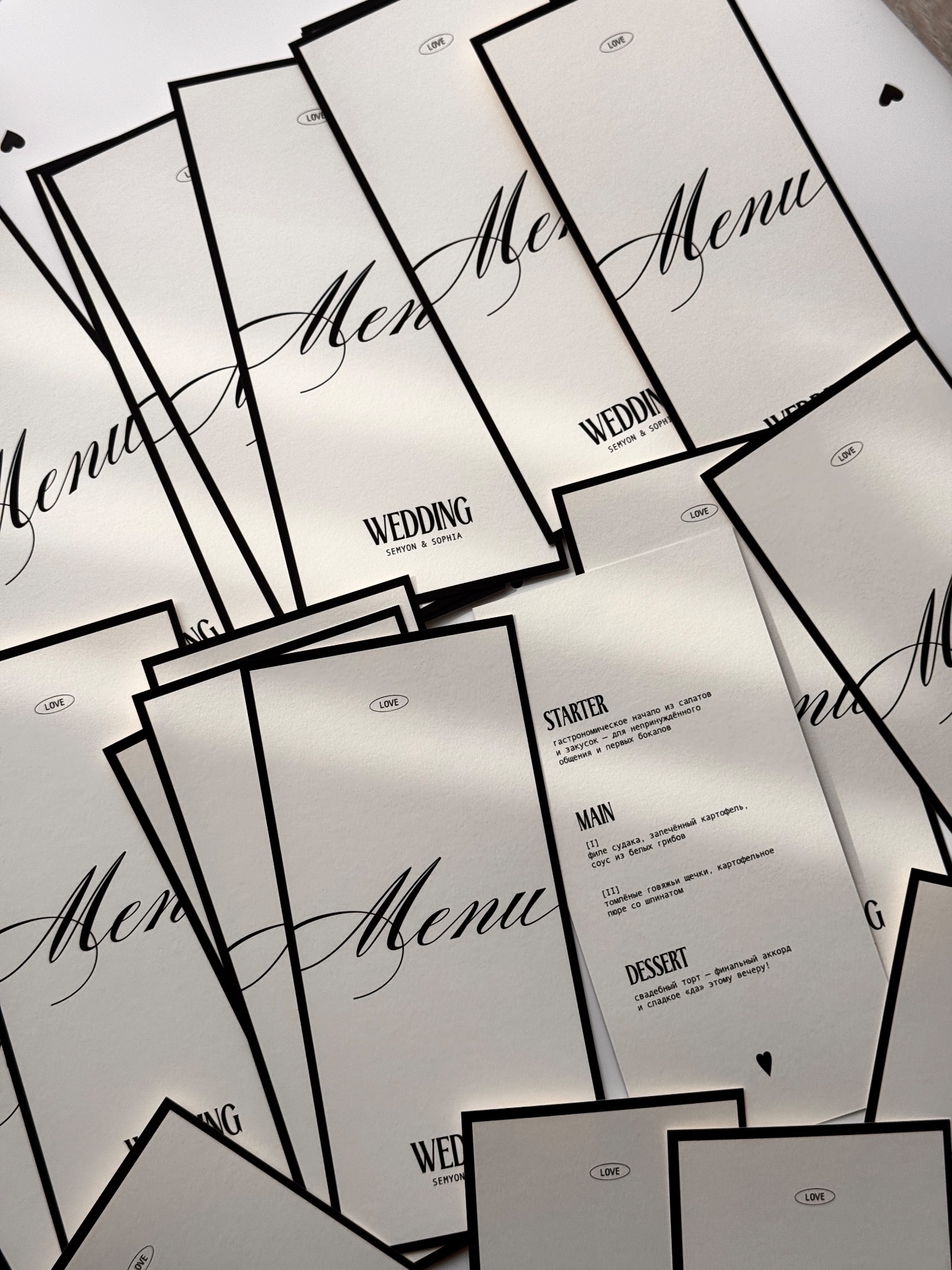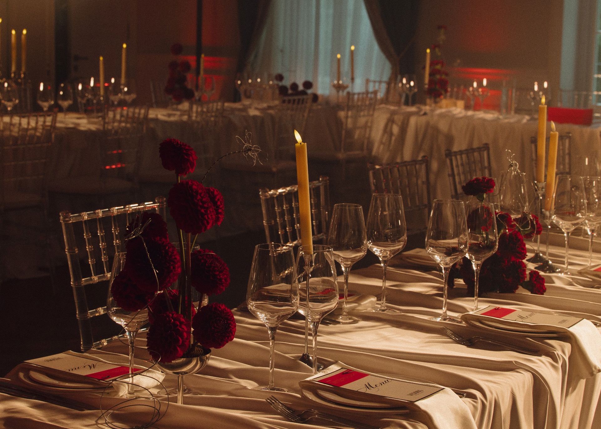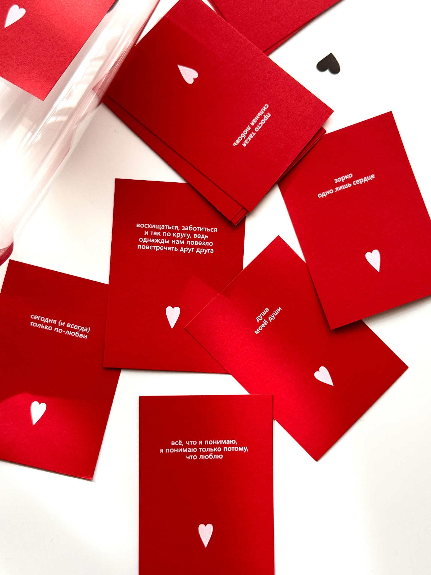 Красный проходил через всё: от флористики до полиграфии. Я — графический дизайнер, поэтому занималась дизайном полиграфии самостоятельно. В том числе я разработала карточки для гостей, на которых мы писали персональные слова благодарности. И это оказалось одной из самых трогательных деталей праздника.