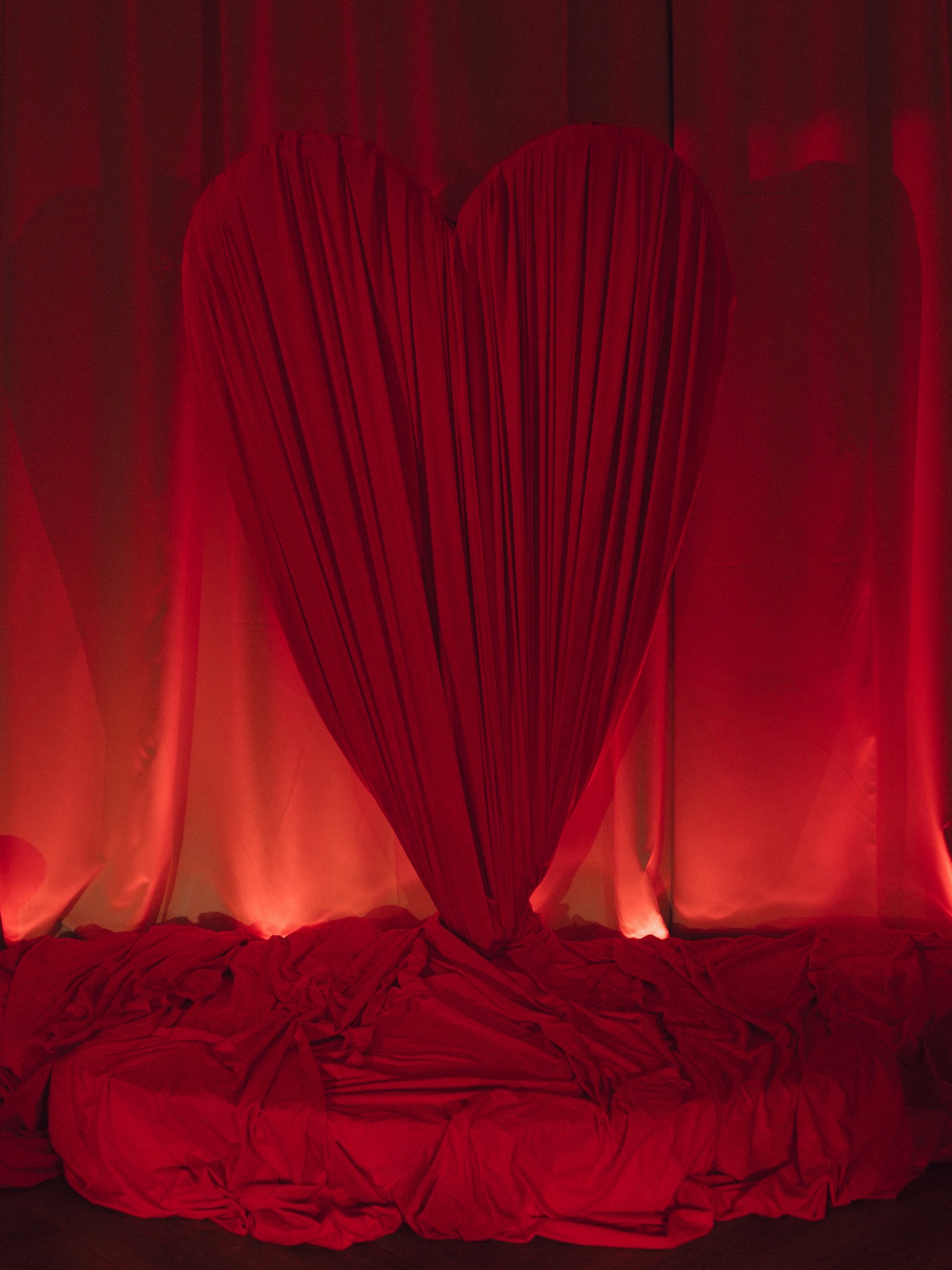 Основой декора, который в общих чертах мы придумали сами, стало вытянутое красное сердце, драпированное тканью – символ живого, пульсирующего чувства.
