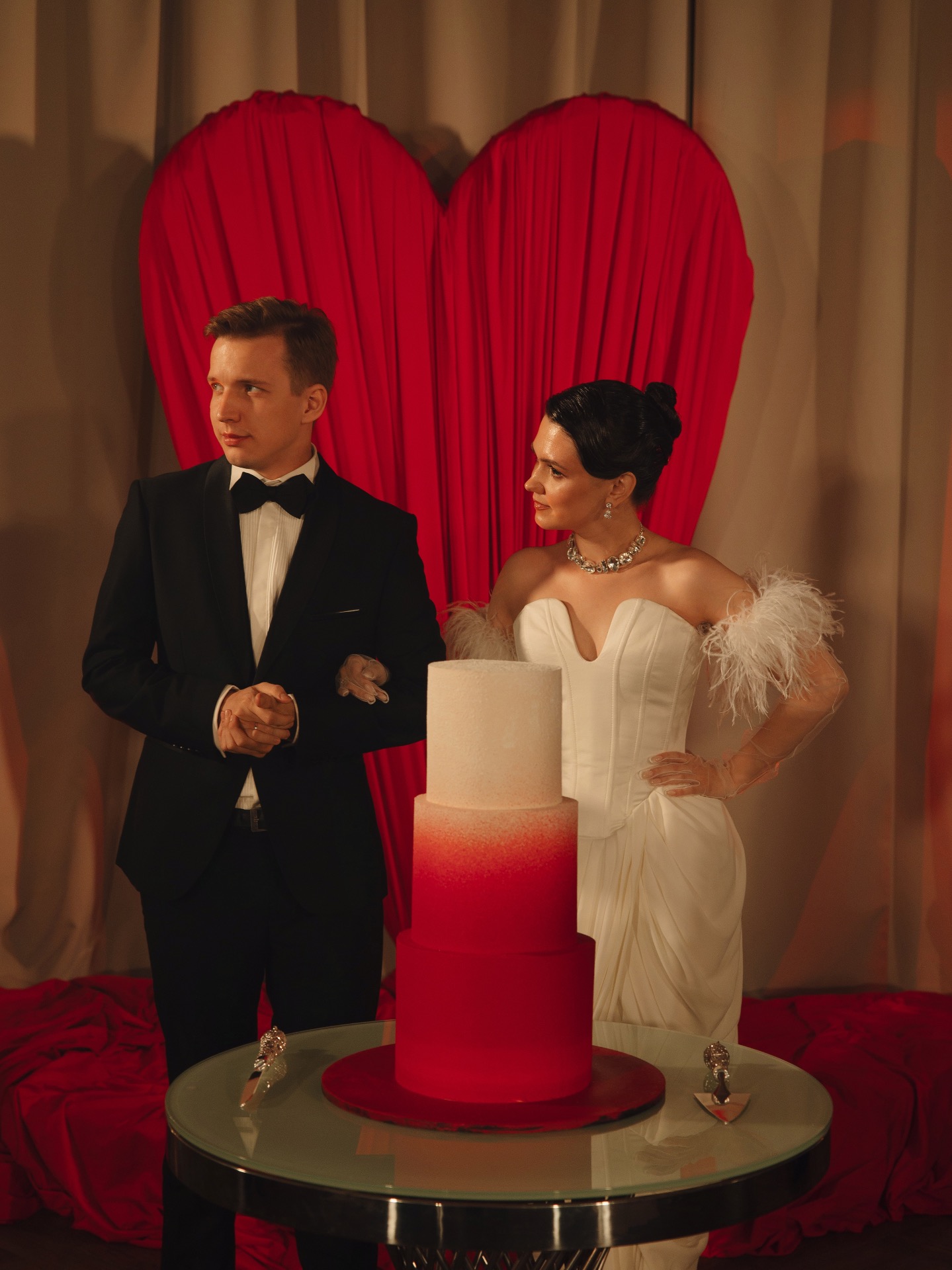 А торт стал финальным аккордом: лаконичным, но со смыслом. Его градиент от насыщенного красного цвета к белому символизировал путь от страсти и влюблённости к спокойной, чистой, зрелой любви.
