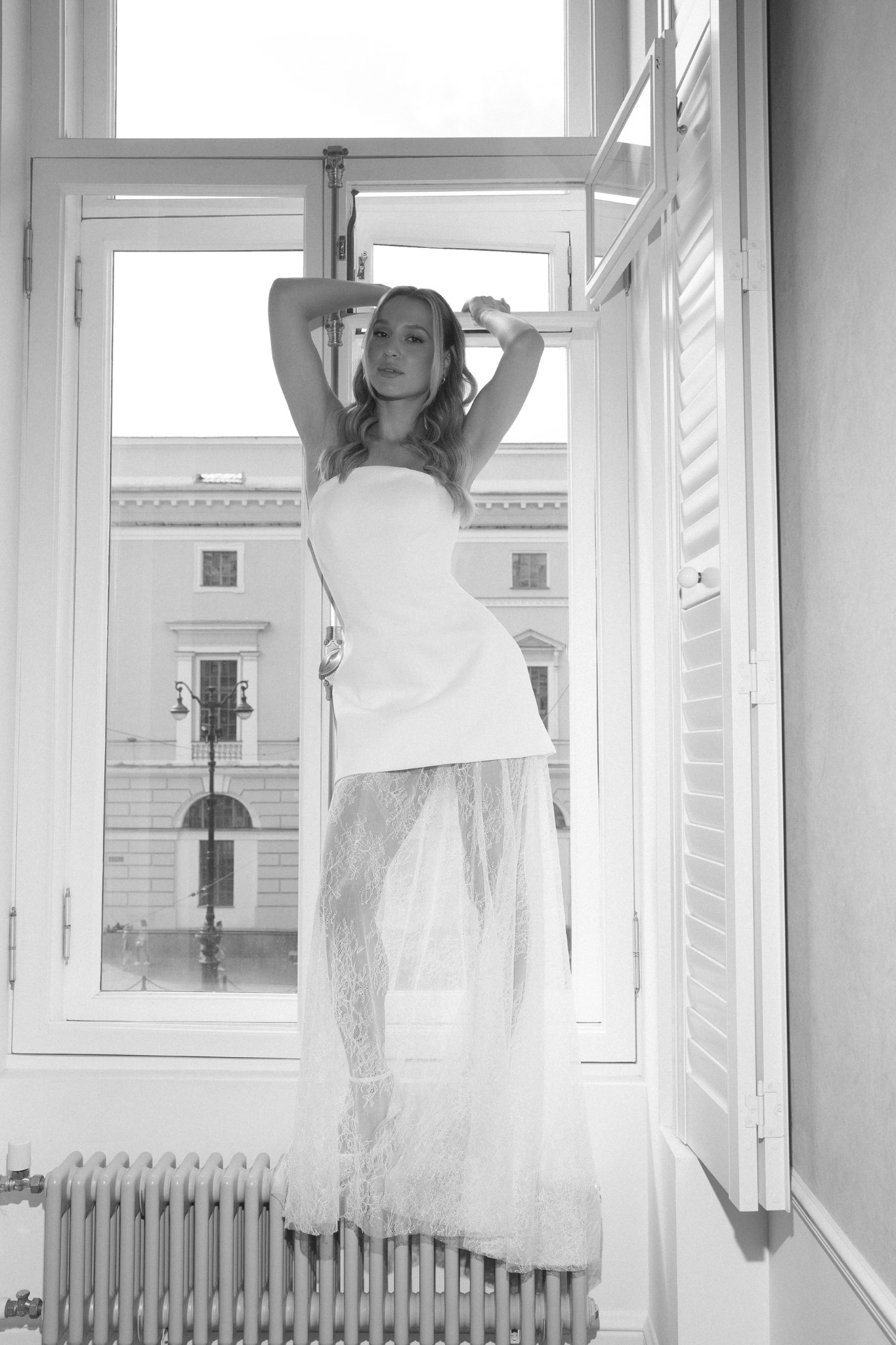 Своё платье я нашла в интернете и сразу влюбилась в него. Оно было в длине мини, сшитое из плотной костюмной ткани, кружевной юбки и шарфа — получилось два полноценных образа. Мой наряд был не только красивым, но и очень удобным. Платье позволило мне свободно гулять по палубе и позировать для фото во время прогулки по городу.