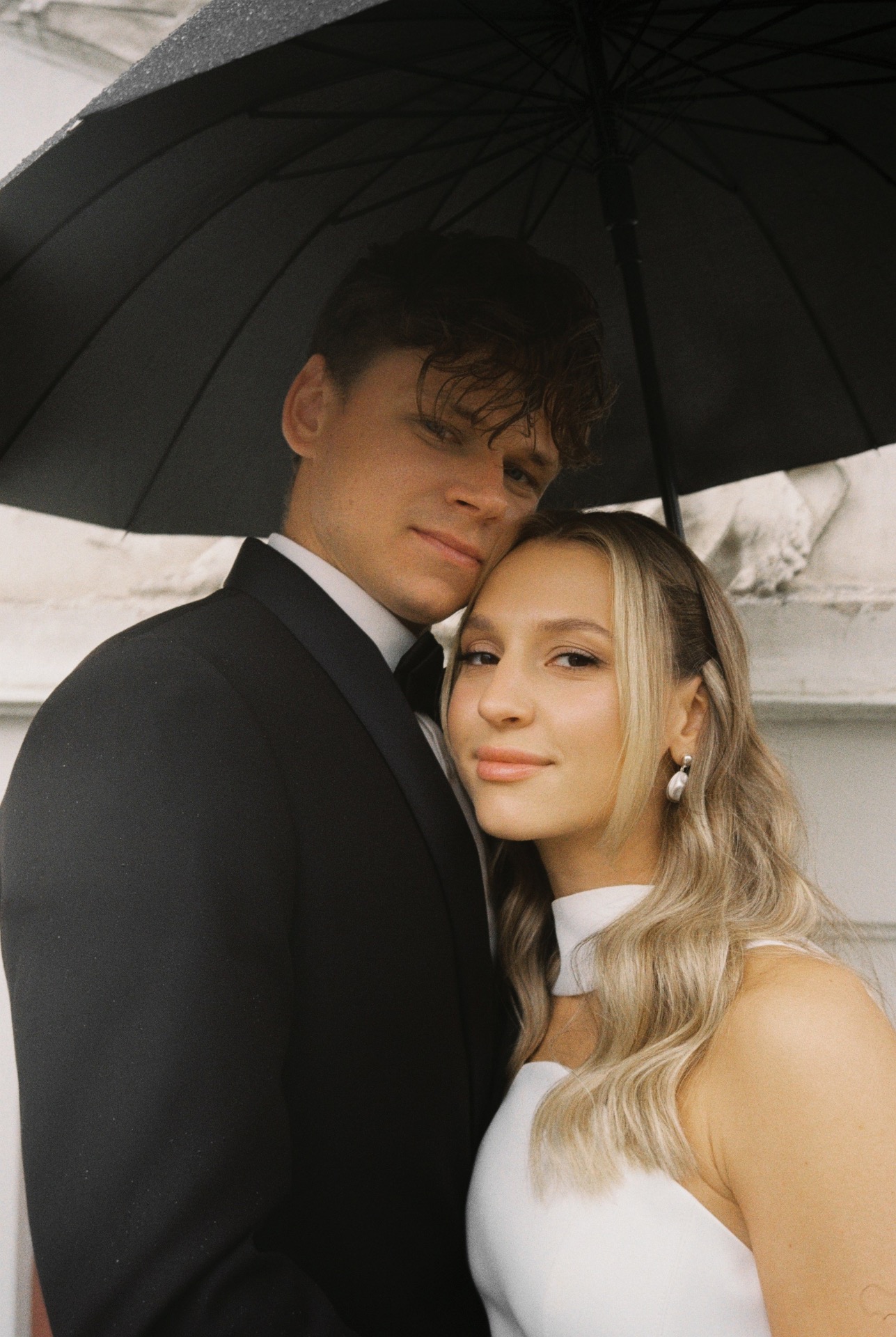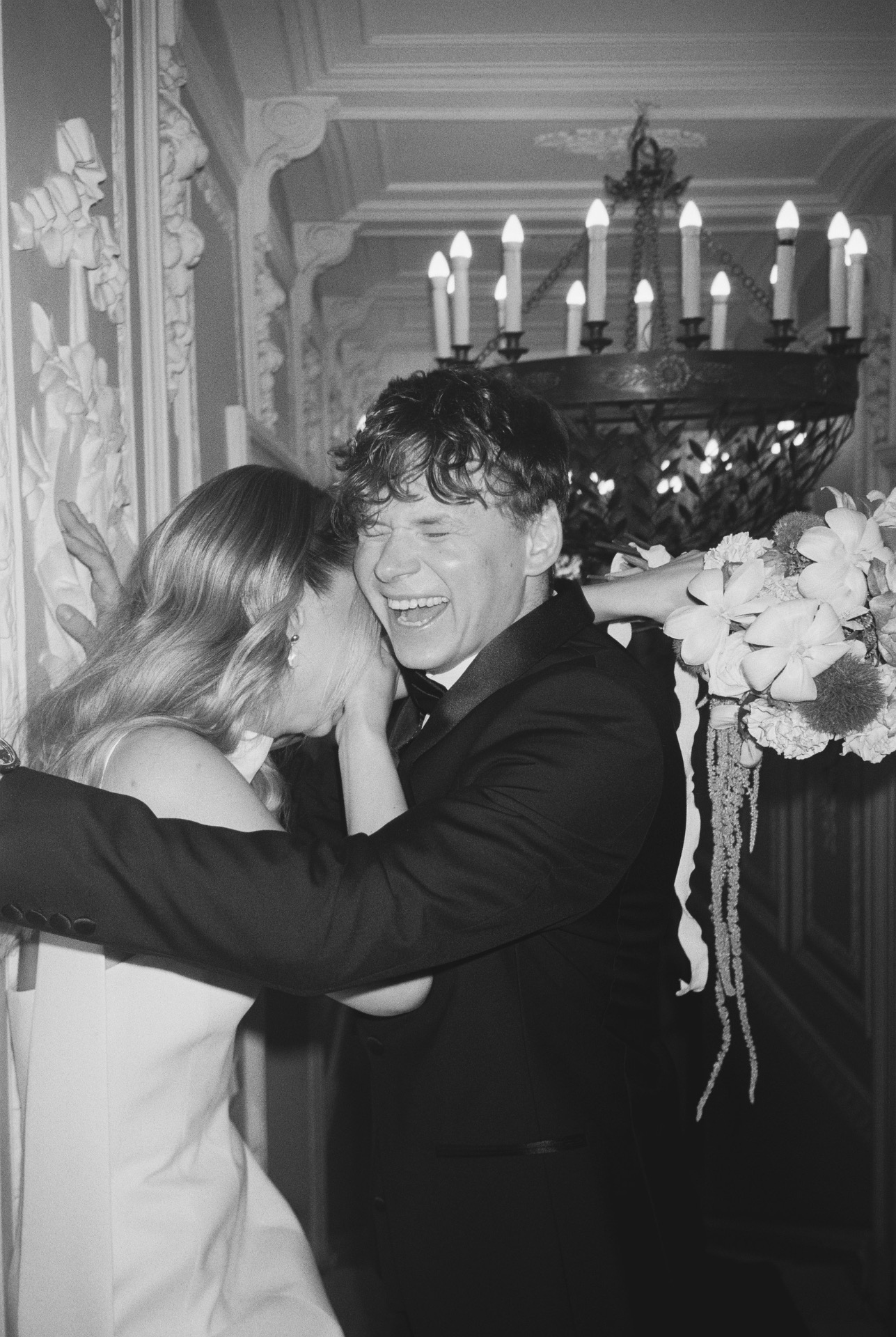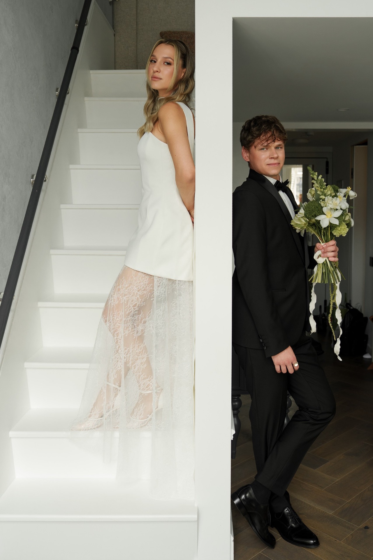 Антон выбрал вечную классику — смокинг с атласными лацканами. А вместо бутоньерки он решил использовать брошь. Эта небольшая деталь добавила изюминку к его образу.