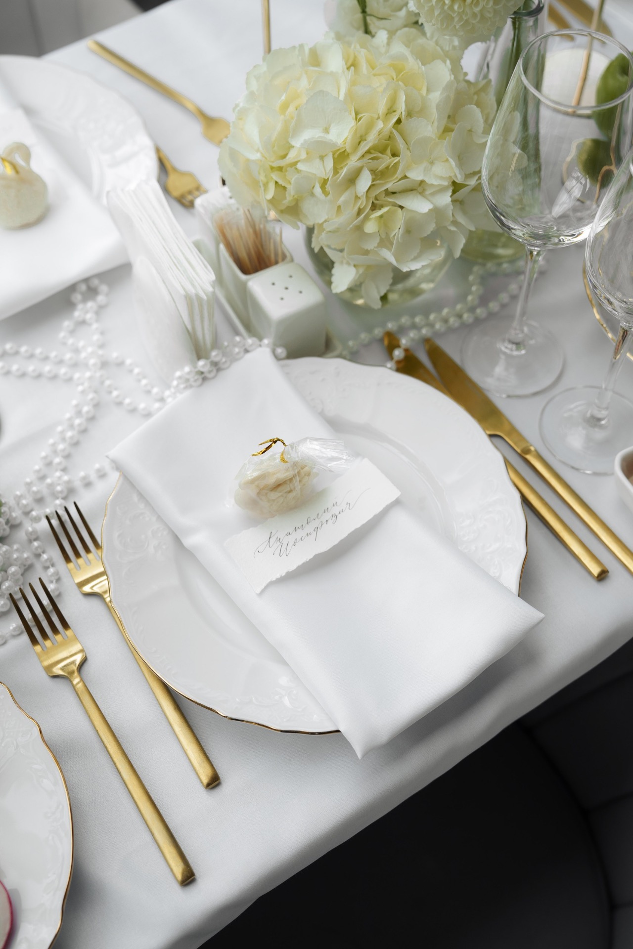Мы организовали всё самостоятельно — нашли площадку, декоратора, продумали концепцию. Я мечтала о свадьбе в классическом стиле с лёгкими трендовыми элементами. Поэтому на нашем празднике появился фуд-декор с жемчужными бусами и свечами на столах гостей. Мы решили отказаться от президиума и сделали общий стол для того, чтобы подчеркнуть дух единства. А палитру праздника нам подсказали наши с Антоном любимые цвета — белый и зелёный.