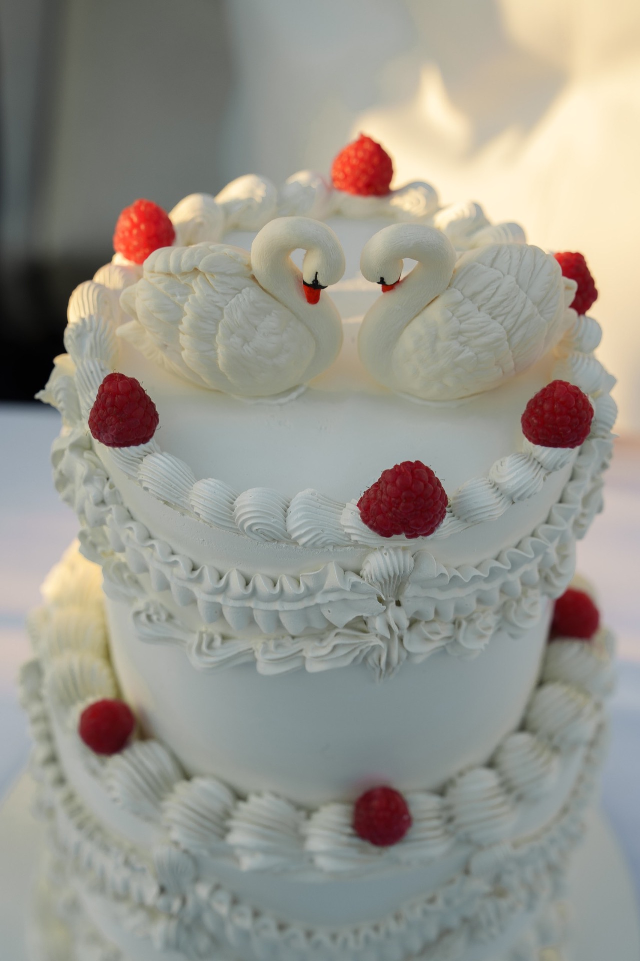 Я точно знала, что хочу торт в стиле ламбет, украшенный двумя ретро-лебедями. Позже из этой задумки родилась идея подарков для гостей. Всем приглашённым мы подготовили свечи в форме лебедей на память о нашем празднике.