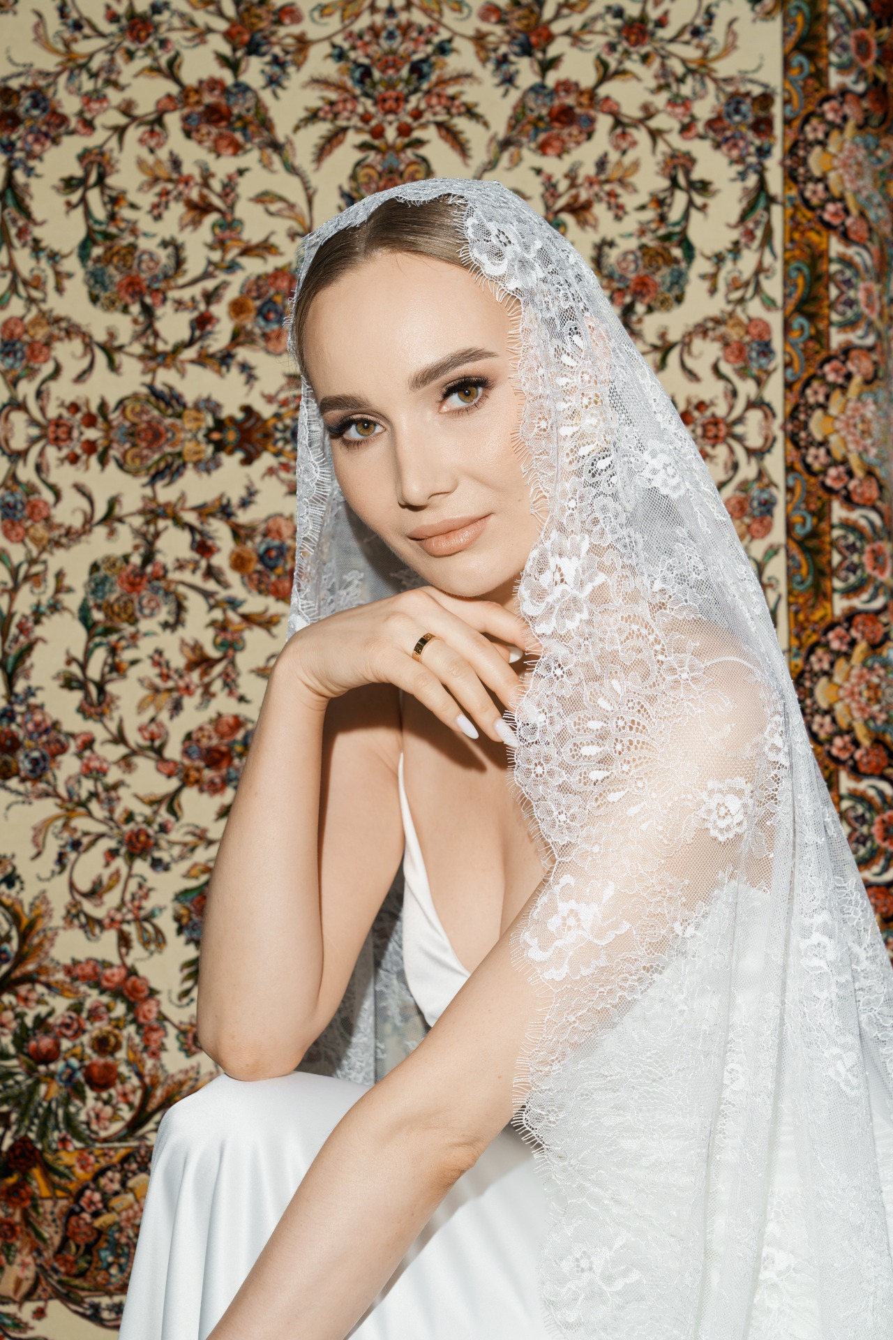 На утреннюю съёмку я выбрала кружевной костюм — невесомый, как облако. Акцентом стали золотые украшения: серьги в виде ракушек и браслет-змейка. Максим был в расслабленном комплекте в пижамном стиле — лёгком и уютном.